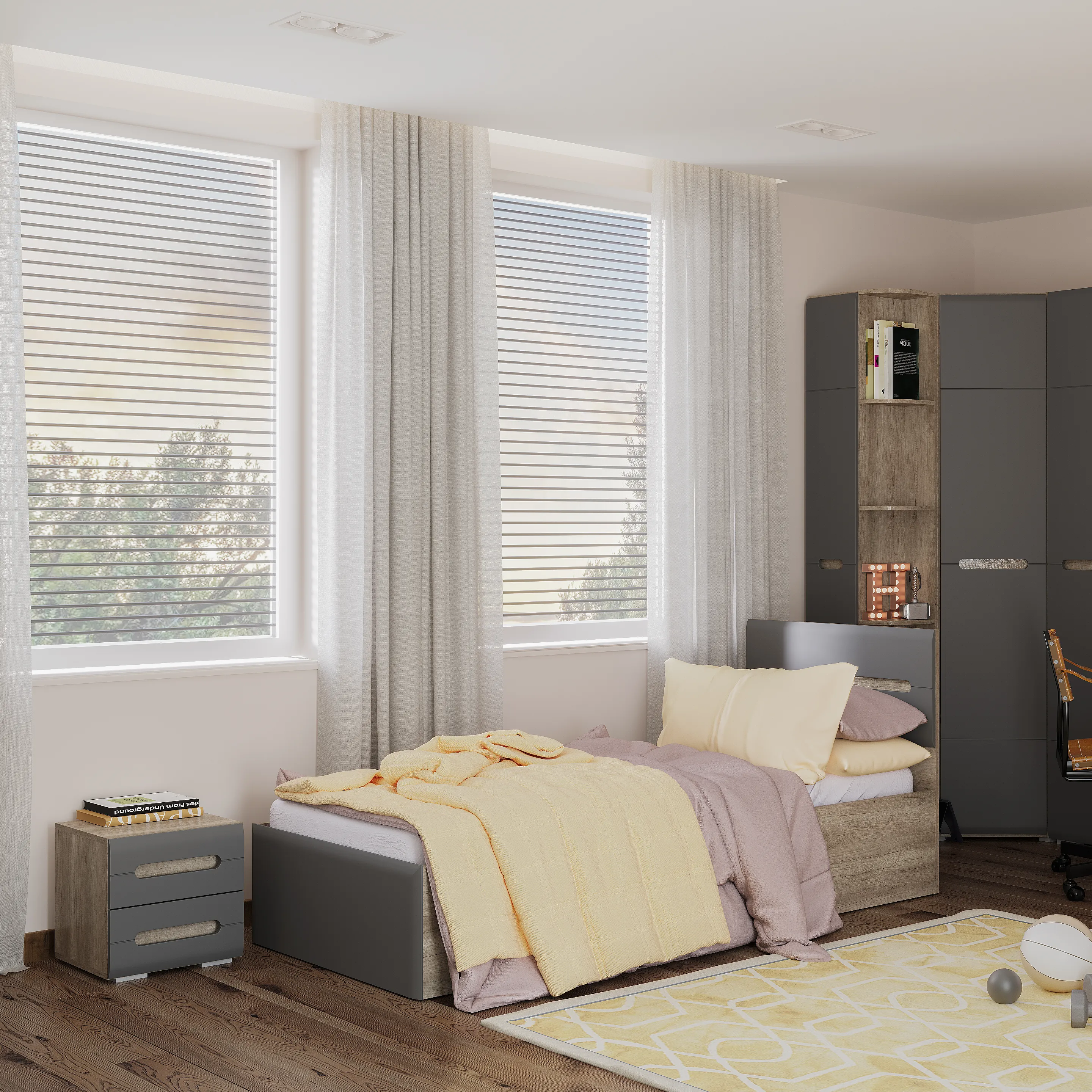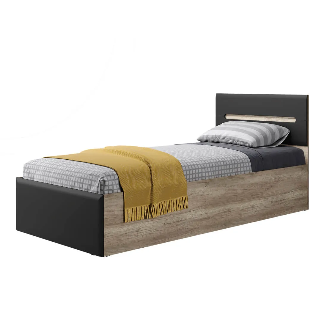 Стильная односпальная кровать "Наоми" – это прекрасный выбор для комнаты школьника или подростка. Выполненная из ЛДСП и МДФ цвета "графит" и "дуб каньон", она будет отлично смотреться в интерьере любого стиля.
