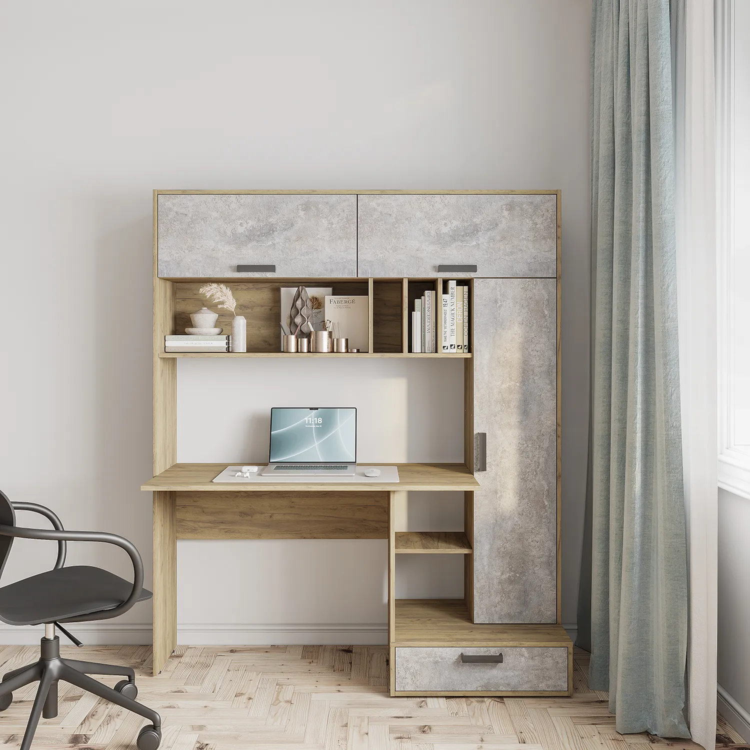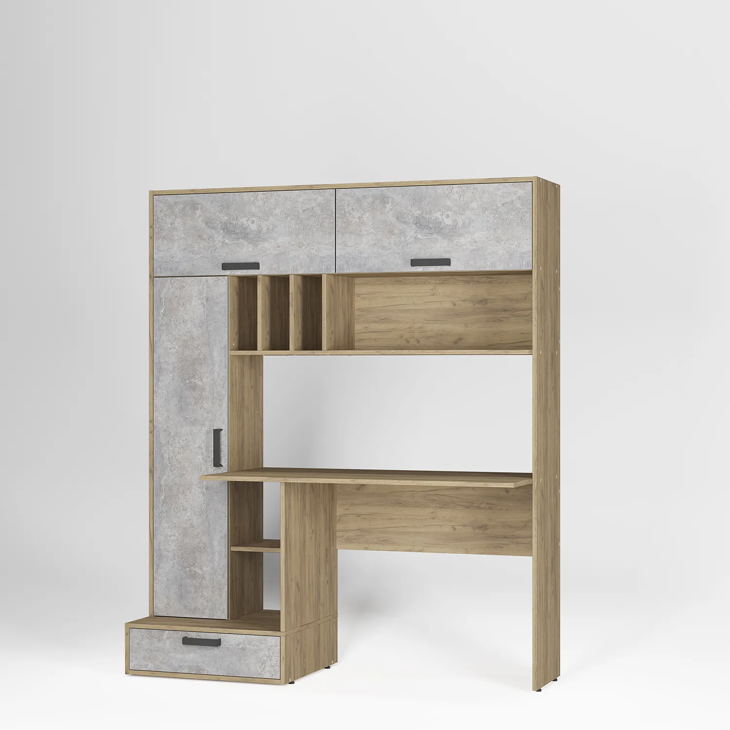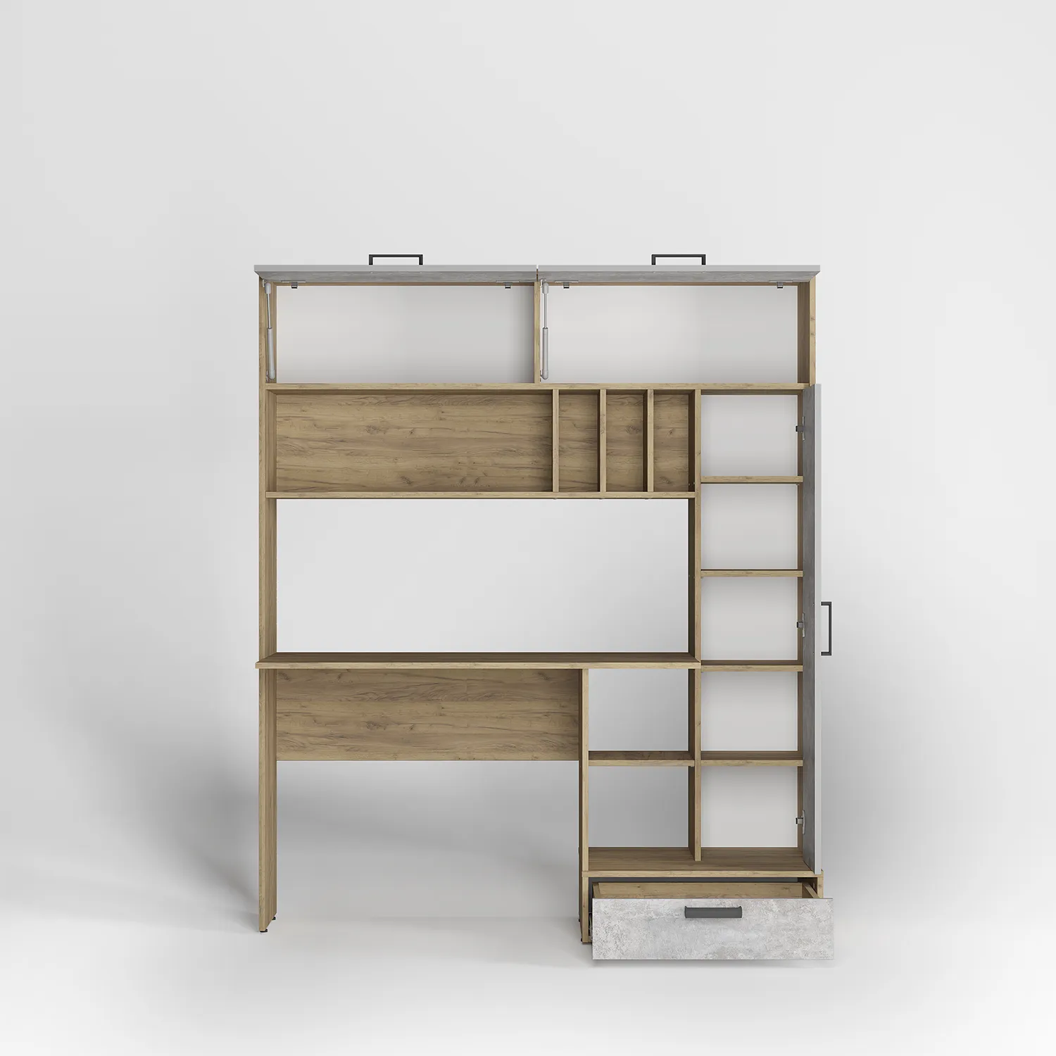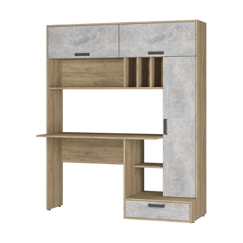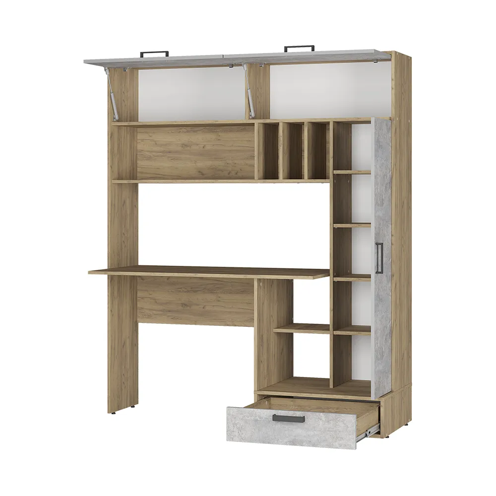 Письменный стол "Техно" – не просто стол, это готовое решение для организации рабочего пространства. В комплектацию входит столешница, верхние и боковые ниши, спрятанные за дверцы, нижний выдвижной ящик и открытые полки. Разместить необходимые предметы, включая технику, не составит труда. Цветовое решение позволит модели вписаться в современный интерьер, особенно в стиле "лофт".