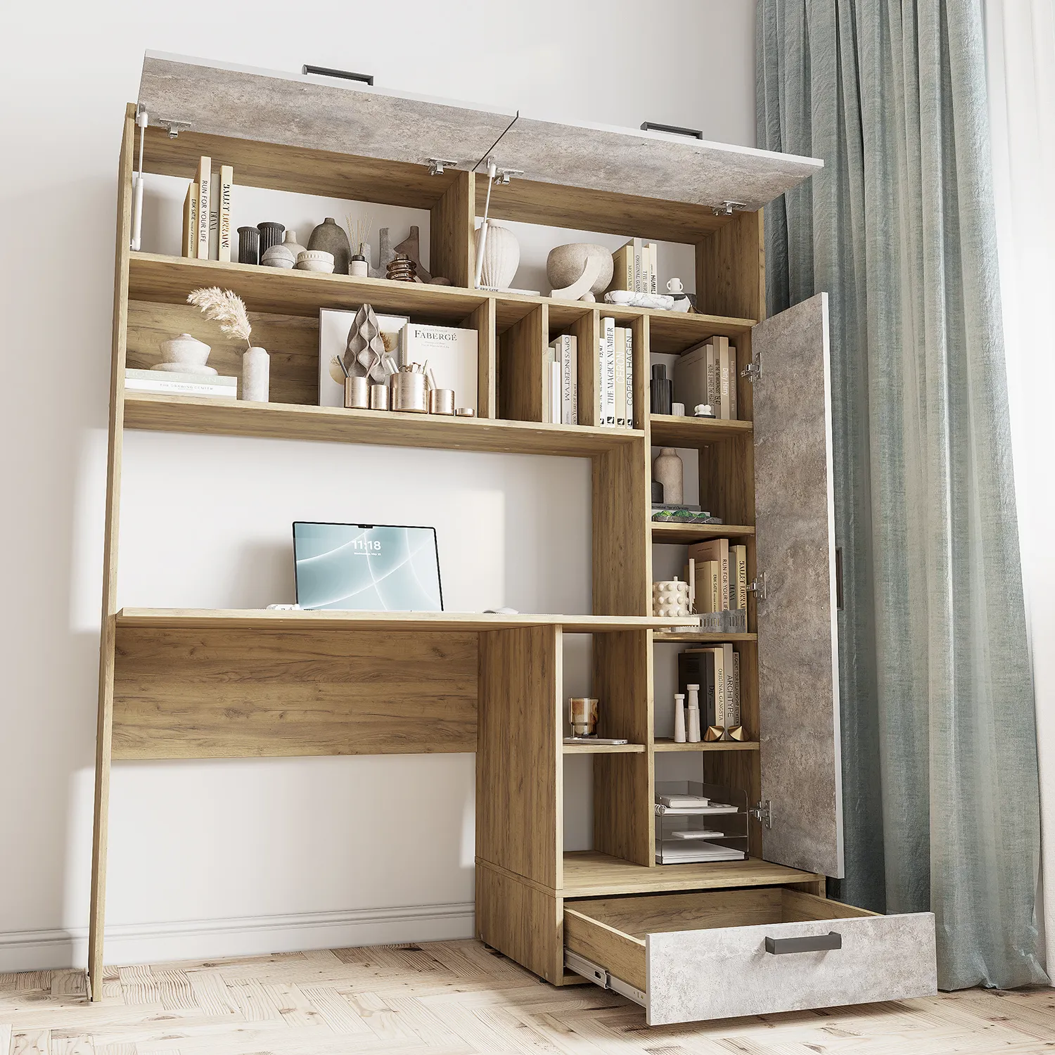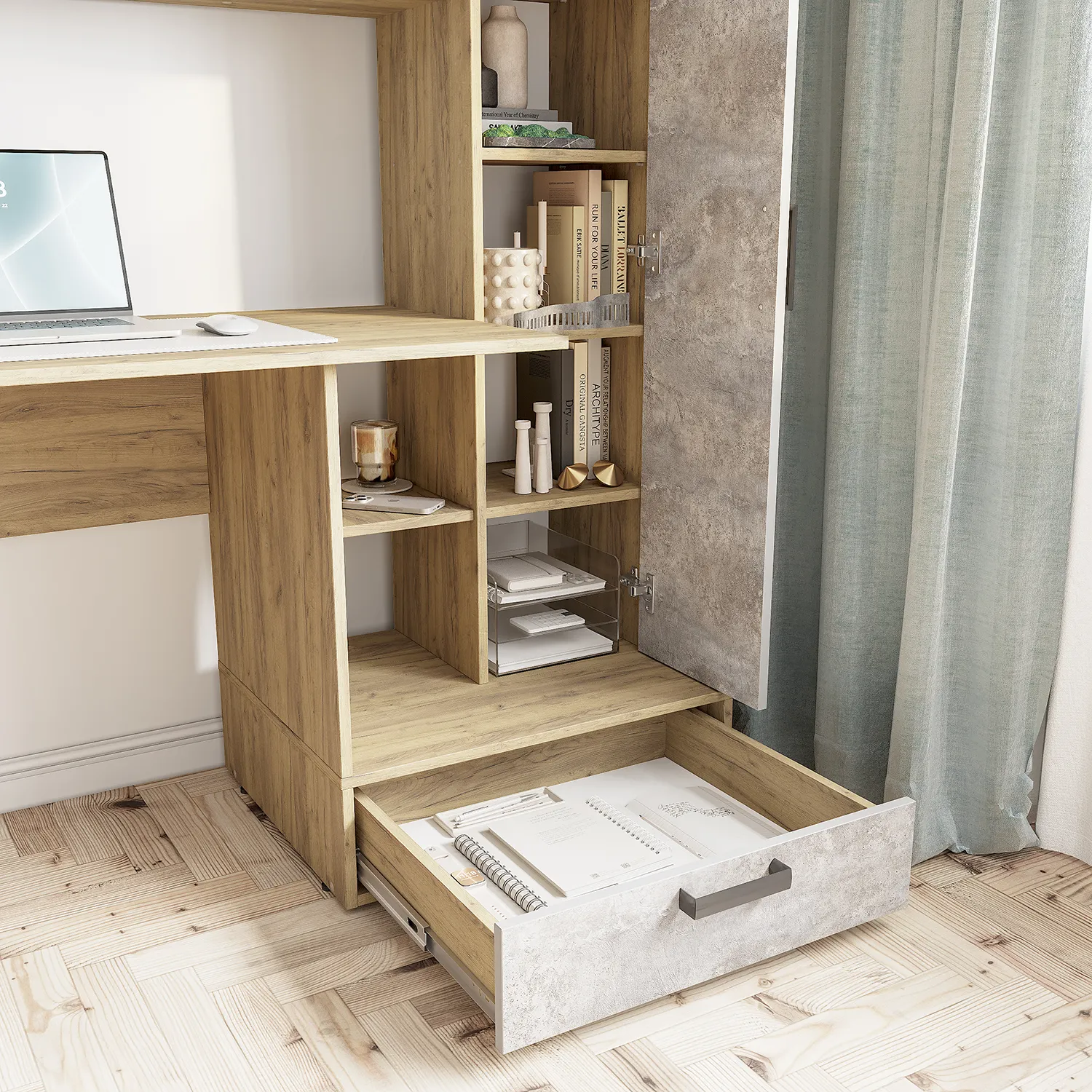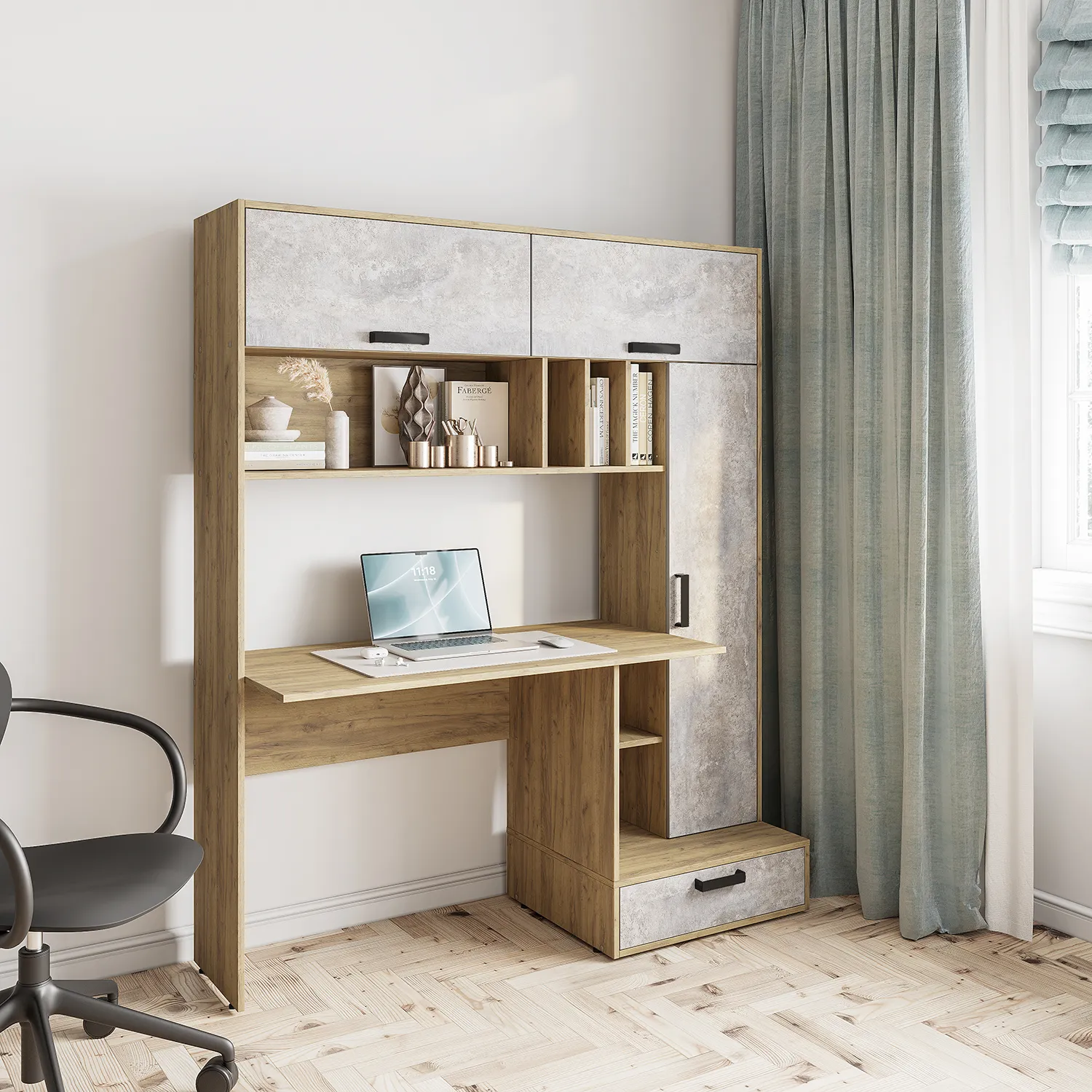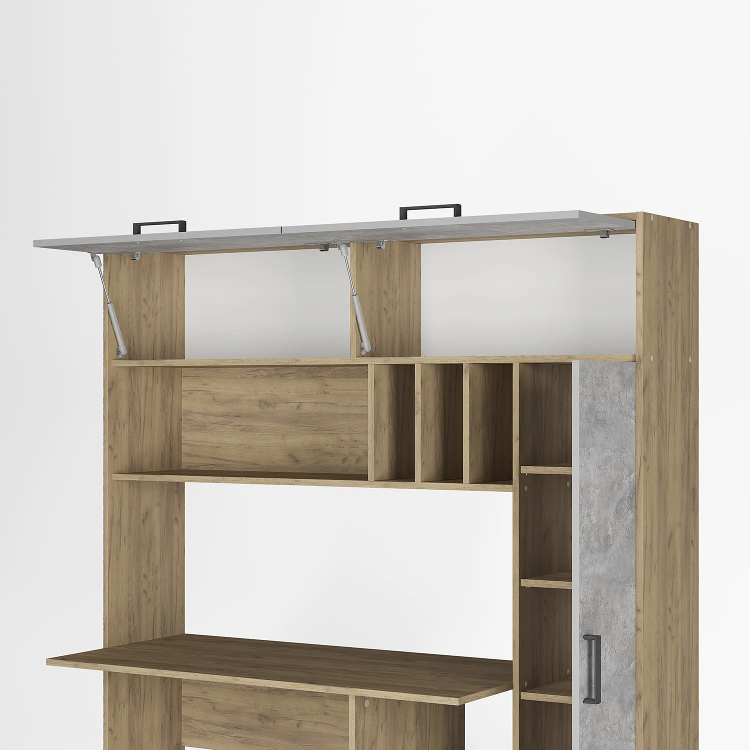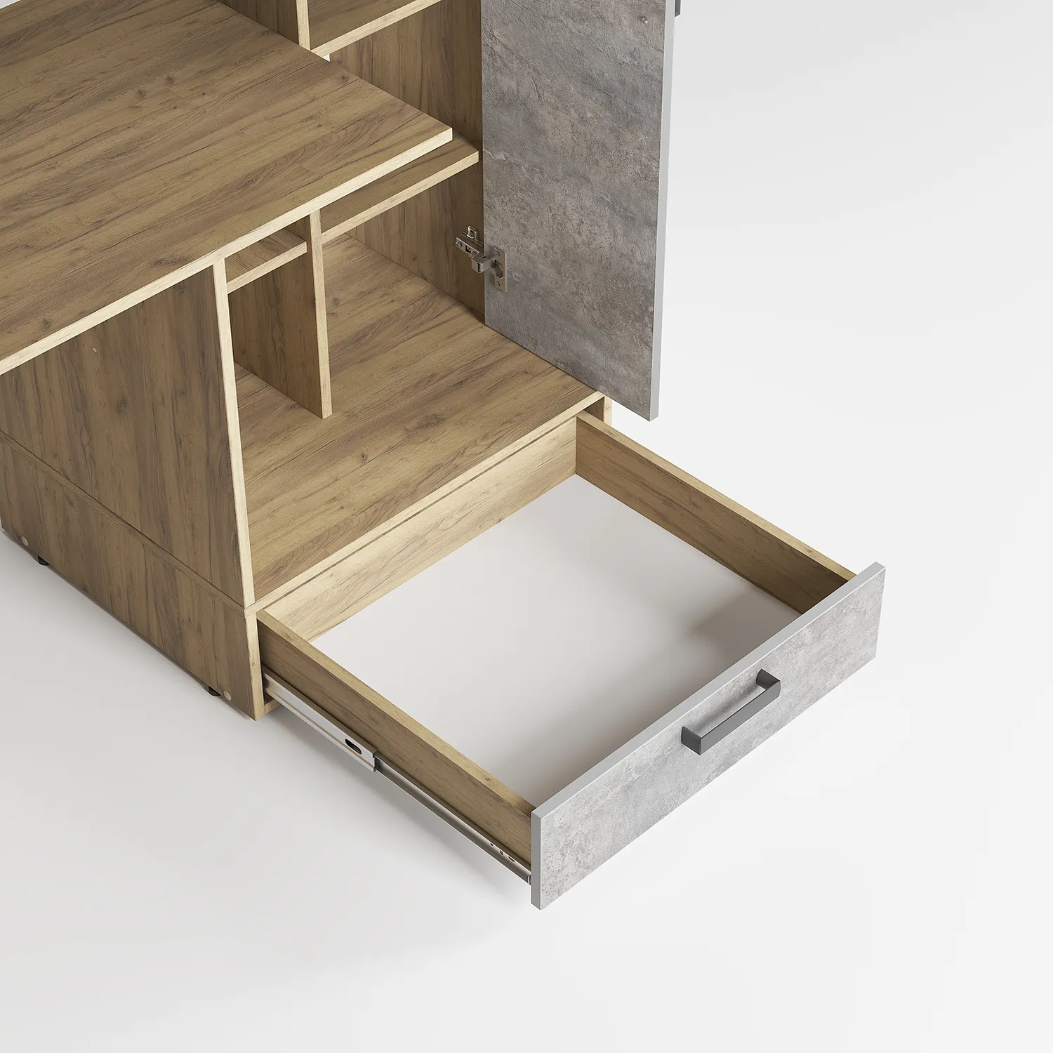 Письменный стол "Техно" – не просто стол, это готовое решение для организации рабочего пространства. В комплектацию входит столешница, верхние и боковые ниши, спрятанные за дверцы, нижний выдвижной ящик и открытые полки. Разместить необходимые предметы, включая технику, не составит труда. Цветовое решение позволит модели вписаться в современный интерьер, особенно в стиле "лофт".