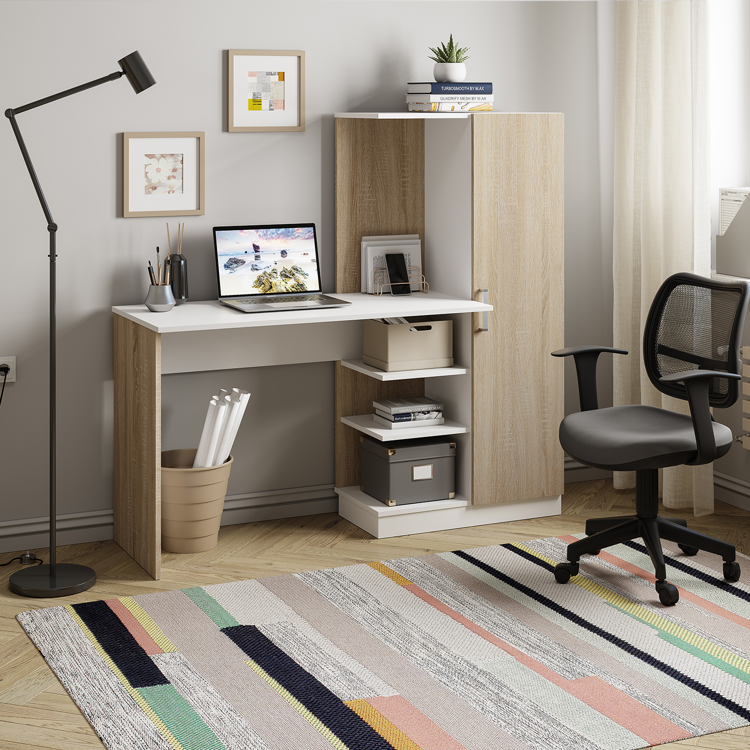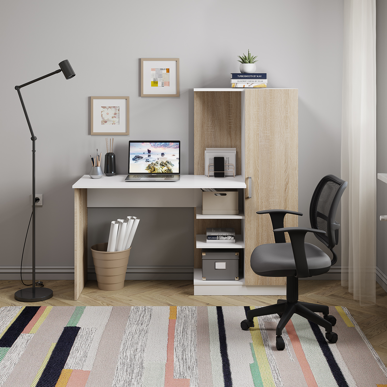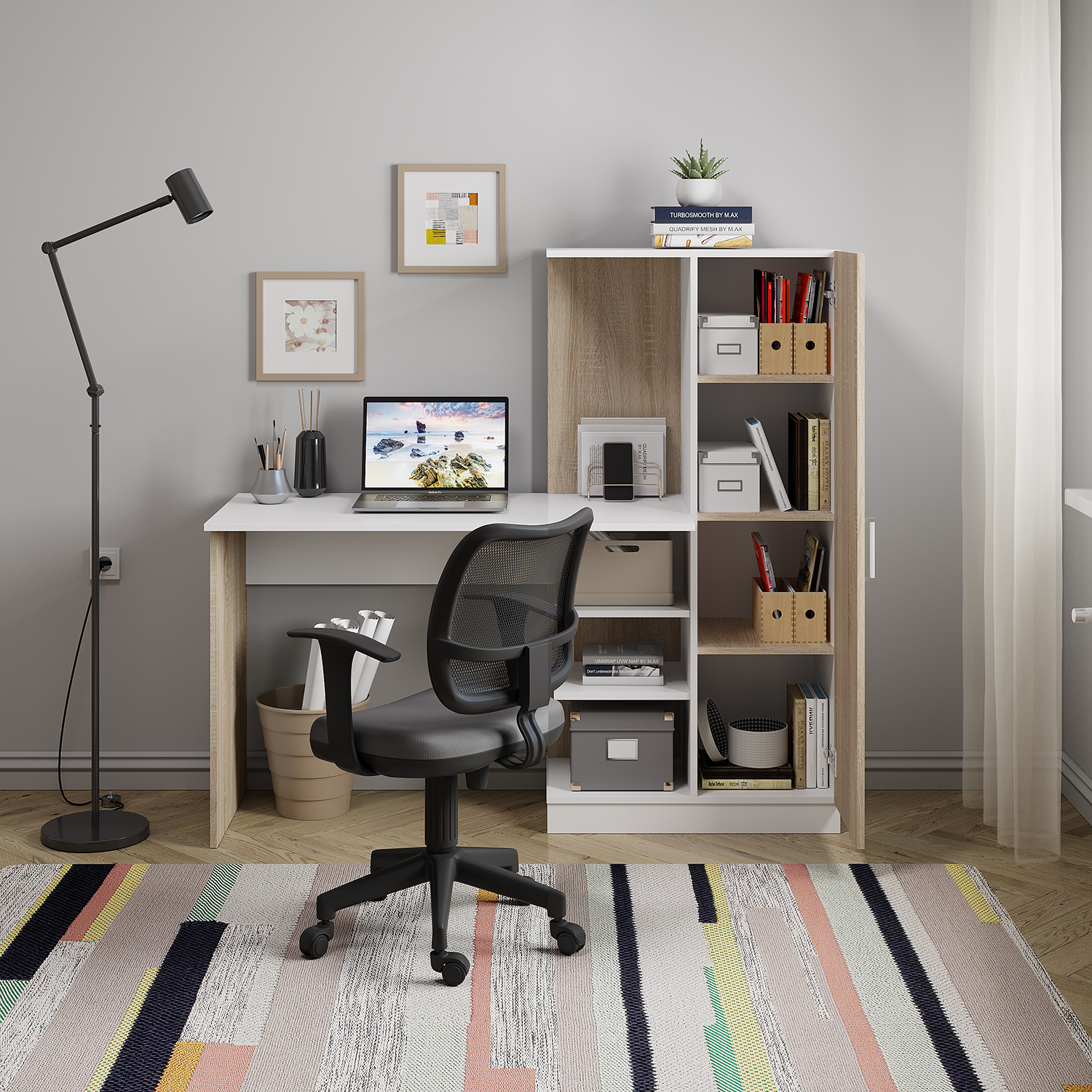 Обустроить место для работы или учебы можно с помощью компьютерного стола "Бейсик". Модель сделана из ЛДСП двух цветов, благодаря такому цветовому решению, изделие будет выигрышно смотреться в любом интерьере. Конструкция модели представляет собой вместительную столешницу, зону с открытыми полками, небольшой пенал с распашной дверцей, в котором можно хранить необходимые для занятий вещи.