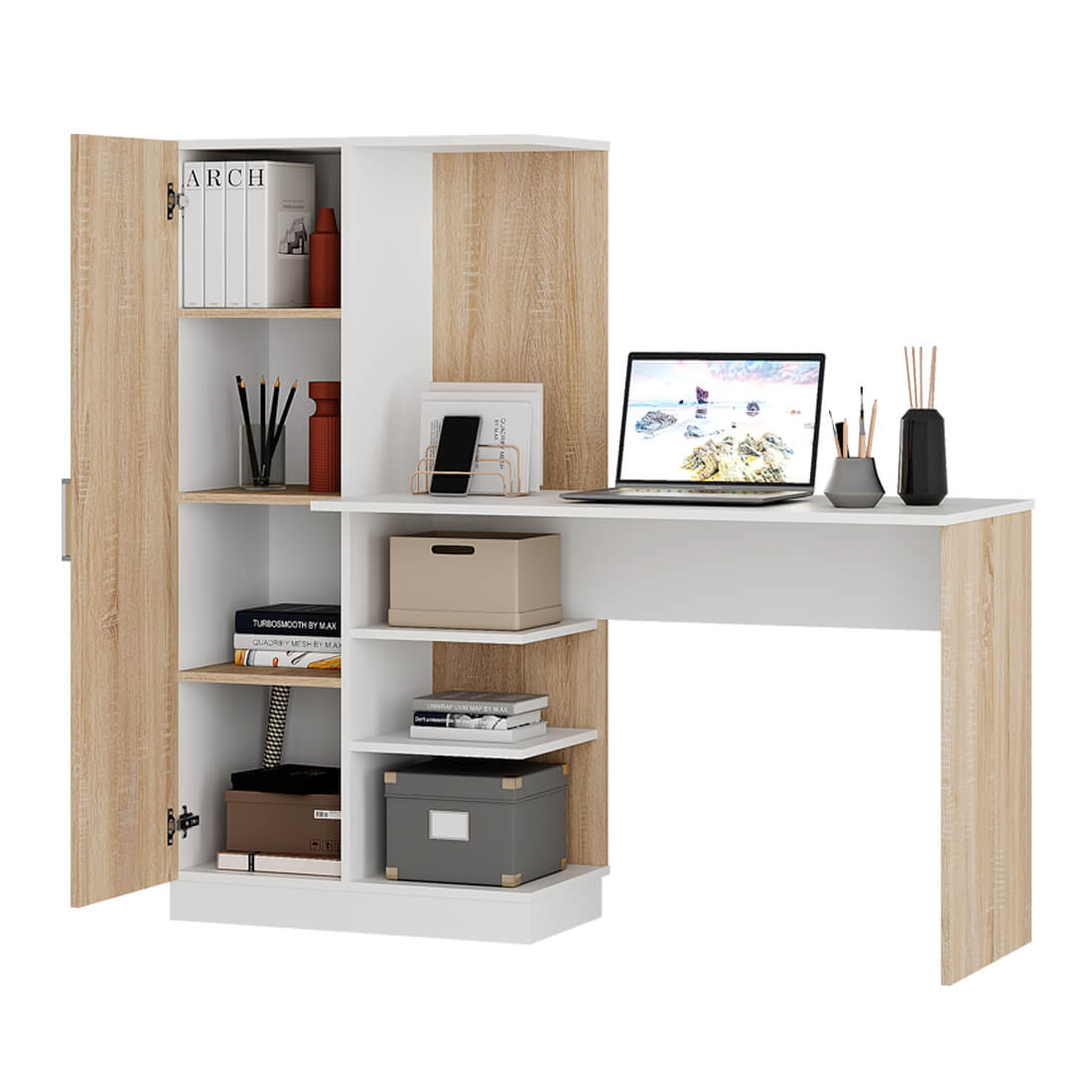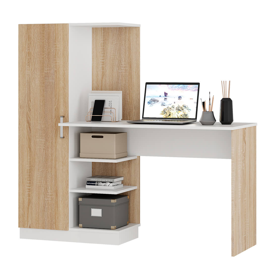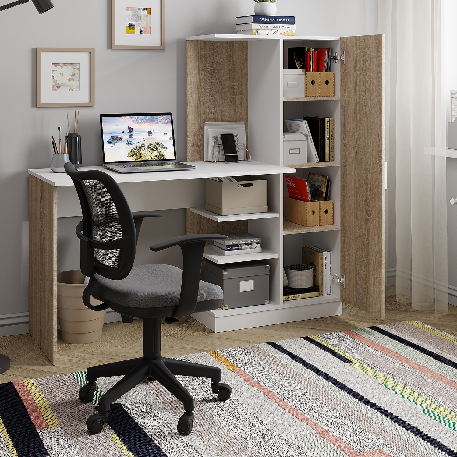 Обустроить место для работы или учебы можно с помощью компьютерного стола "Бейсик". Модель сделана из ЛДСП двух цветов, благодаря такому цветовому решению, изделие будет выигрышно смотреться в любом интерьере. Конструкция модели представляет собой вместительную столешницу, зону с открытыми полками, небольшой пенал с распашной дверцей, в котором можно хранить необходимые для занятий вещи.