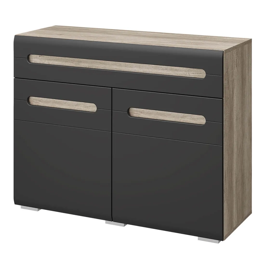 Тумба "Наоми" может использоваться в любой комнате вашей квартиры или дома. Модель оснащена одним выдвижным ящиком и двумя распашными дверцами, за которыми находятся полки для хранения. Изделие имеет характерную для коллекции "Наоми" отделку: корпус выполнен из ЛДСП в цвете "дуб каньон", а фасады грифельного оттенка имеют интегрированные ручки.