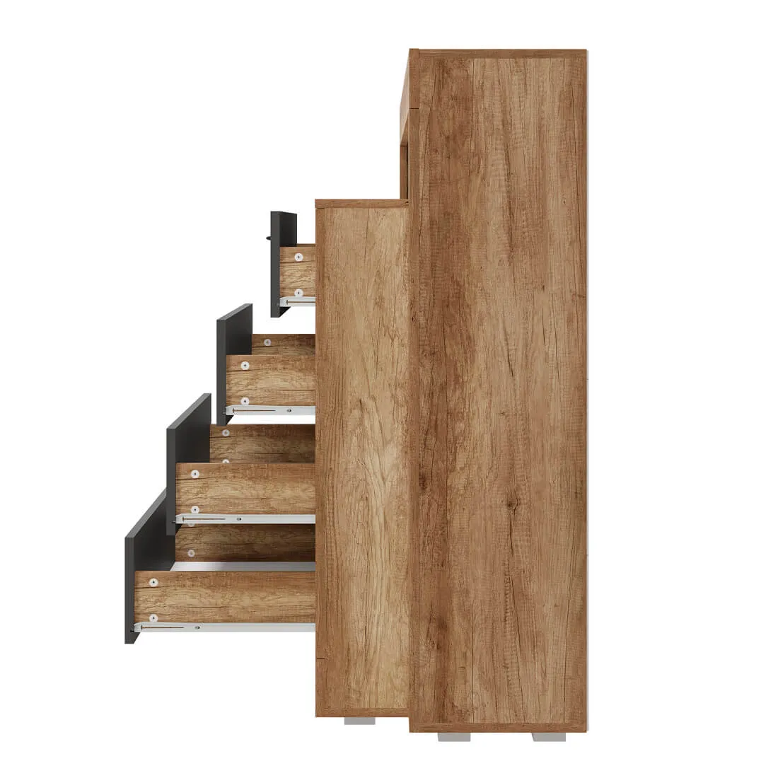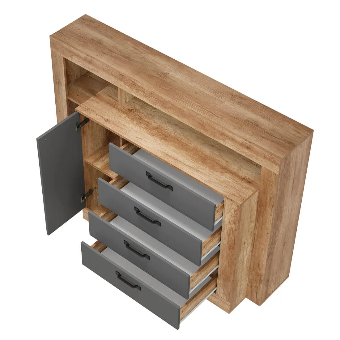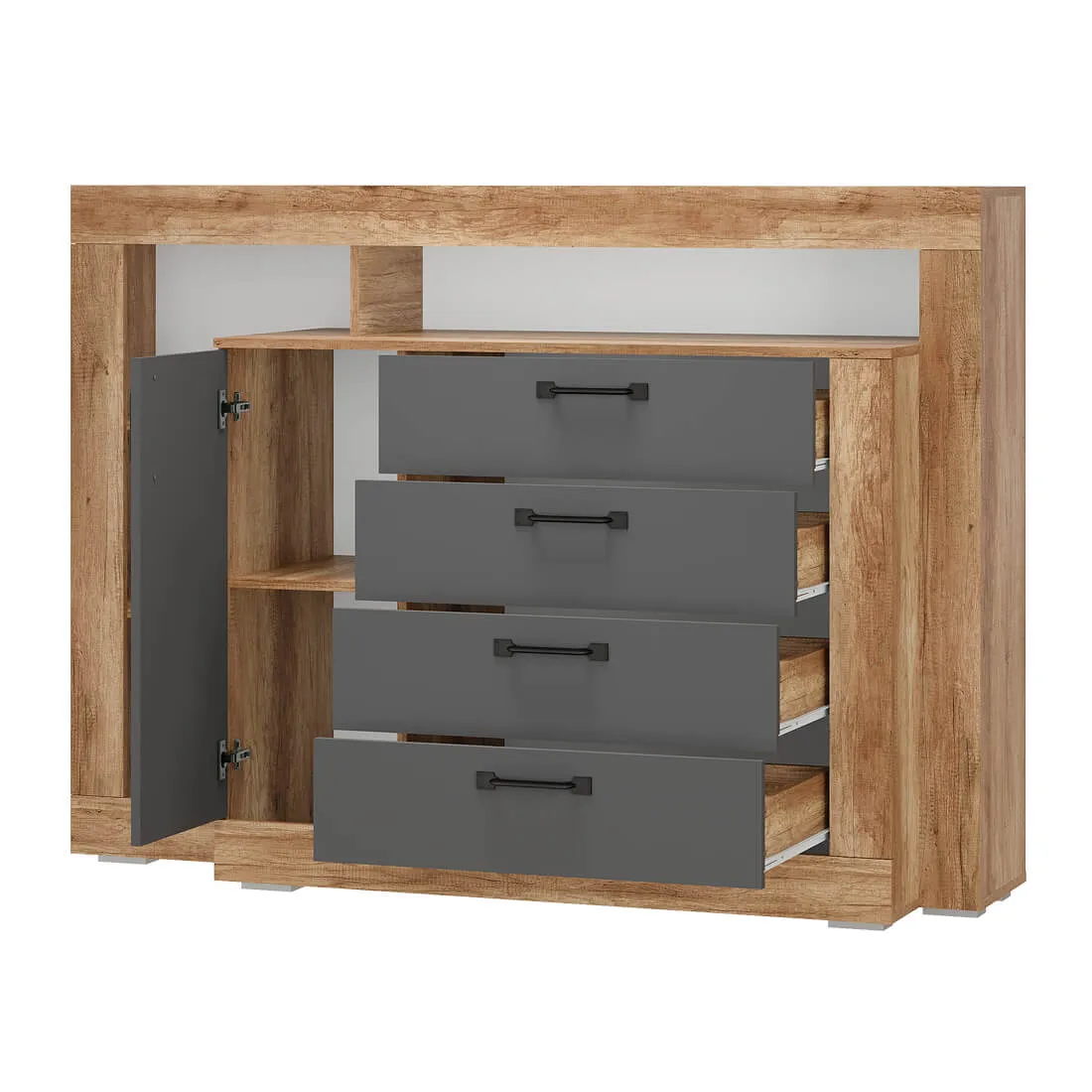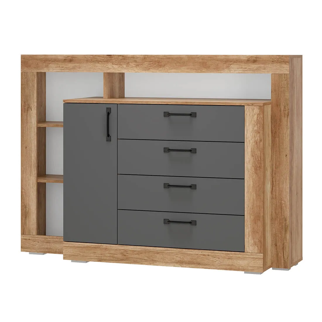 Комод многофункциональный "Прима" КМ-17 - удобная система хранения для одежды, постельных принадлежностей или других хозяйственных аксессуаров. Все необходимые вещи можно расположить на полках за распашной створкой, а также в трёх вместительных выдвижных ящиках. В открытых нишах можно разместить игрушки, книги, наборы для творчества и много других вещей.