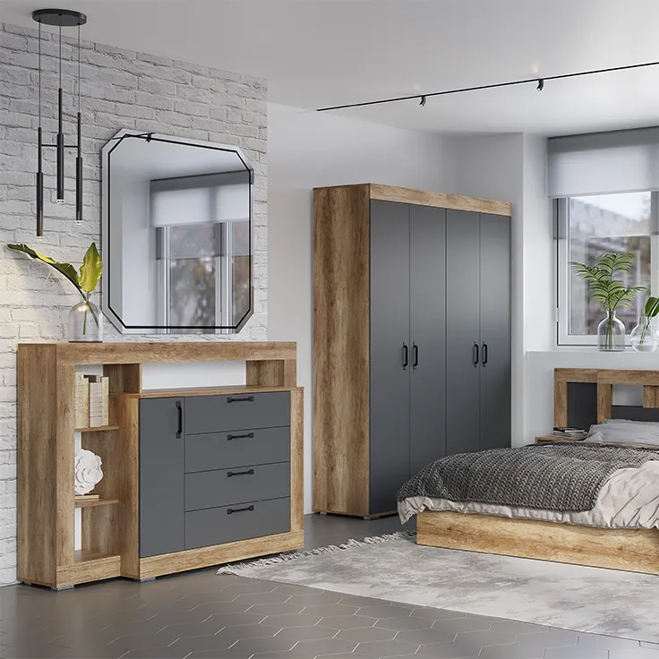 Коллекция "Прима" в модном декоре "дуб каньон/графит" удачно вписывается в городской индустриальный стиль и выглядит очень необычно и оригинально. Приятный корпус под дерево и матовые тёмные фасады - такое контрастное сочетание добавит комнате стиля.