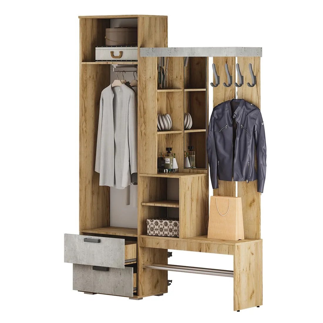 изделие имеет все необходимые зоны для размещения вещей в прихожей: крючки для верхней одежды, открытые и закрытые ниши, шкаф с выдвижной штангой и зону для хранения обуви.
