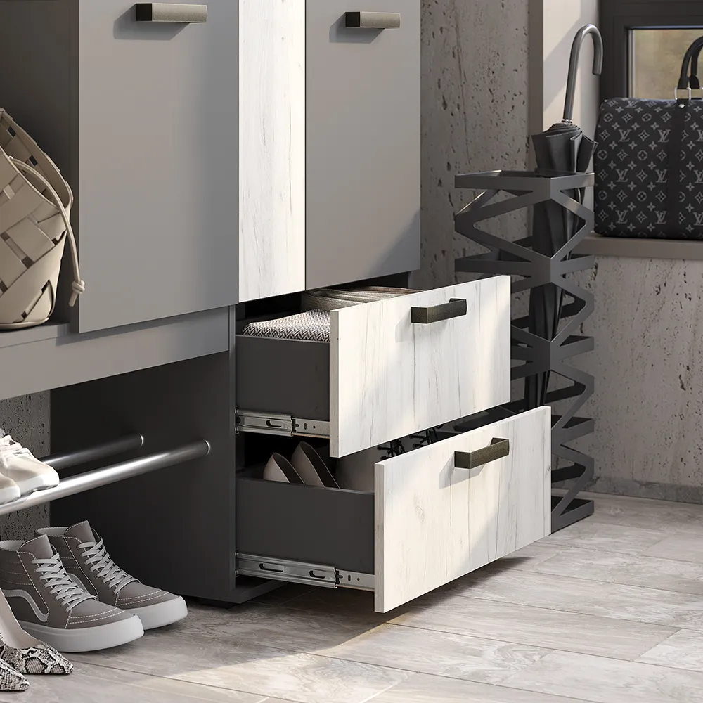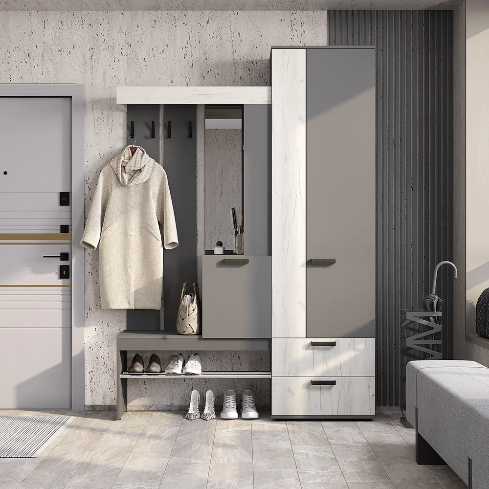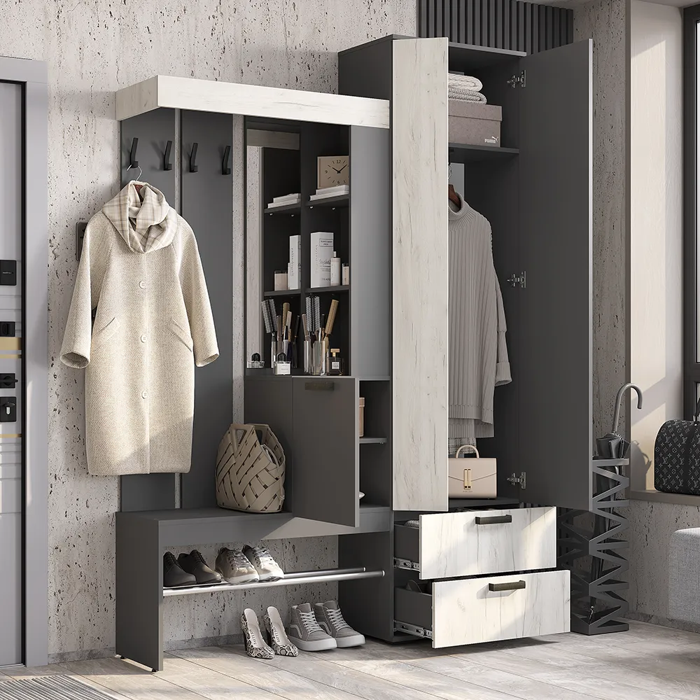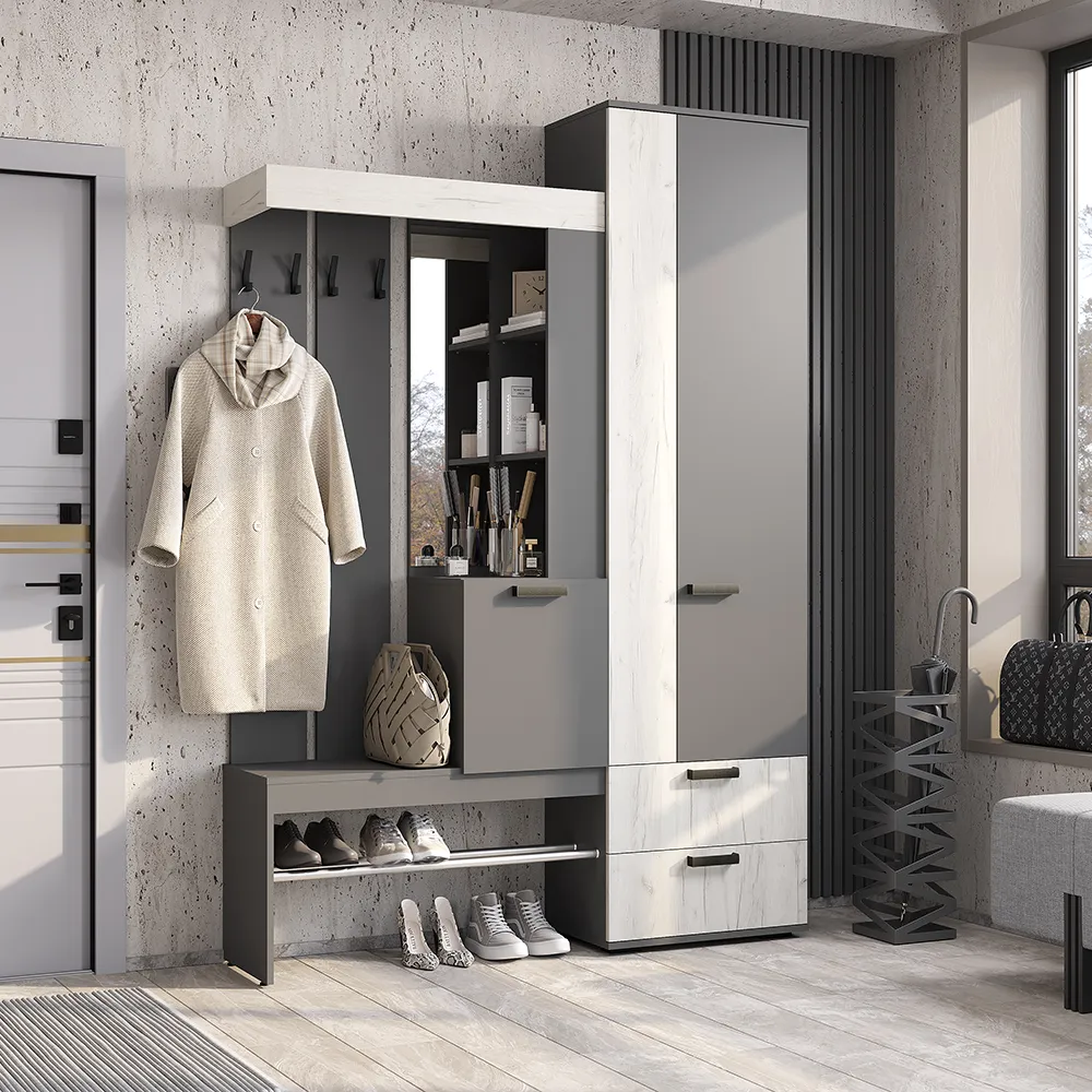 Изящная и практичная конструкция. Вместительный и компактный шкаф с отделением для верхней одежды и выдвижными ящиками. Удобная подставка под обувь (металлическая труба). Эргономичная основная секция с крючками для одежды, полками для мелочей, зеркалом и одним закрытым отделением. Контрастное исполнение в трендовых оттенках.