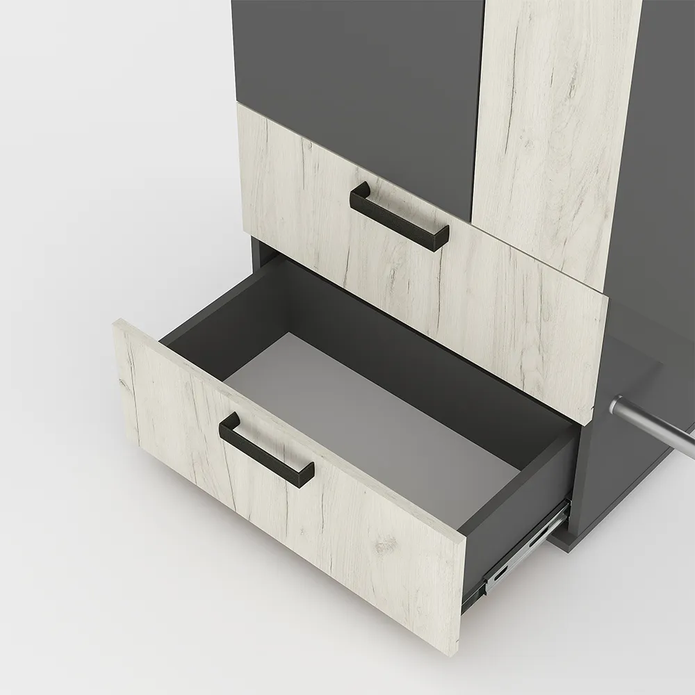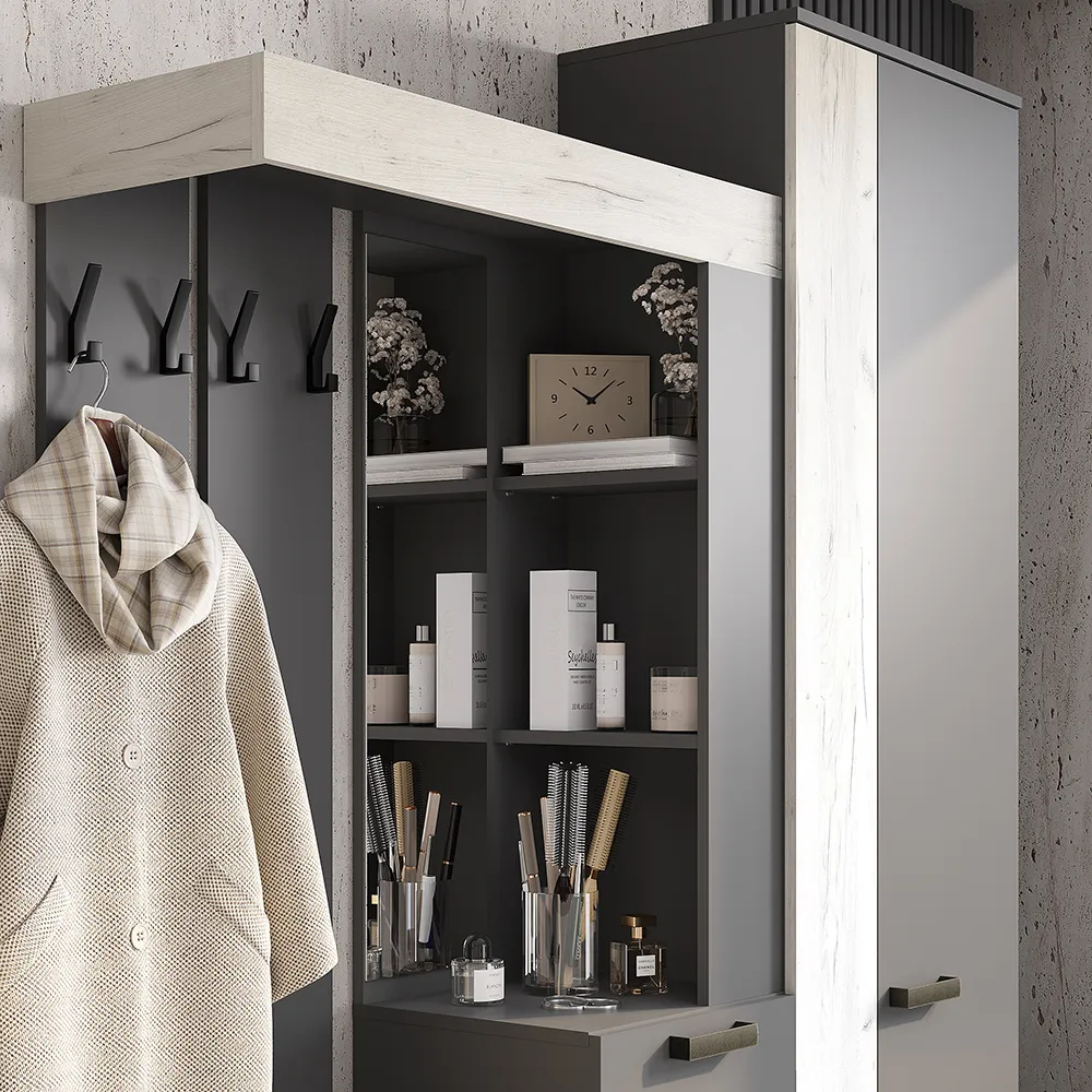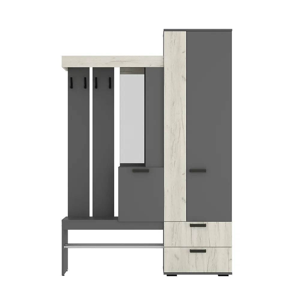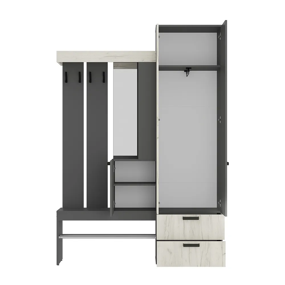 Изящная и практичная конструкция. Вместительный и компактный шкаф с отделением для верхней одежды и выдвижными ящиками. Удобная подставка под обувь (металлическая труба). Эргономичная основная секция с крючками для одежды, полками для мелочей, зеркалом и одним закрытым отделением. Контрастное исполнение в трендовых оттенках.