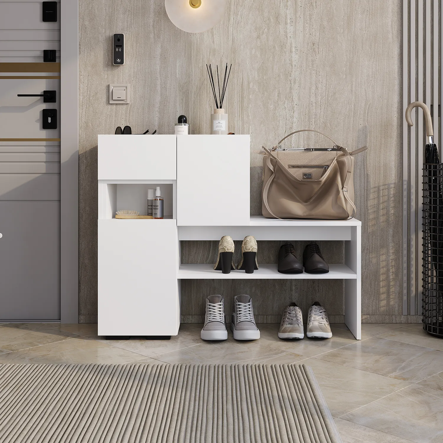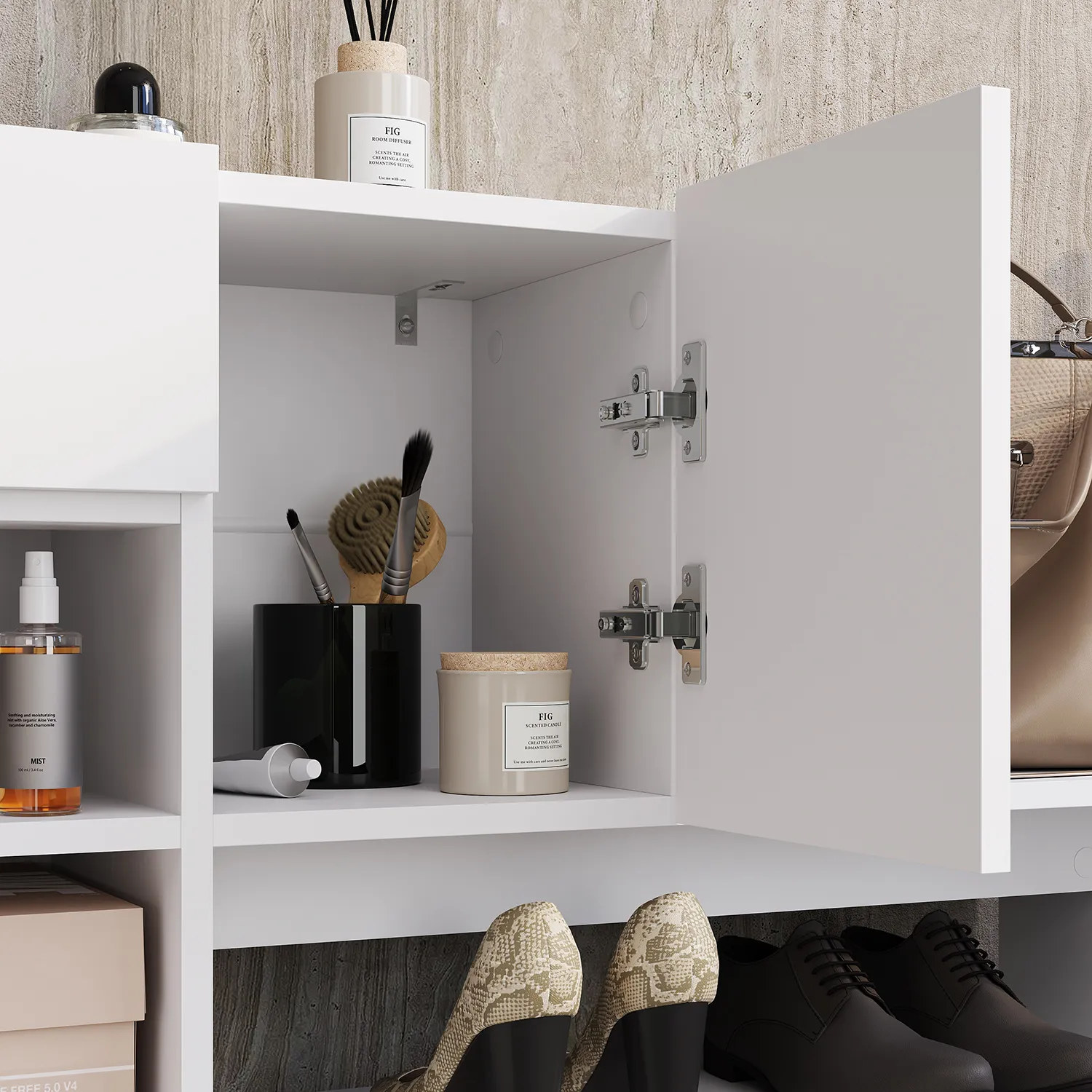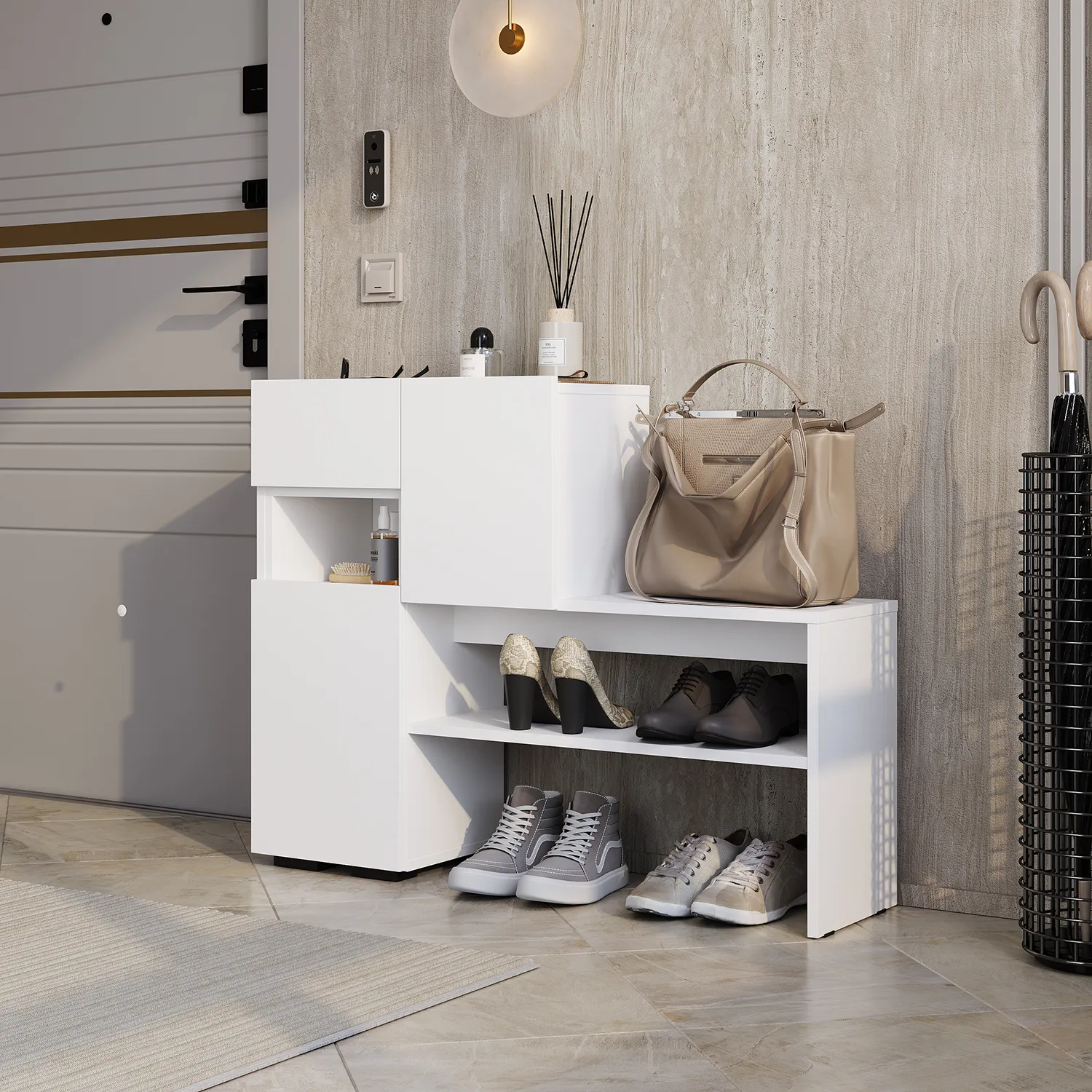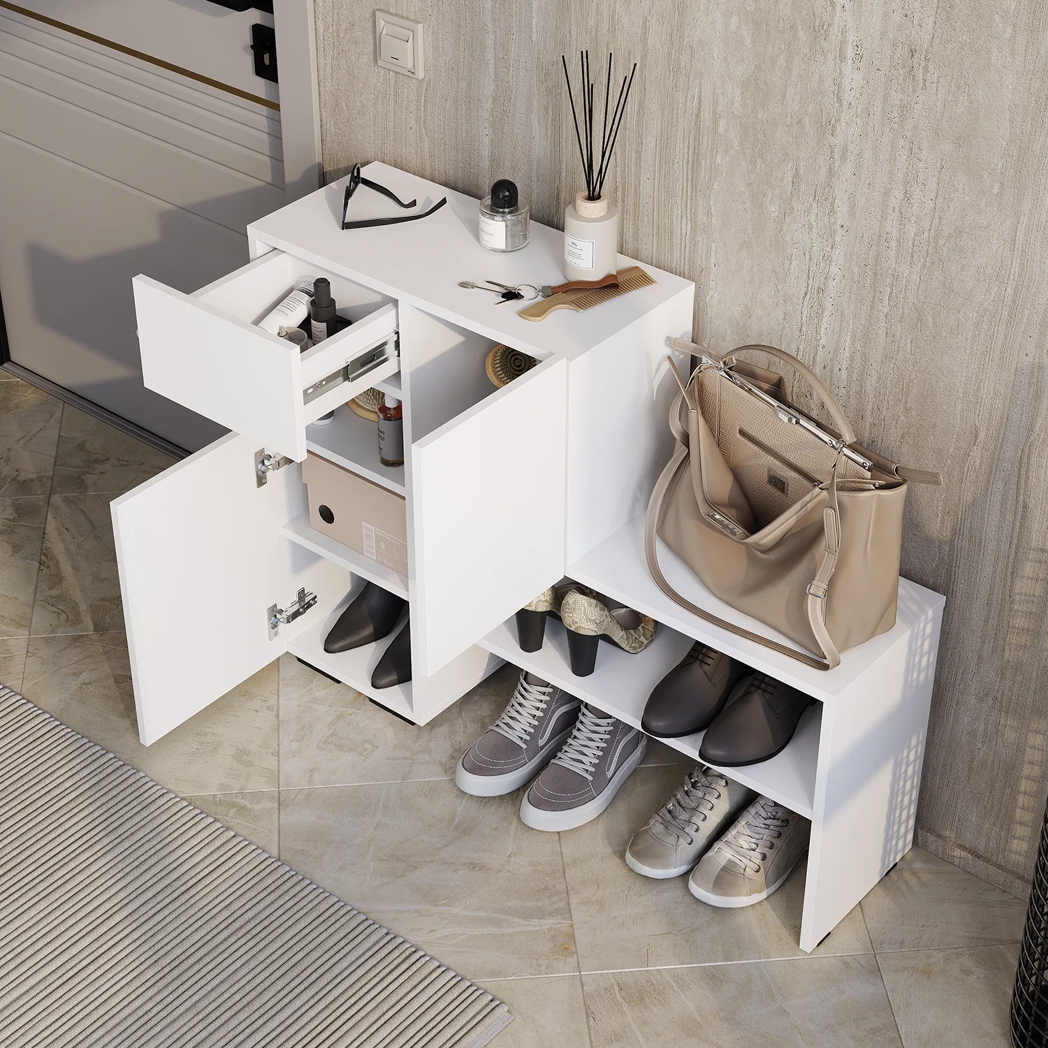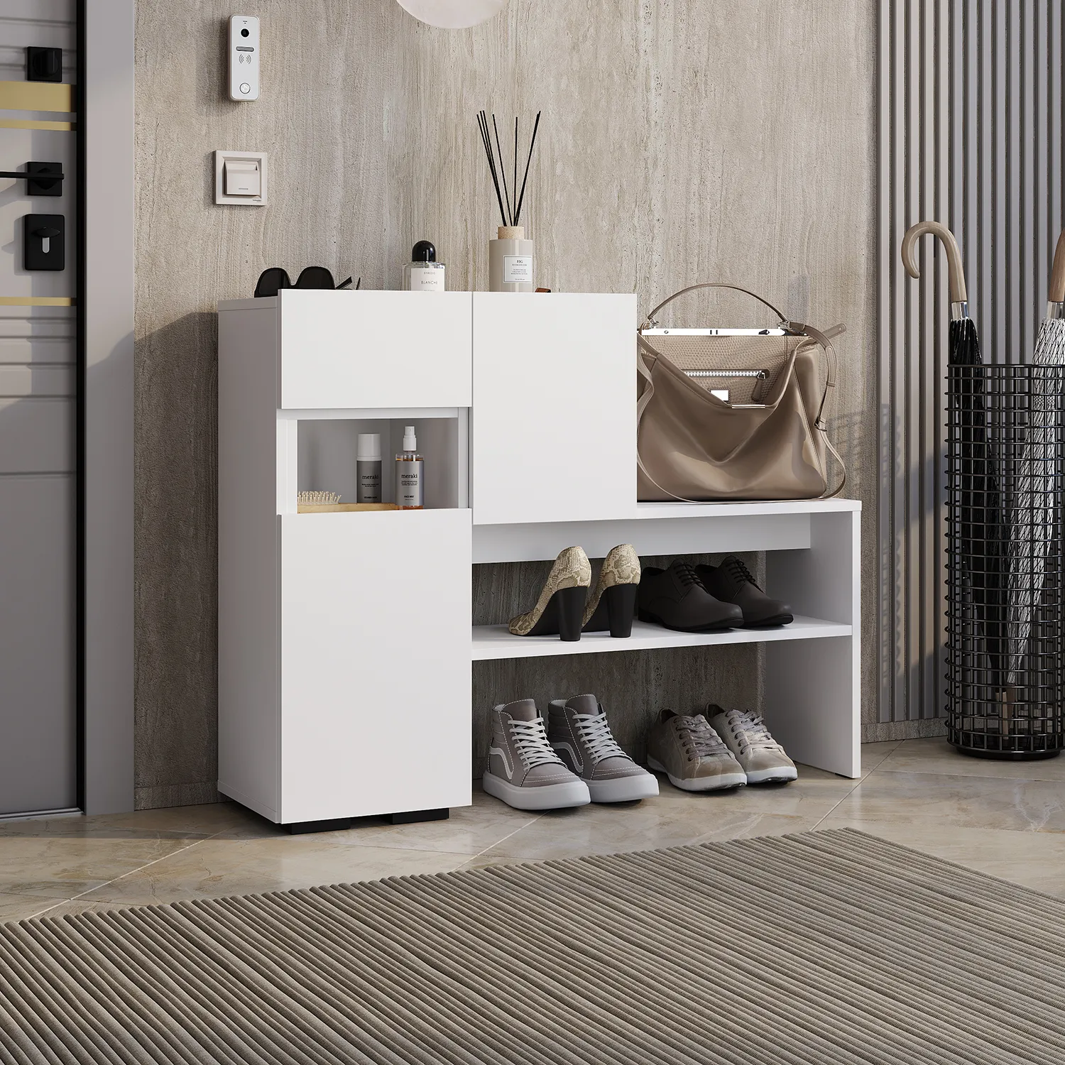 Обувная полка имеет открытые и закрытые пространства. Это позволяет системно размещать все нужные предметы. А выдвижной ящик создает необходимое скрытое место для складирования мелочей.