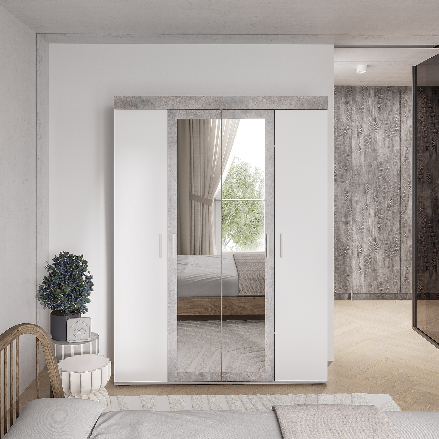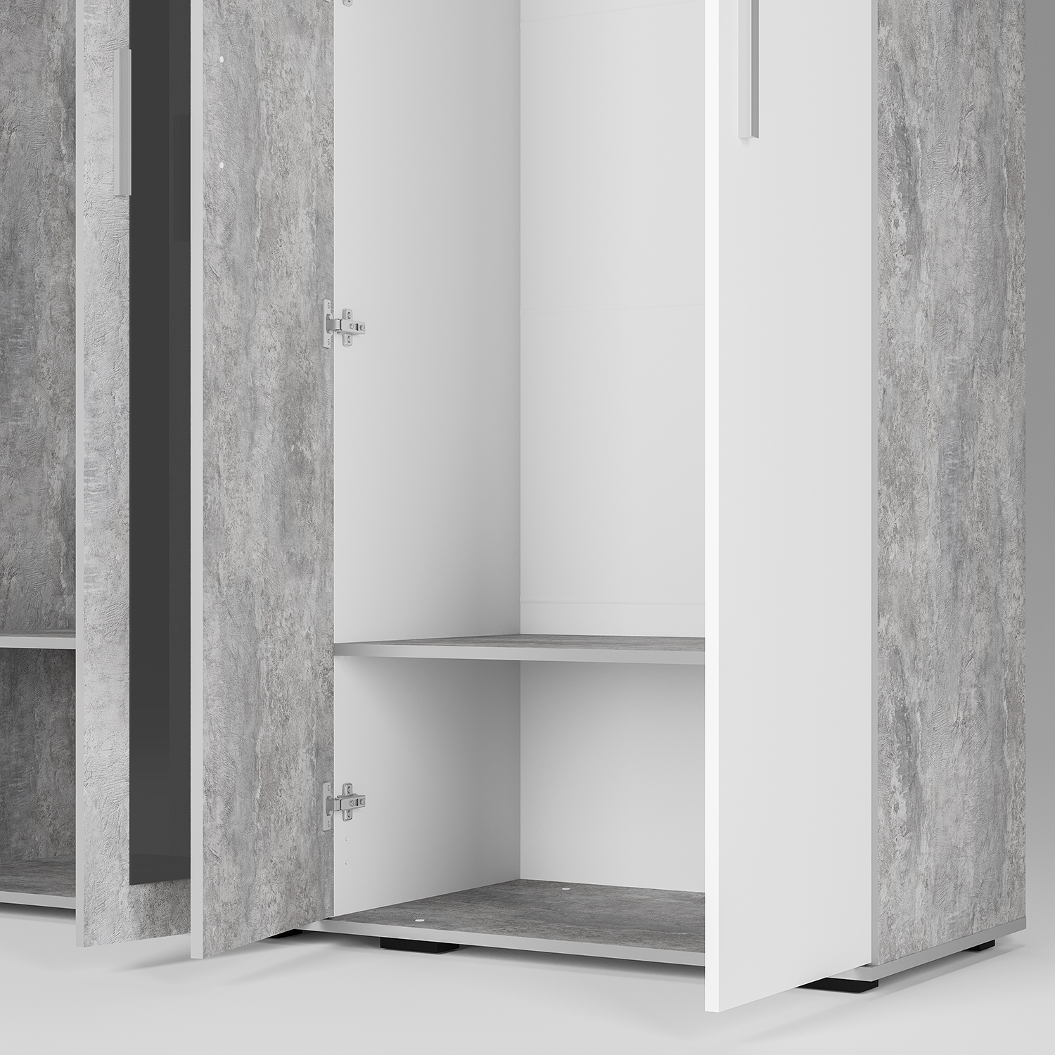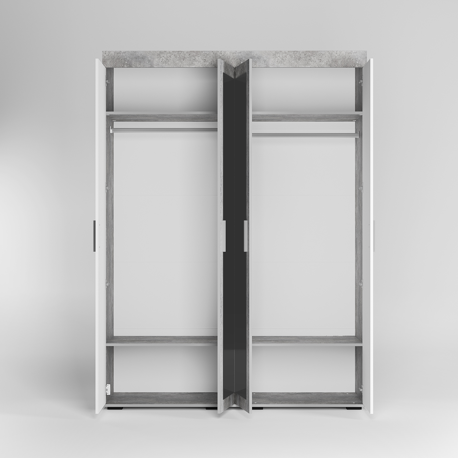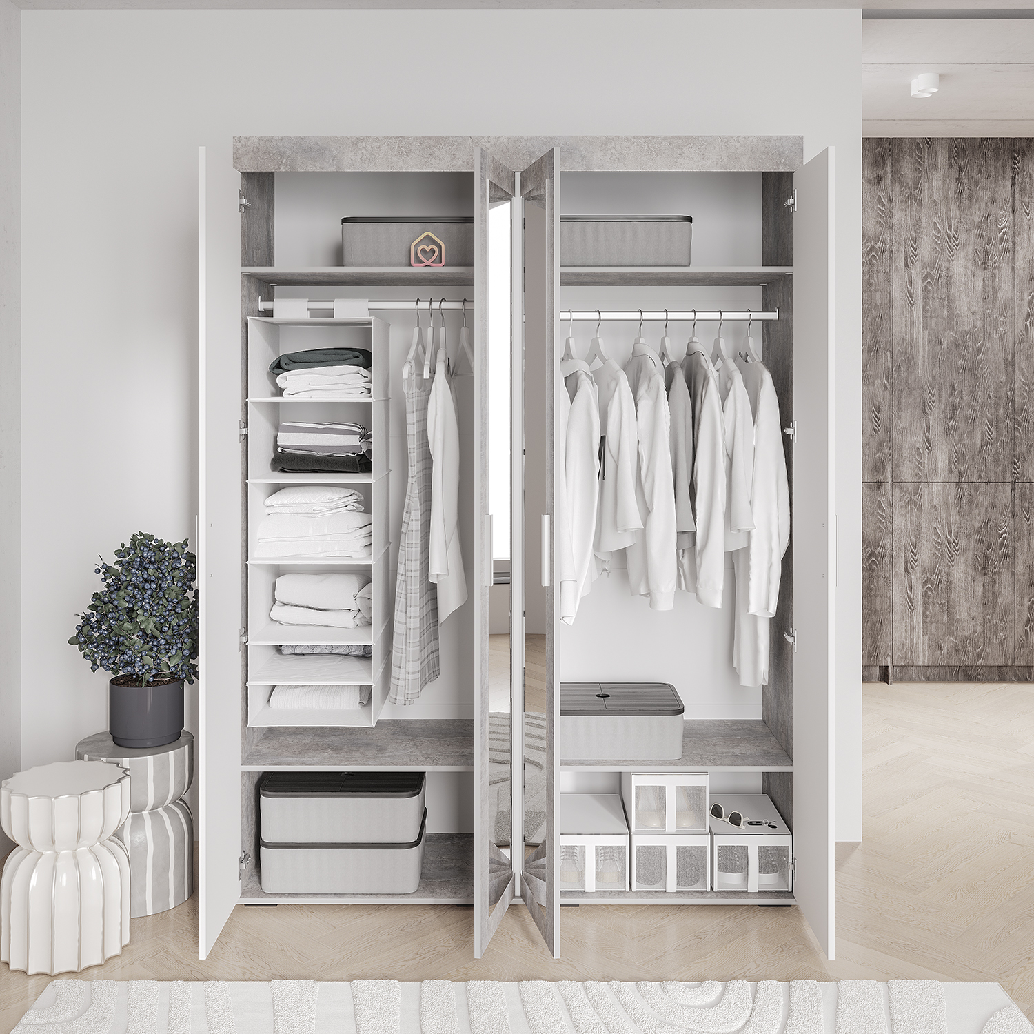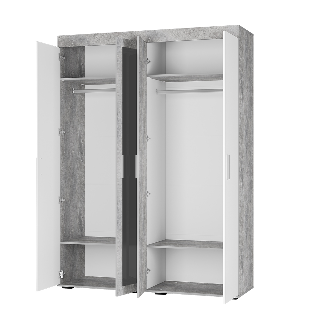 Место внутри шкафа легко структурировать. Этому способствуют распашные двери, четырехстворчатый отсек с двумя полками и 2 больших центральных отделения.