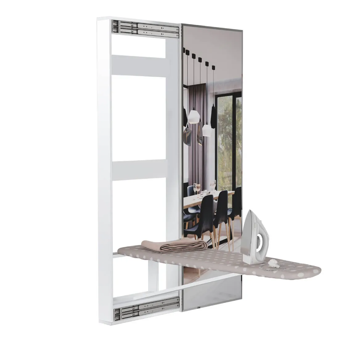 Гладильная доска - зеркало надежно крепится к каркасу с помощью прочной трельяжной петли.