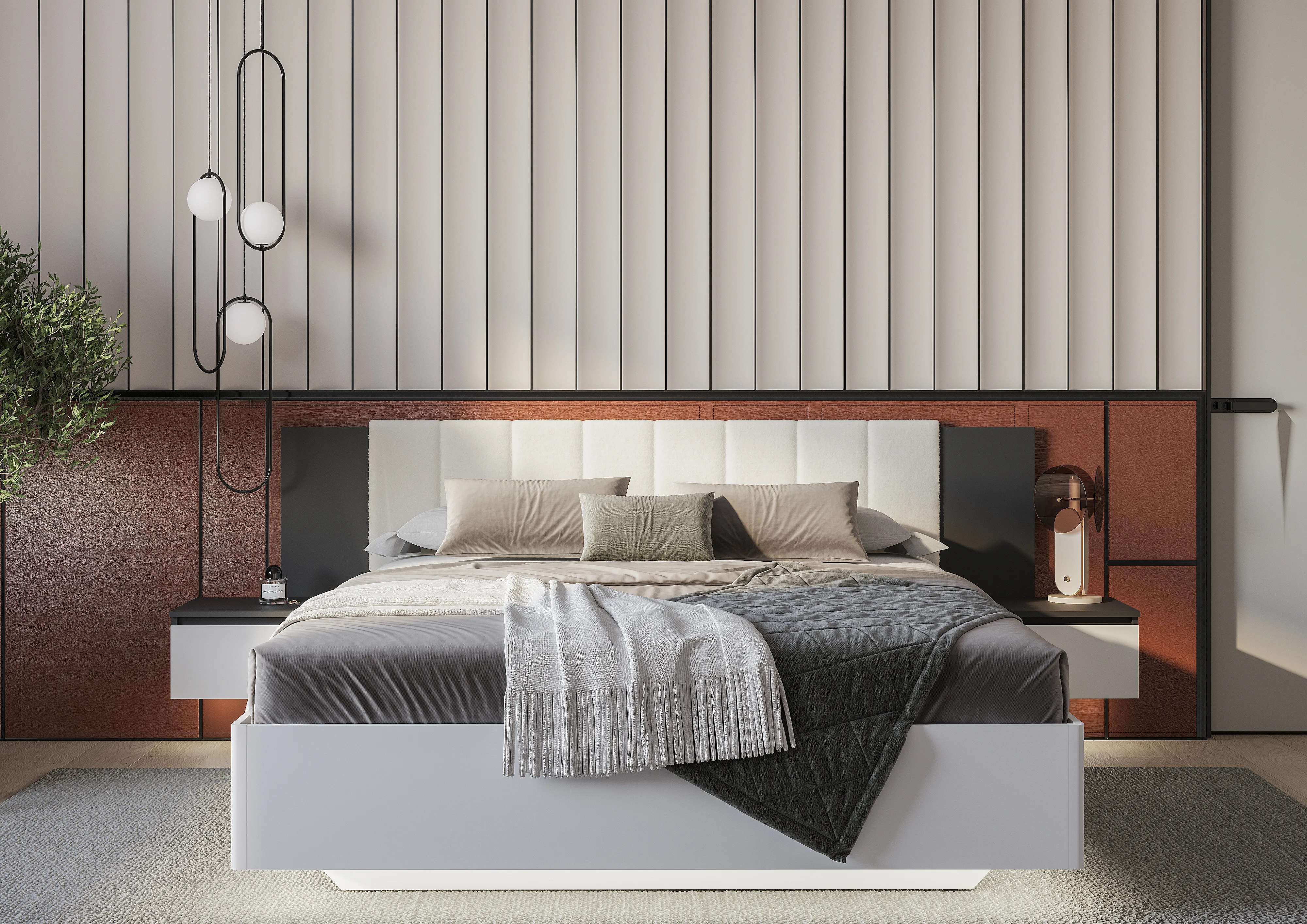 Коллекция "Шарм" - современная классика в контрастном исполнении "белый/графит". Кровать с парящим эффектом и мягким изголовьем в трендовой ткани "барашек" - сердце коллекции. Шкафы (3-х и 4-х створчатый) обретают массивность благодаря монолитным ЛДСП-порталам, дополнены вертикальными черными ручками и надежными петлями с доводчиками. Комод воплощает чистый минимализм: гладкие фасады (без фурнитуры) и плавные шариковые направляющие. Парящие тумбы крепятся к изголовью, сохраняя стены безупречными. Элегантность, функциональность и защита интерьера.