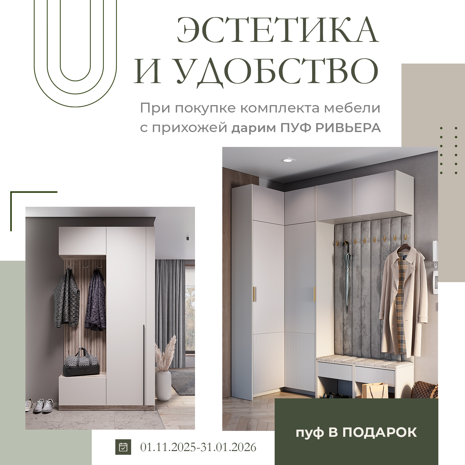 С 1.11.2025 по 31.01.2026 при покупке комплекта мебели с прихожей от 30000 рублей ДАРИМ пуф "Ривьера"!