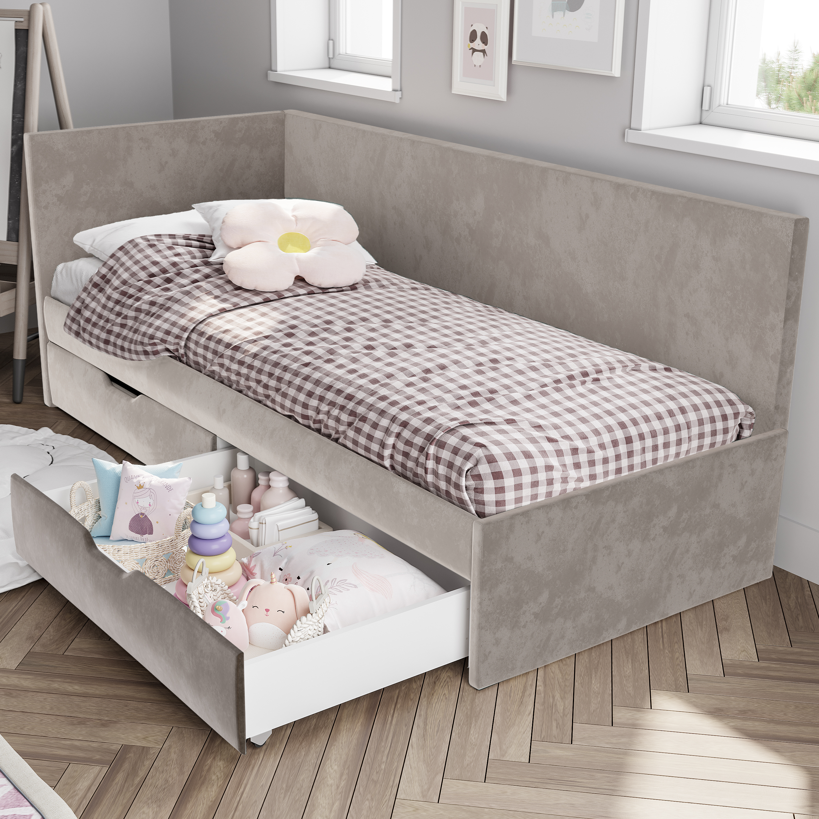 <virtues>Заказала две кроватки сыновьям, сразу с матрасами и подушками. Доставка быстрая. Сборка легкая. Отлично вписались в интерьер. Старший спит беспокойно и мягкая обивка очень уместна. Спасибо за недорогие и красивые модели!</virtues>