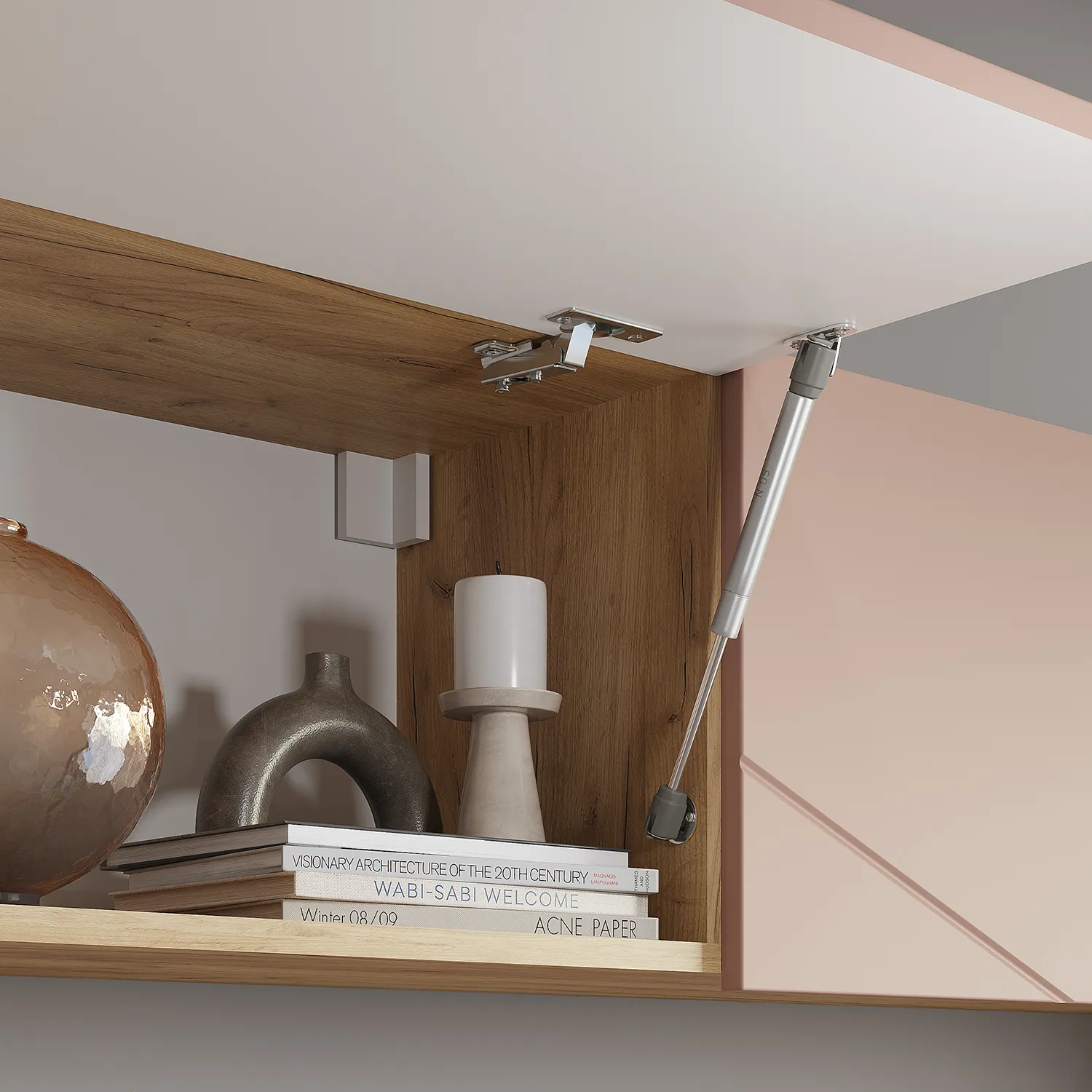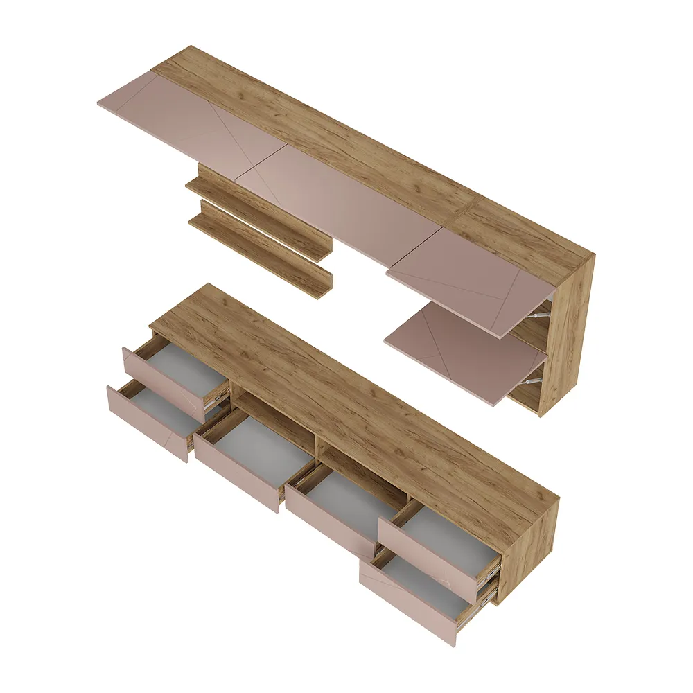 Вы можете выбрать этот гарнитур не только для гостиной, но и для спальни или кабинета. Он поможет упорядочить пространство в любом помещение благодаря разнообразию элементов: выдвижных ящиков, закрытых и открытых полочек. Большая функциональность сочетания разных модулей позволяет реализовать самые смелые идеи по организации хранения.