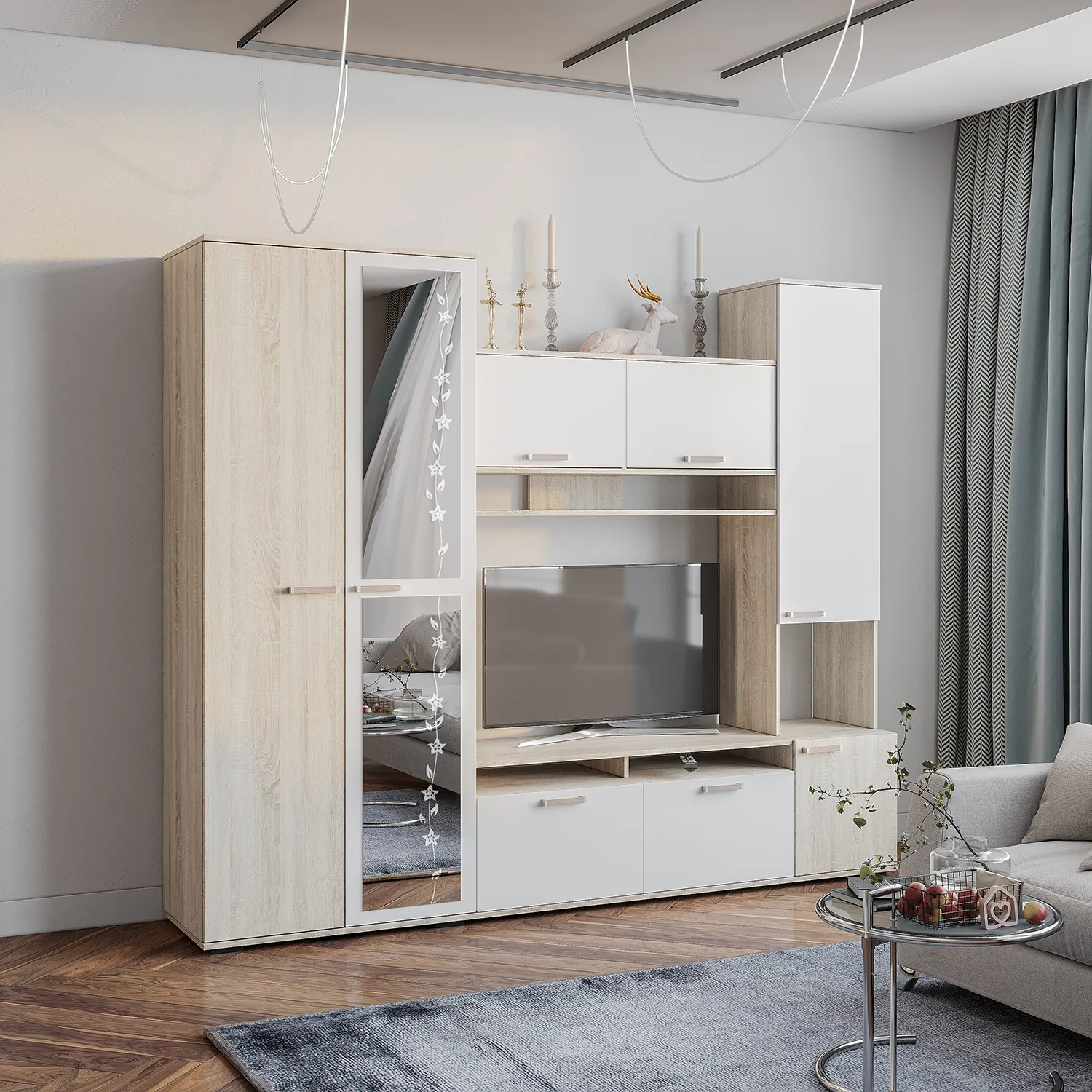 Большая гостиная с зеркалом "Лукас" — это готовое решение для создания стильного и функционального пространства в вашем доме или на даче. Гарнитур, выполненный в сочетании пастельного цвета дуб сонома и белого, добавляет лёгкости и света, визуально расширяя комнату.