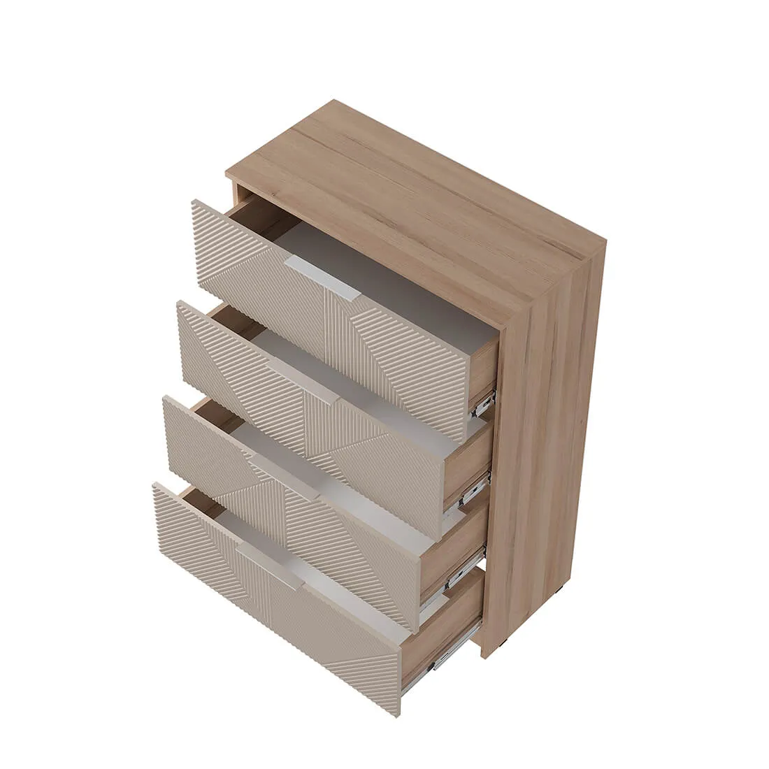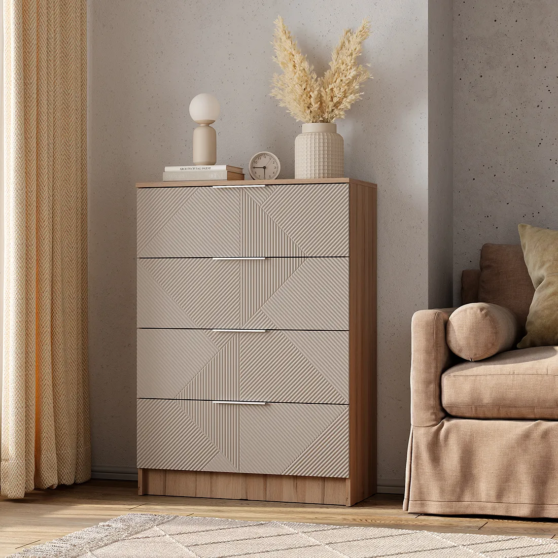 Комод "Эмилия" КМ-02 обладает четырьмя просторными ящиками для одежды и белья. Благодаря эргономичным фасадам открывание ящиков становится удобным и лёгким.