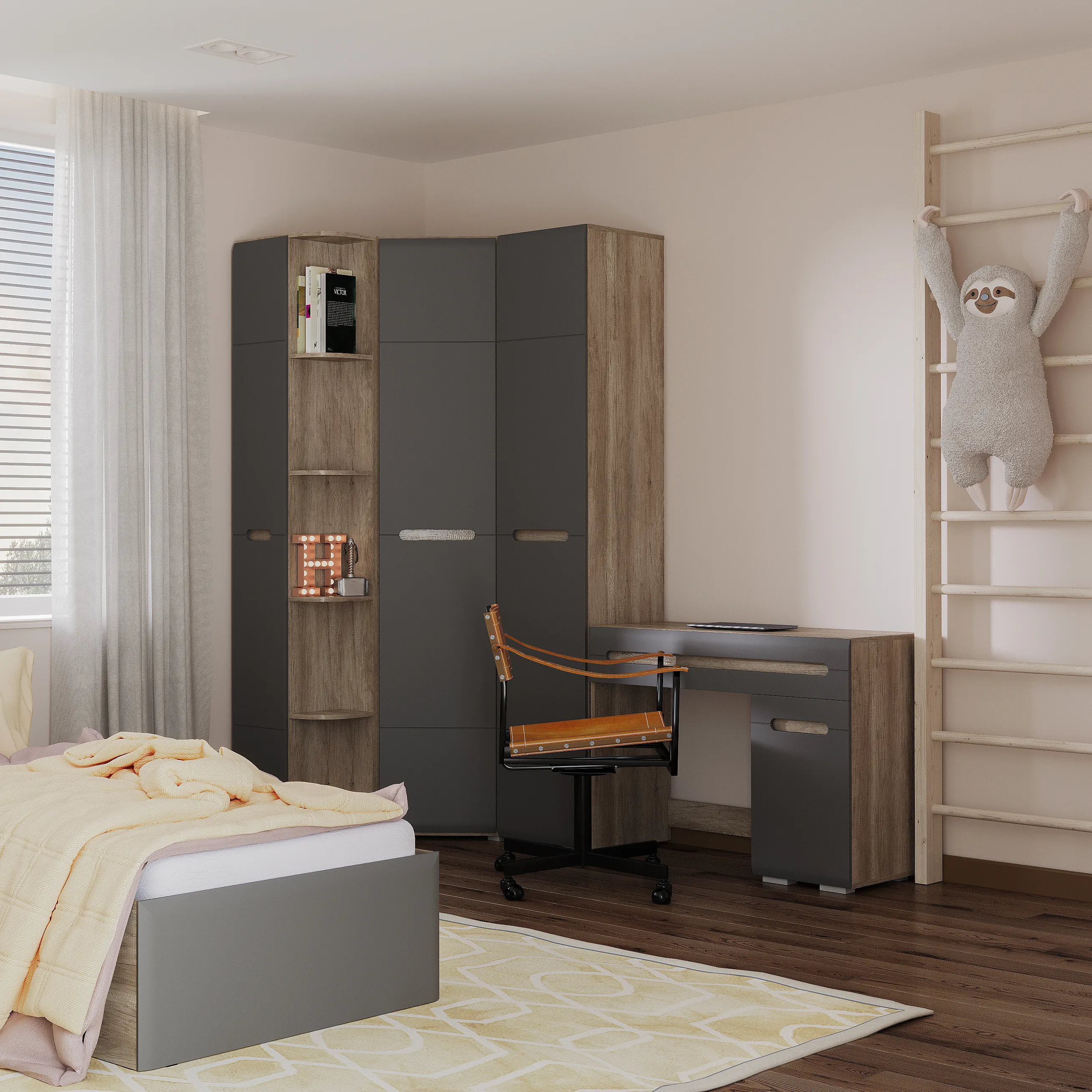 Модульная коллекция «Наоми» – это стильное современное решение в контрастном сочетании корпуса «дуб каньон» с элегантным матовым фасадом грифельного оттенка.Оригинальное конструктивное решение коллекции – ручки фасадов, выполненные путем сложной фрезеровки с максимально реалистичным декором дубового спила.