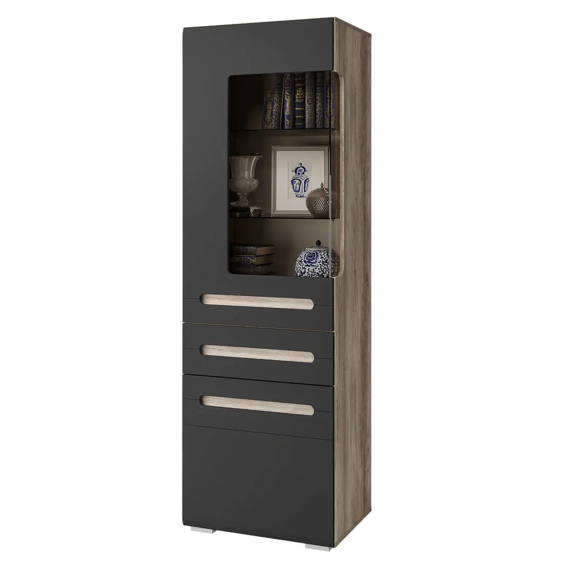 Модульная коллекция «Наоми» – это стильное современное решение в контрастном сочетании корпуса «дуб каньон» с элегантным матовым фасадом насыщенного грифельного оттенка. Оригинальное конструктивное решение коллекции – ручки фасадов, выполненные путем сложной фрезеровки с максимально реалистичным декором дубового спила.