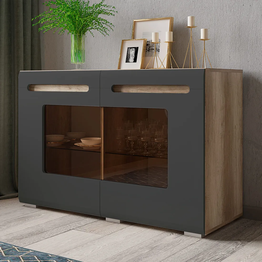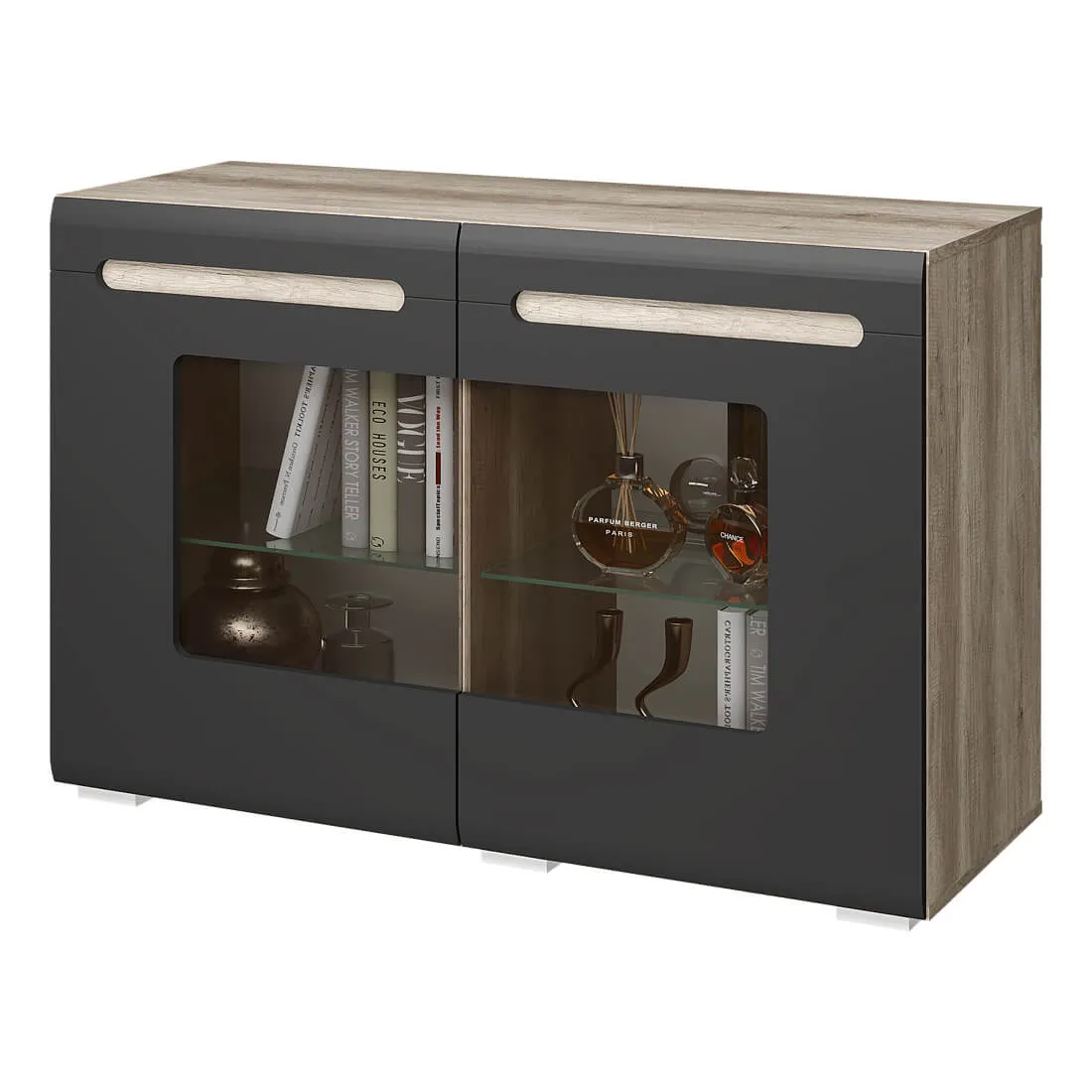 Большой комод "Наоми", выполненный в цвете "дуб каньон" с фасадами грифельного оттенка, может стать привлекательным акцентом любой комнаты. За двумя распашными дверцами, в которые встроены тонированные стекла, расположены полки для хранения посуды или сувениров. А в верхние выдвижные ящики можно положить какие-то мелочи, аксессуары или документы.