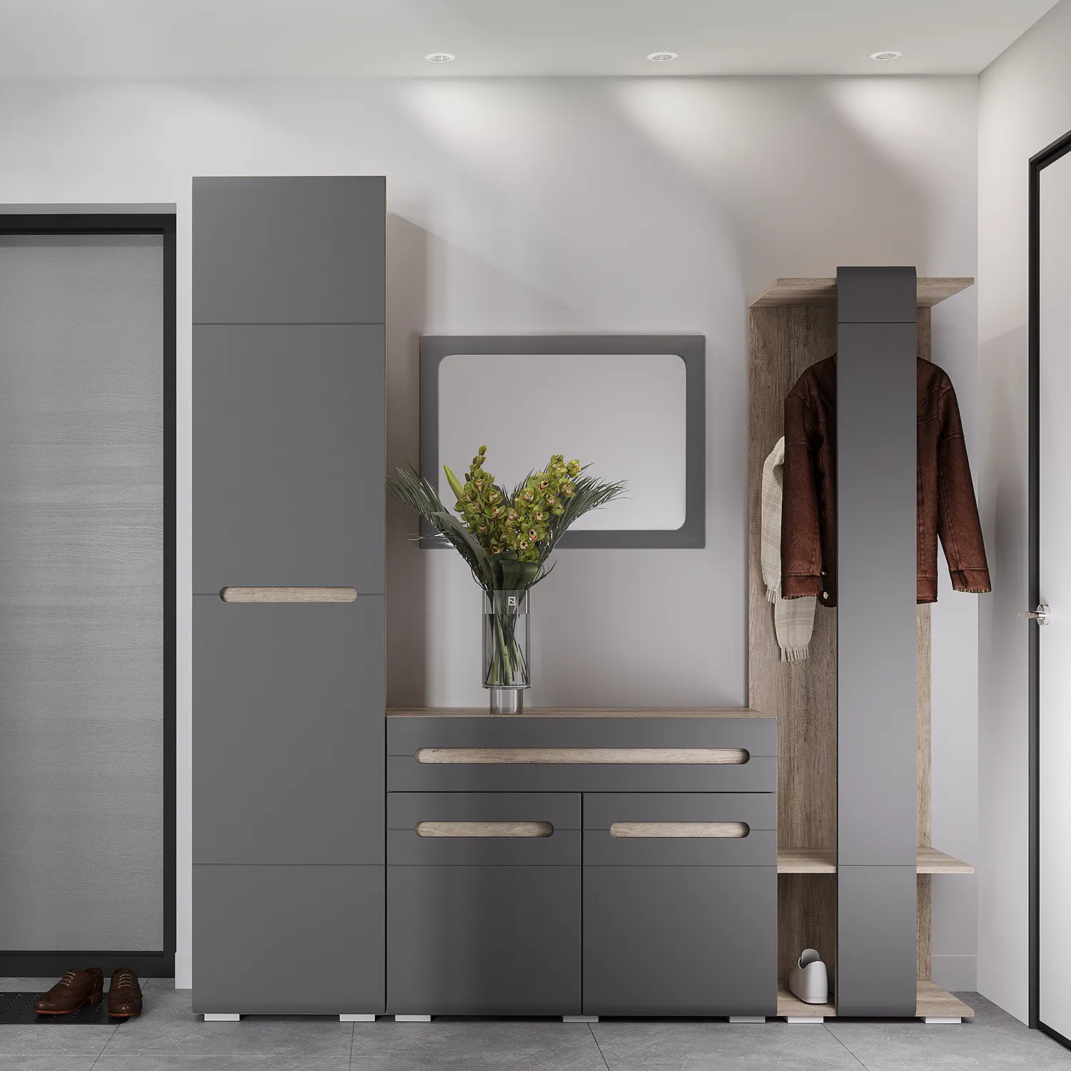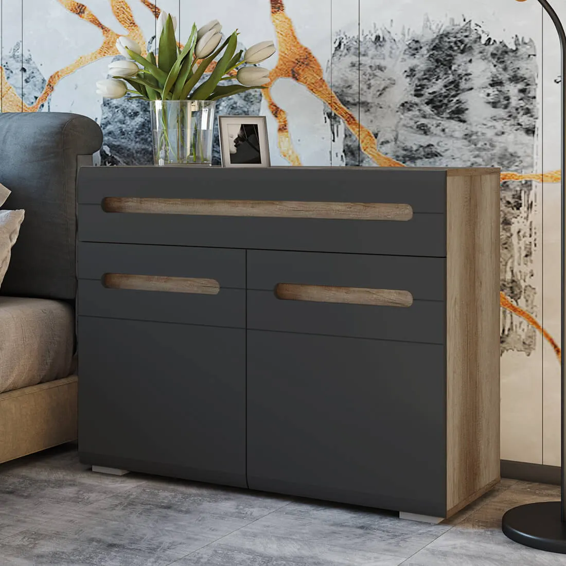 Модульная коллекция «Наоми» – это стильное современное решение в контрастном сочетании корпуса «дуб каньон» с элегантным матовым фасадом насыщенного грифельного оттенка. Оригинальное конструктивное решение коллекции – ручки фасадов, выполненные путем сложной фрезеровки с максимально реалистичным декором дубового спила.