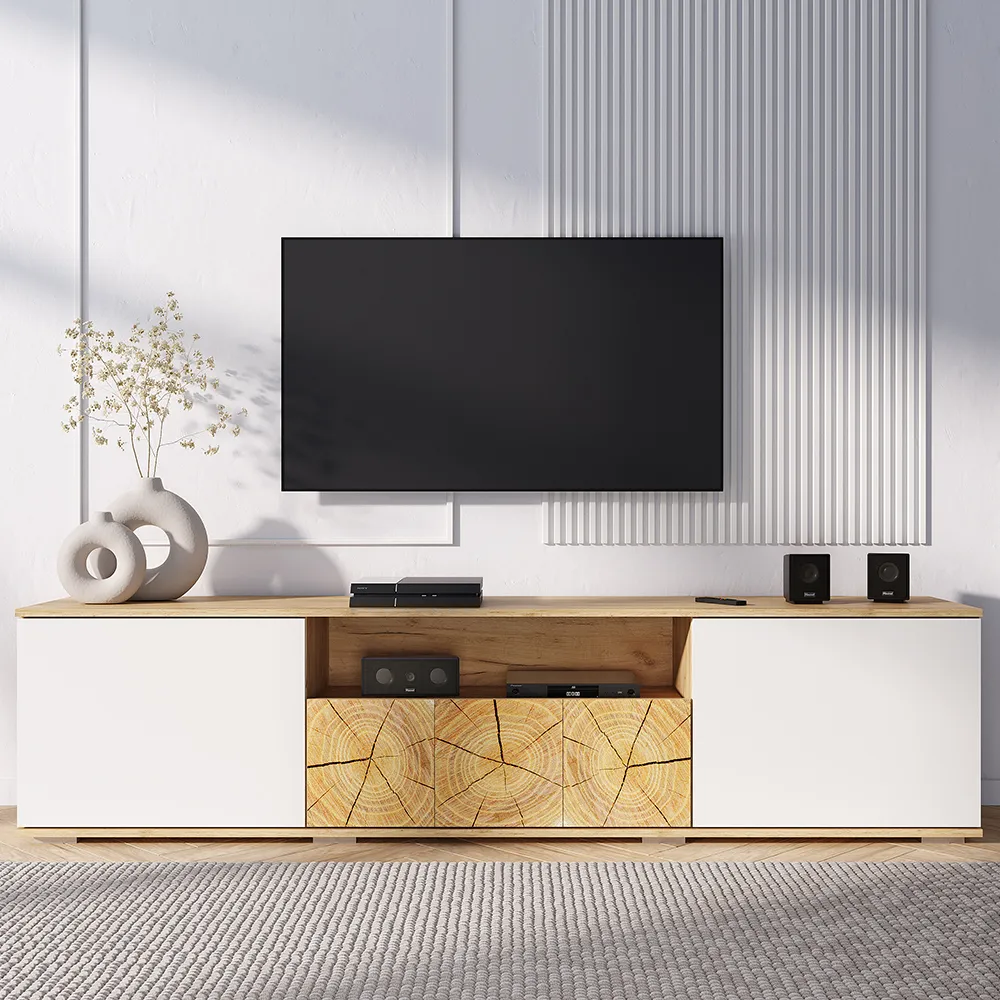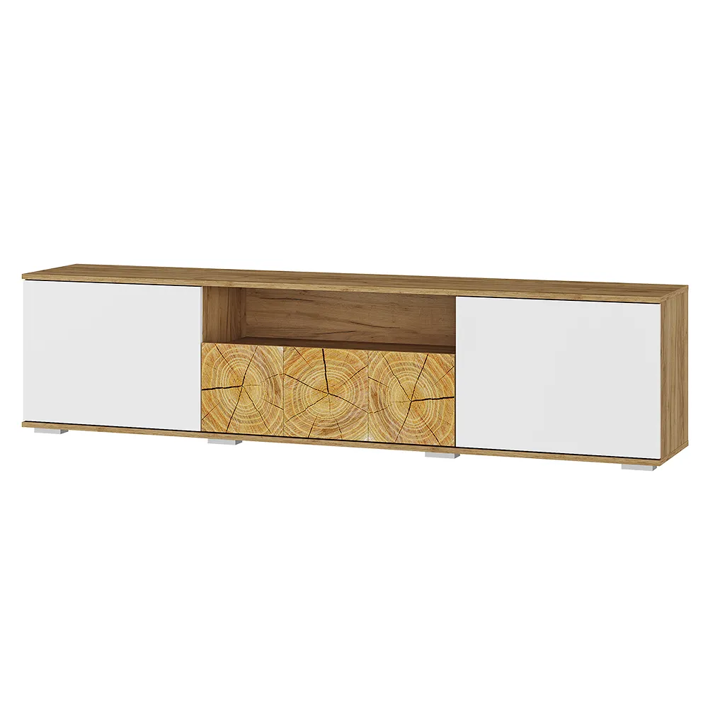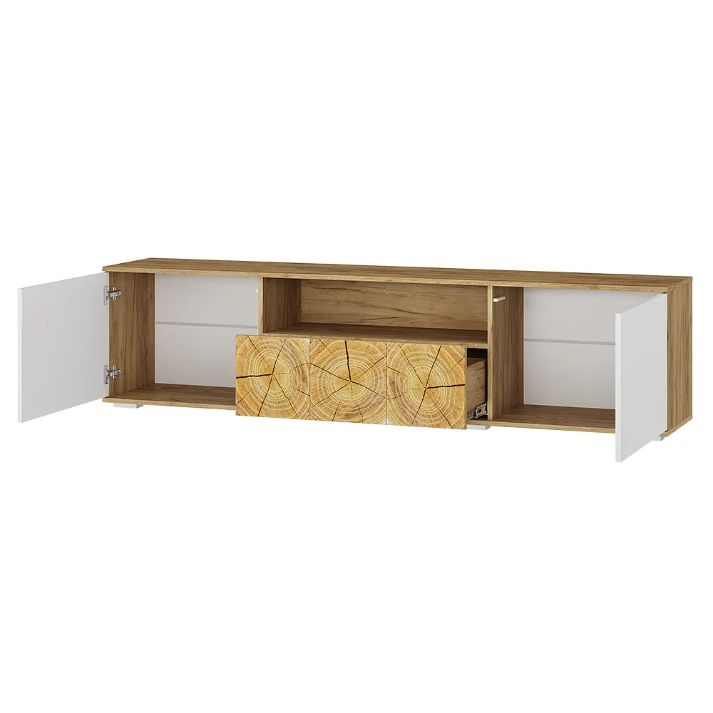 Тумба под ТВ из коллекции «Тиволи» сочетает три функциональных зоны для хранения: вместительный ящик, открытую узкую полку и еще две просторных полки, скрытых за дверцами. Яркий штрих модели - стильные вставки, стилизованные под спил дерева. Тумба отлично дополнит гостиную, на ней можно разместить телевизор и приставку, а также небольшую технику и колонку.