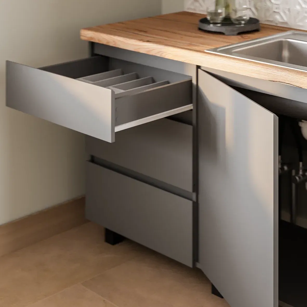 Прямые четкие линии, матовые фасады без декора и гармоничное сочетание всех блоков делает этот комплект универсальным.