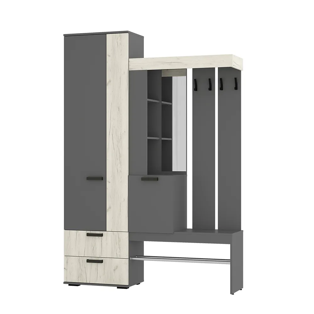 Изящная и практичная конструкция. Вместительный и компактный шкаф с отделением для верхней одежды и выдвижными ящиками. Удобная подставка под обувь (металлическая труба). Эргономичная основная секция с крючками для одежды, полками для мелочей, зеркалом и одним закрытым отделением. Контрастное исполнение в трендовых оттенках.