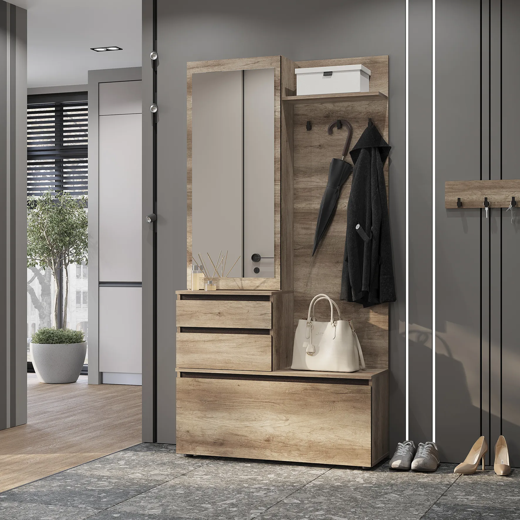 «Энигма» — лучший выбор для небольшой прихожей. Модель оснащена зеркалом, вместительными ящиками для мелочей и аксессуаров, а также просторным отсеком с дверцей для обуви. Верхнюю одежду можно разместить в отдельной зоне. Для головных уборов в прихожей также предусмотрена специальная полка. Ключница в комплекте.