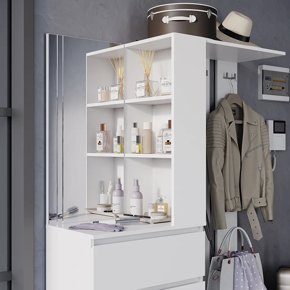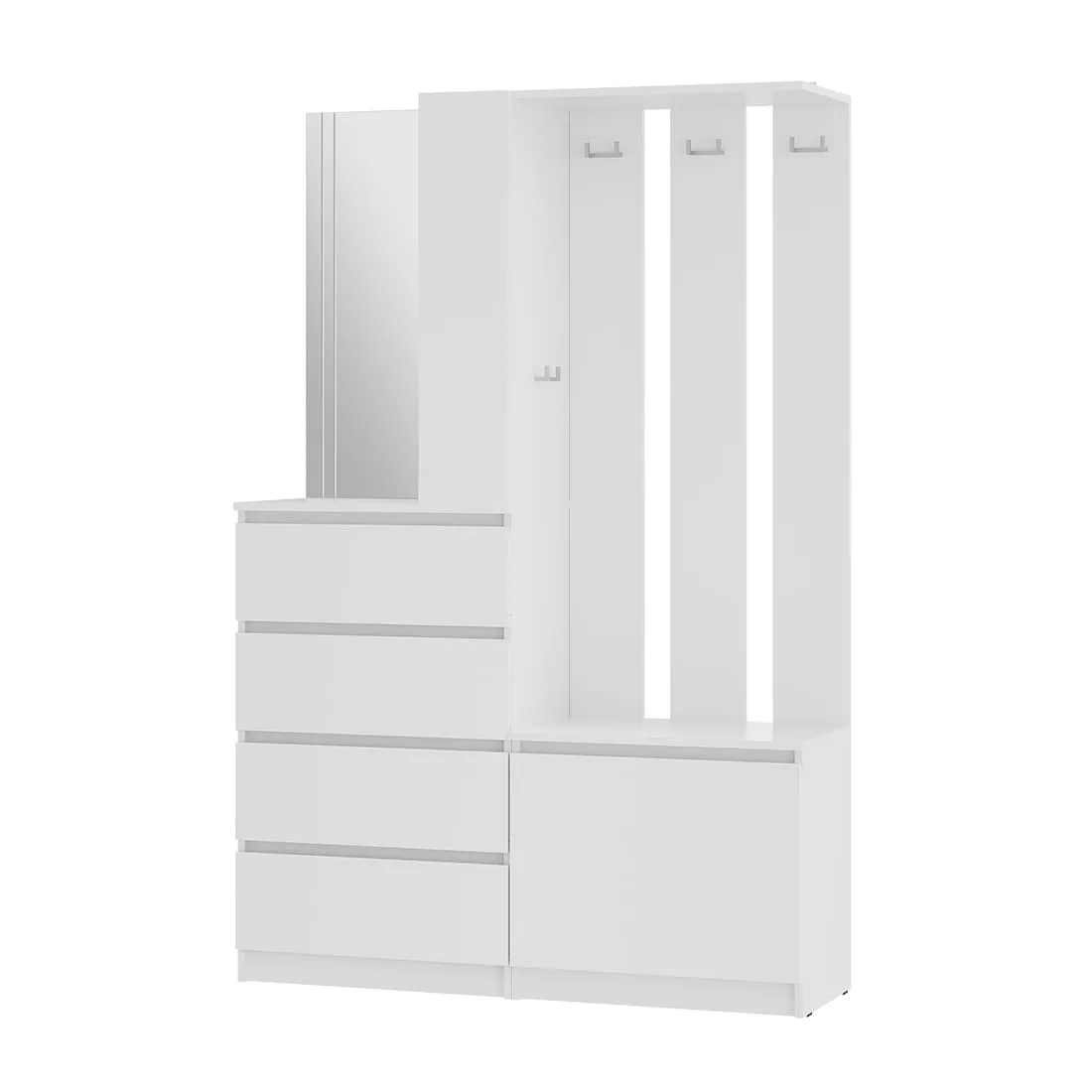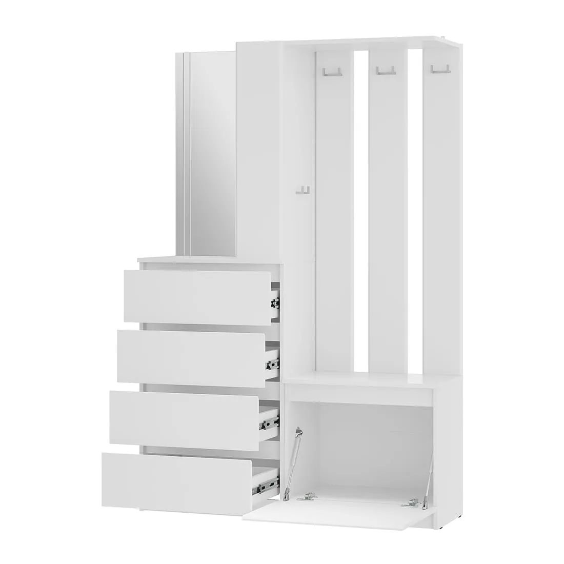 Прихожая «Симпл» (ПР-04) — конструкция продумана до мелочей. Комплект оснащен всем необходимым для комфортного размещения вещей в прихожей. Впишется как в просторное, так и в небольшое помещение. Под зеркалом в минималистичном дизайне — четыре выдвижных ящика, в которых можно хранить шарфы, шапки и другие нужные аксессуары. Еще одна нижняя полка подойдет для хранения сезонной обуви, а три открытых полки рядом с зеркалом — для ключей. Несколько крепких крючков для верхней одежды. Нижняя откидная створка - на кронштейнах.