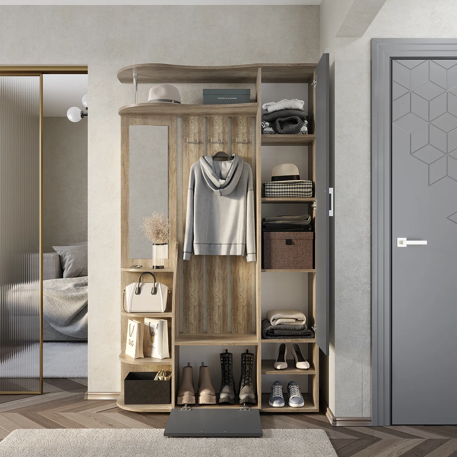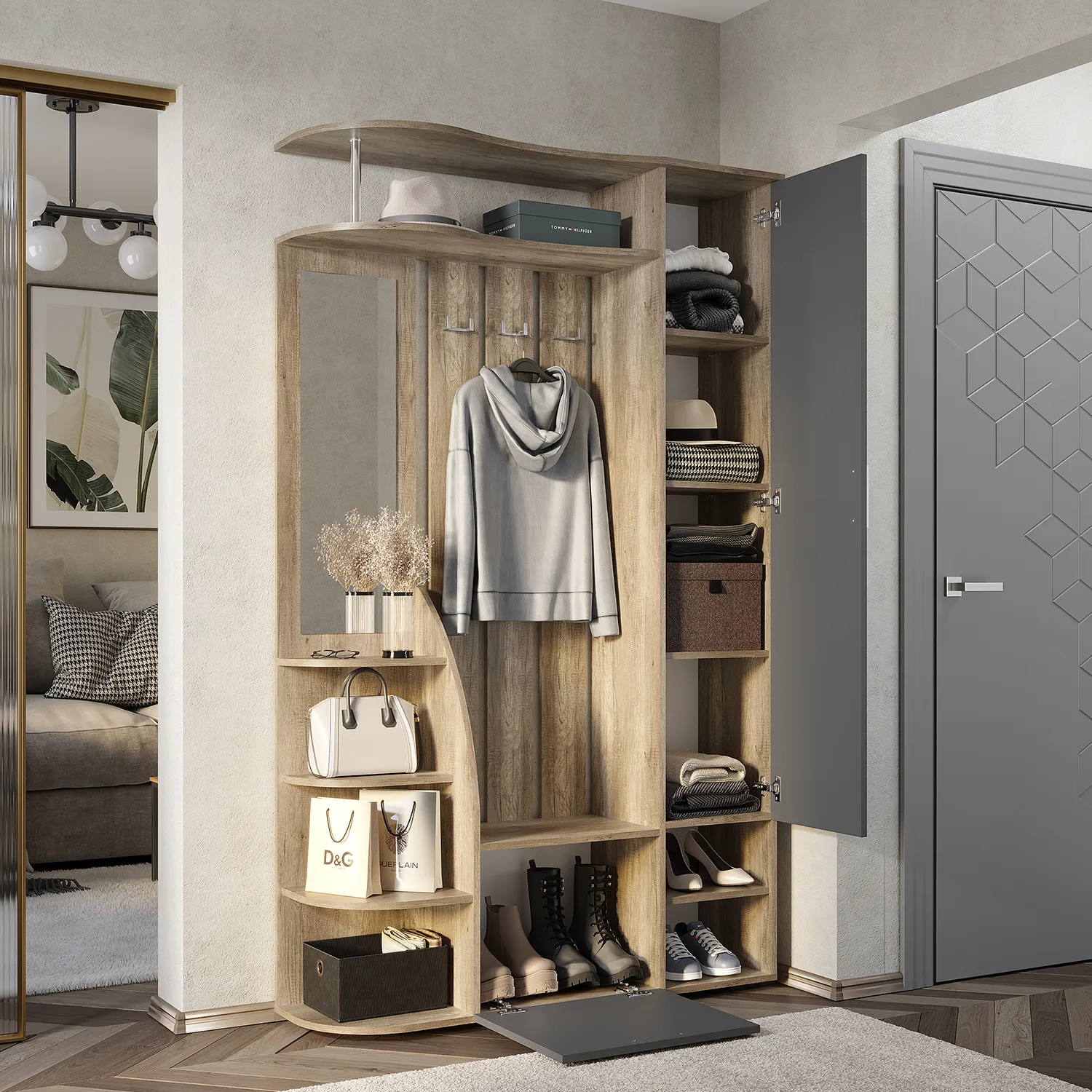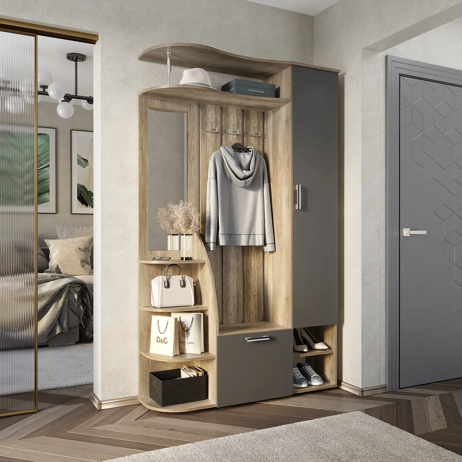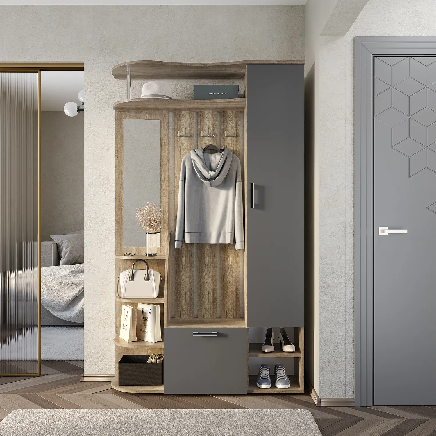 <virtues>Купили прихожую здесь и не можем нарадоваться! Дизайн стильный и современный, отлично подходит к нашему интерьеру. Очень удобно, что есть много отделений для хранения, теперь все вещи на своих местах. Качество мебели превзошло ожидания, и сборка прошла без проблем. Спасибо за отличный сервис и быструю доставку. Рекомендуем всем!</virtues>