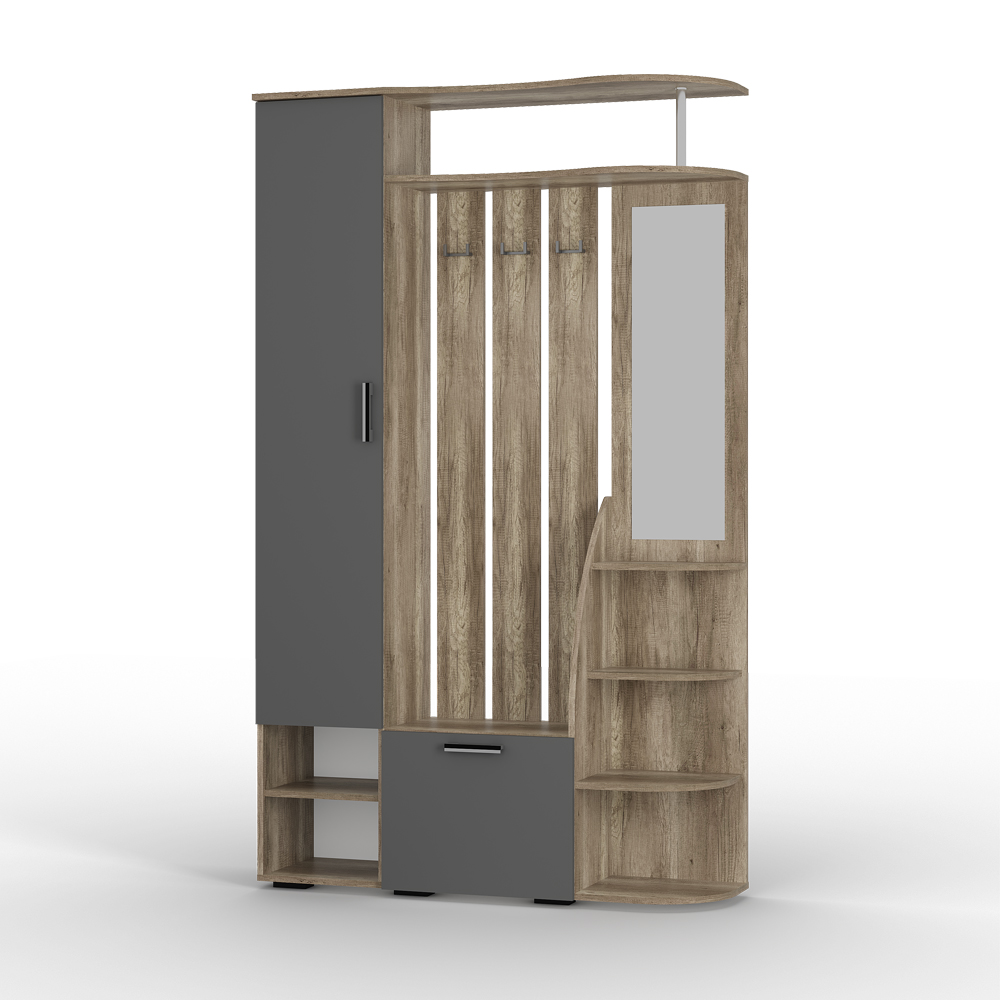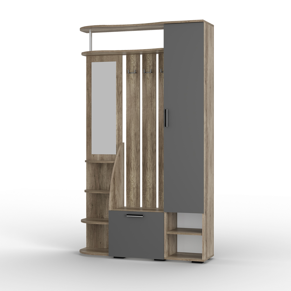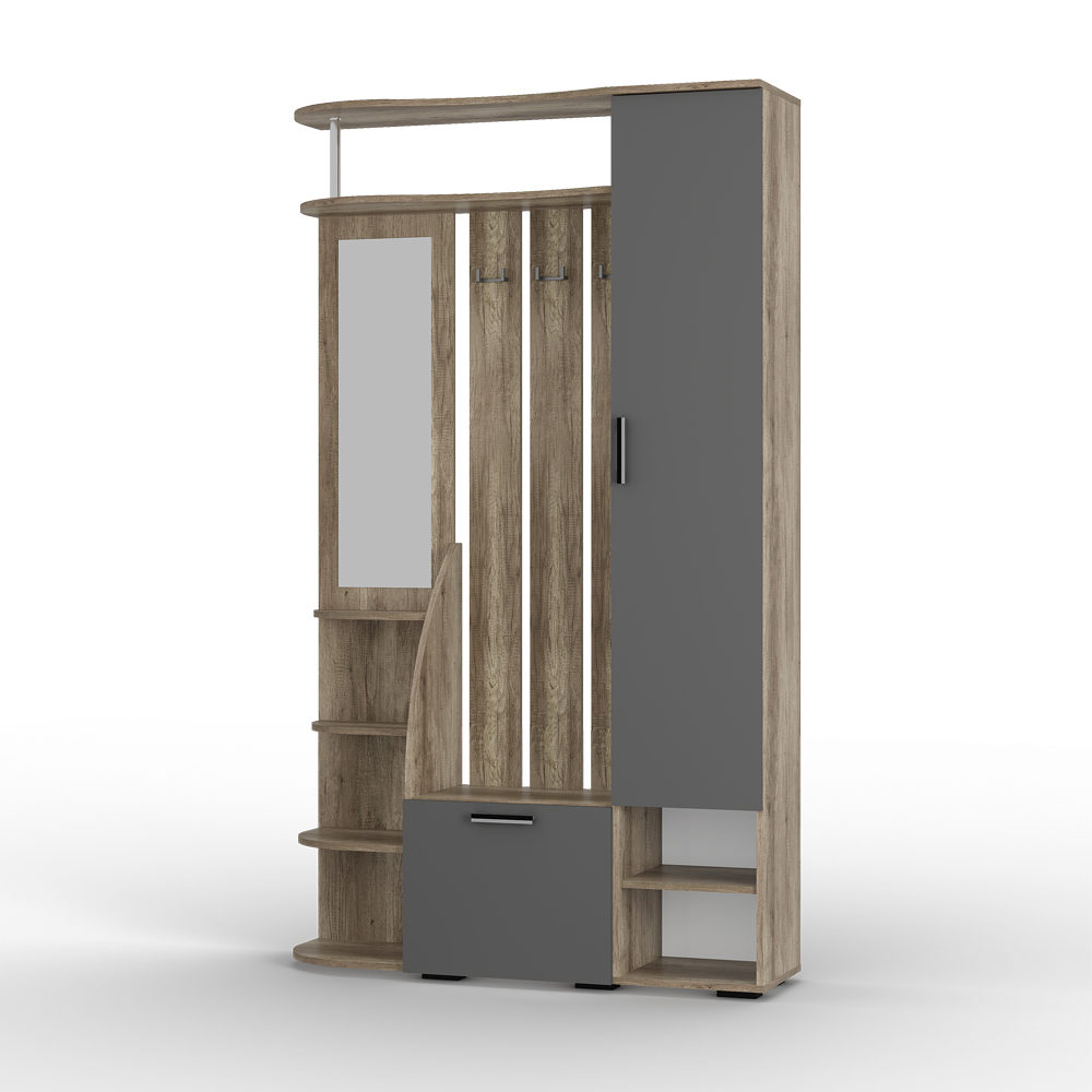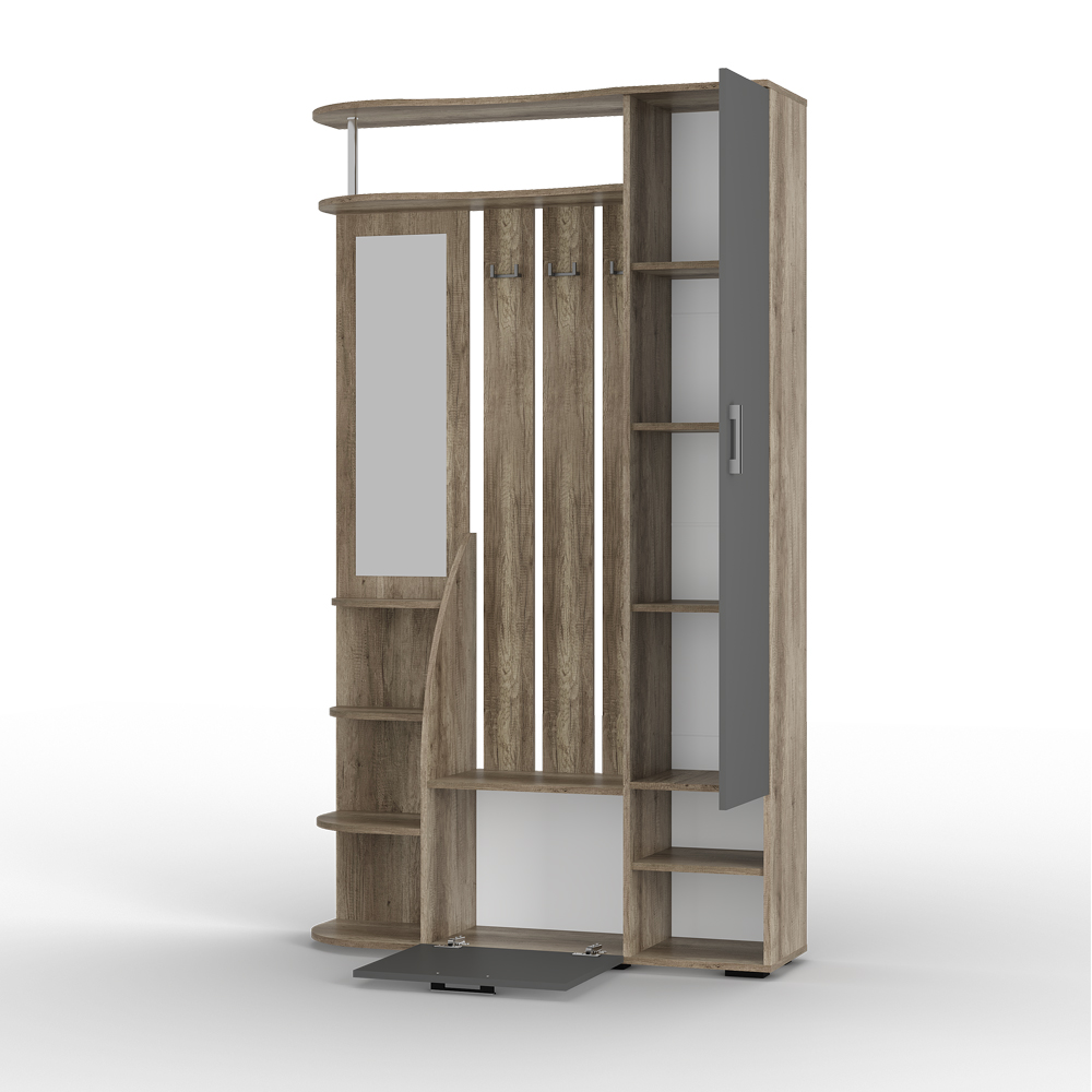 Этот стеллаж со шкафом в прихожую комнату станет отличным элементом для вашего интерьера. Мебель для дома обеспечивает удобное хранение перчаток, шапок, зонтов, сумок и других аксессуаров. Комплект включает шкаф для верхней одежды и настенную тумбу с зеркалом. Закрытые дверцами модули гарантируют порядок в коридоре.