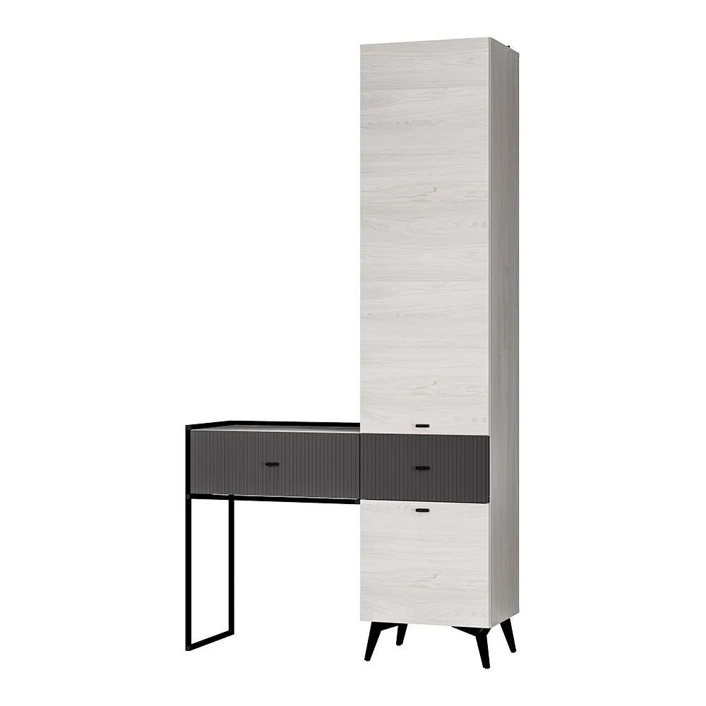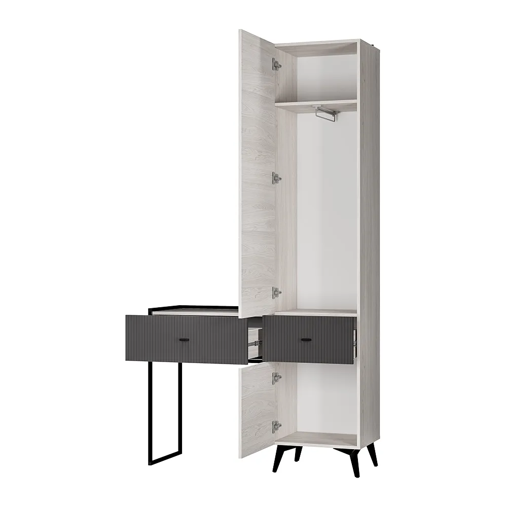 Прихожая «Норд» — это прекрасный образец современной роскоши в дизайне интерьера. Модель состоит из двух основных блоков, переплетающихся друг с другом и создающих единую композицию. Металлические детали не только усиливают конструкцию, но и являются яркими акцентами в дизайне прихожей.