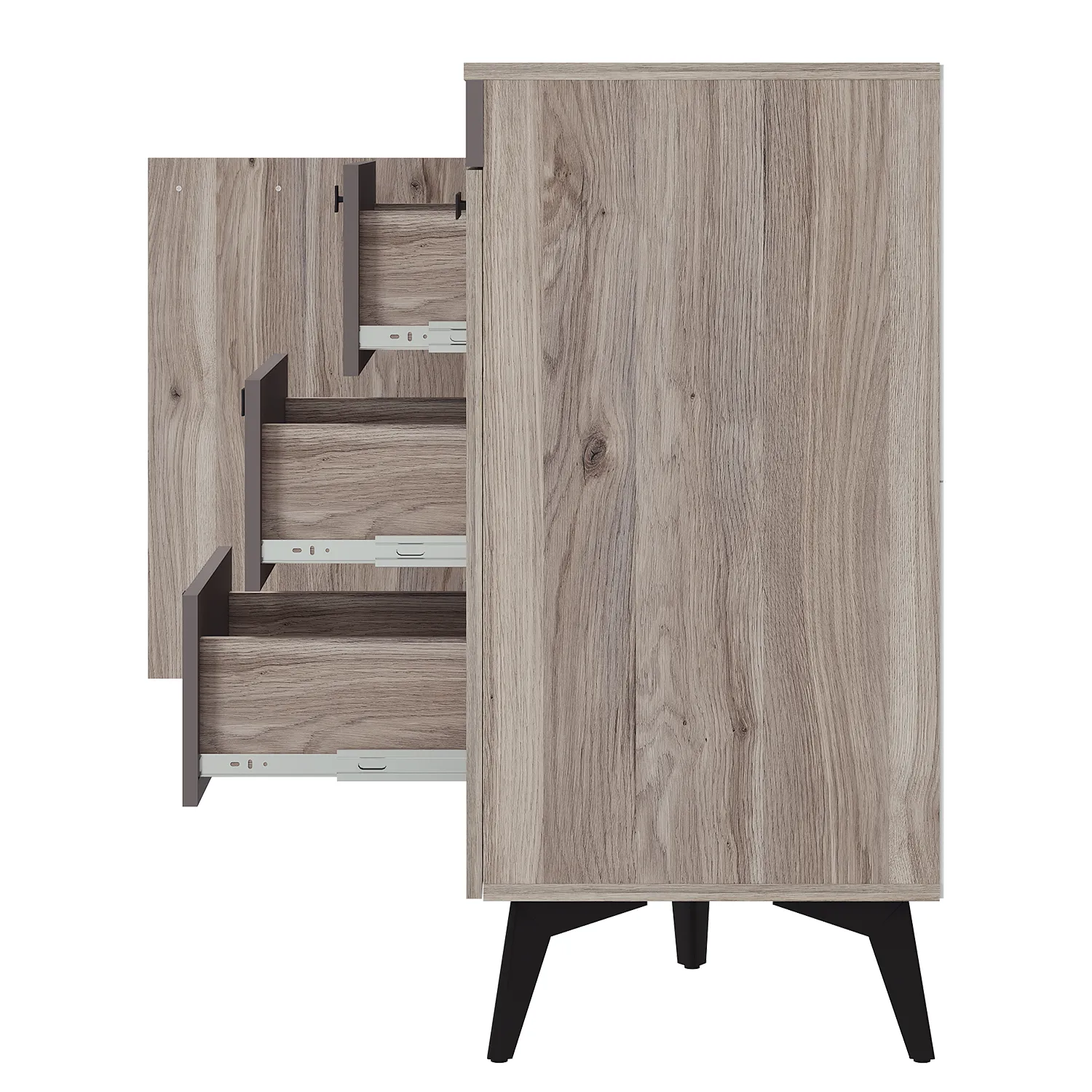 Комод «Кассандра» состоит из трёх вместительных зон: 2 боковые зоны с полками, а центральная состоит из трёх ящиков, в которых удобно хранить постельное бельё и мелочи.