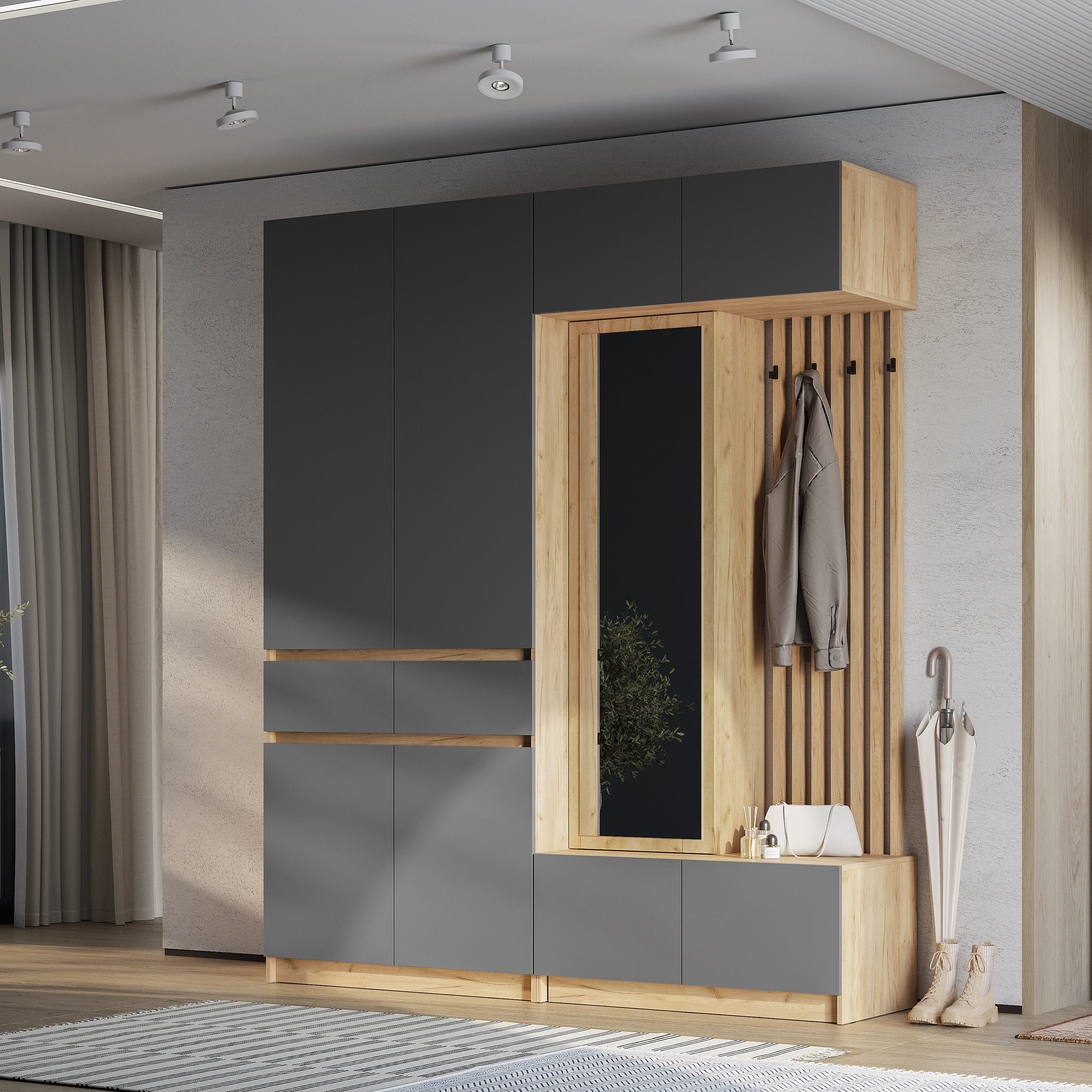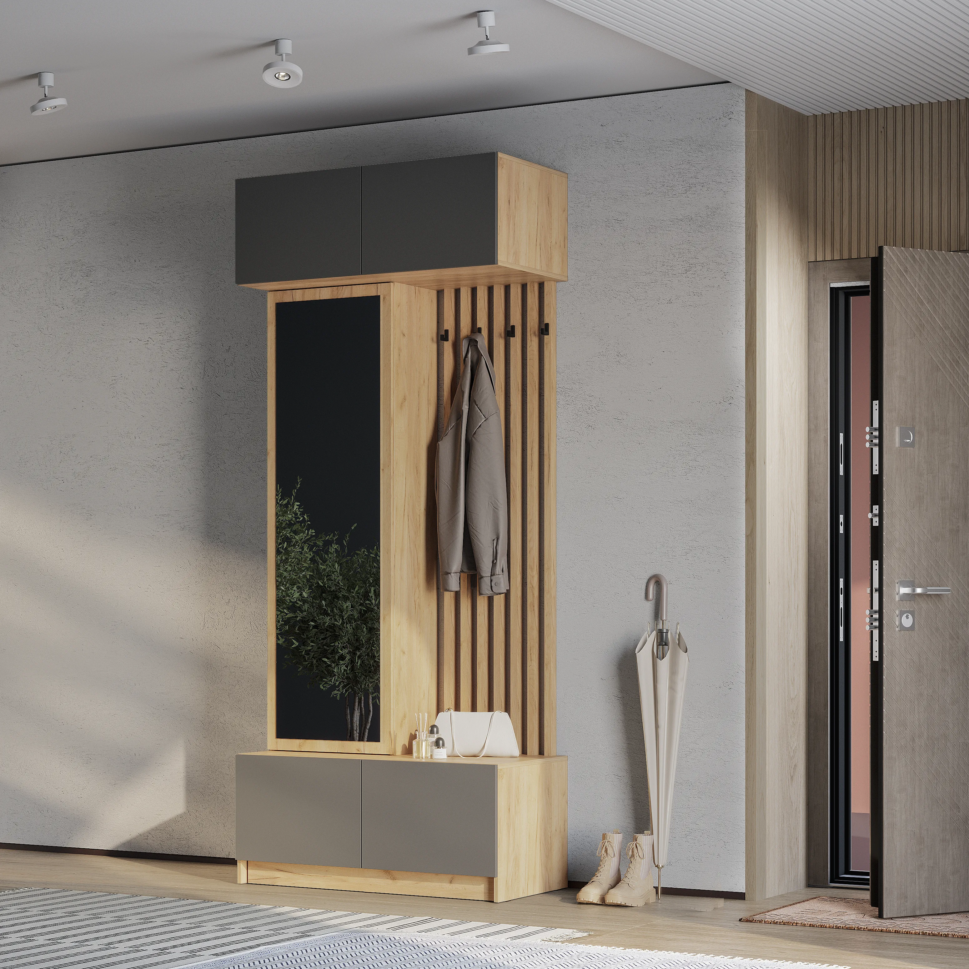 Стильная и компактная прихожая «Багира» – это оптимальное сочетание открытых и закрытых зон для хранения верхней одежды, головных уборов, обуви и аксессуаров.