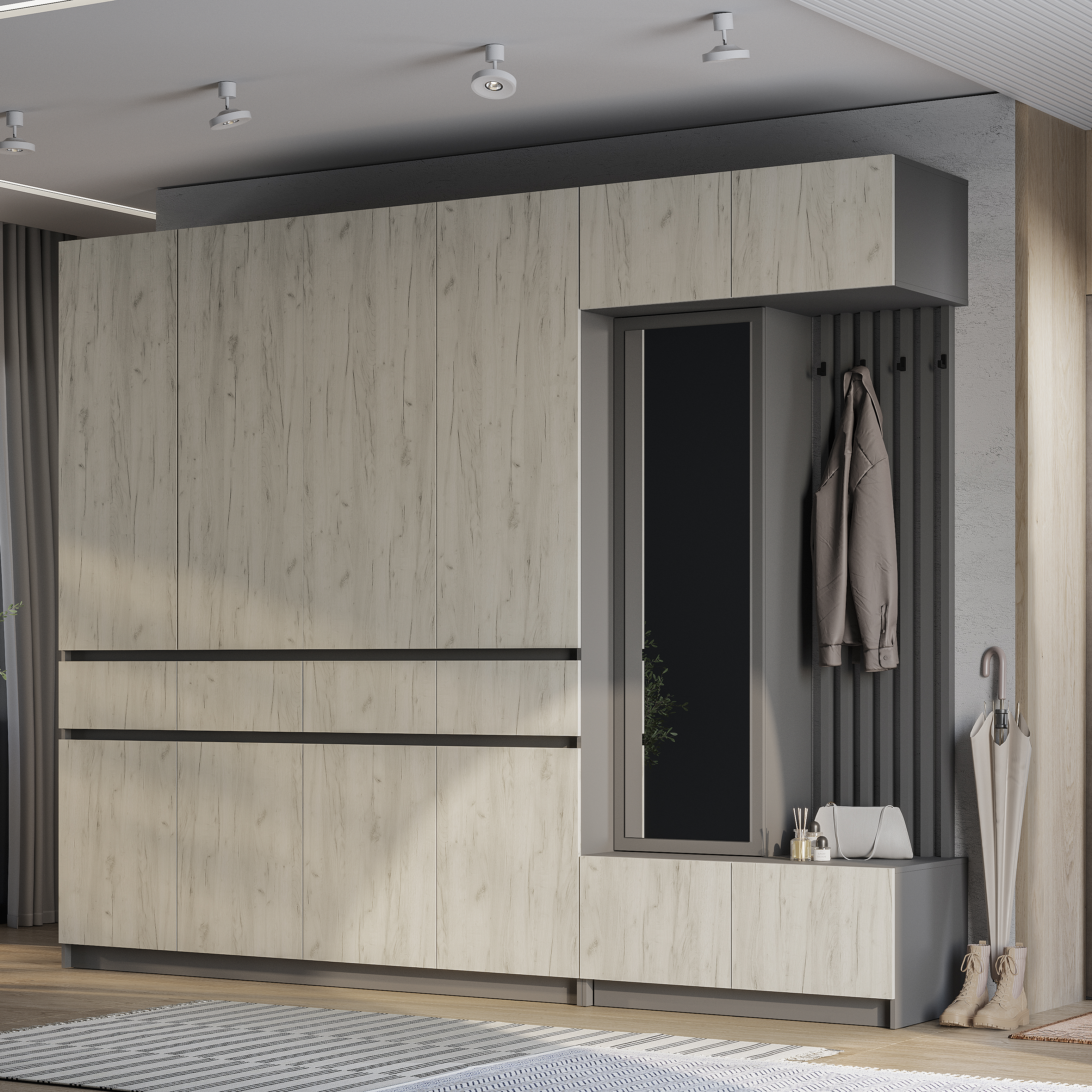 Стильная и компактная прихожая «Багира» – это оптимальное сочетание открытых и закрытых зон для хранения верхней одежды, головных уборов, обуви и аксессуаров.