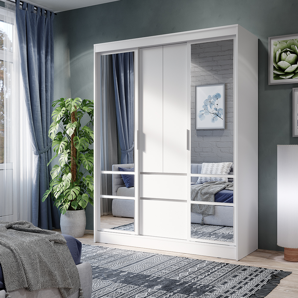Шкаф-купе «Симпл» (ШКК-06) — вместительная и эстетичная модель для тех, кто предпочитает лаконичные интерьерные решения. Шкаф оснащен удобными ящиками и полками, а также пространством для вертикального хранения вещей. Вам не придется покупать большое зеркало, ведь фасад этой модели оснащен зеркалами с еврокромкой в комплекте, которые клеятся на фабрике.
