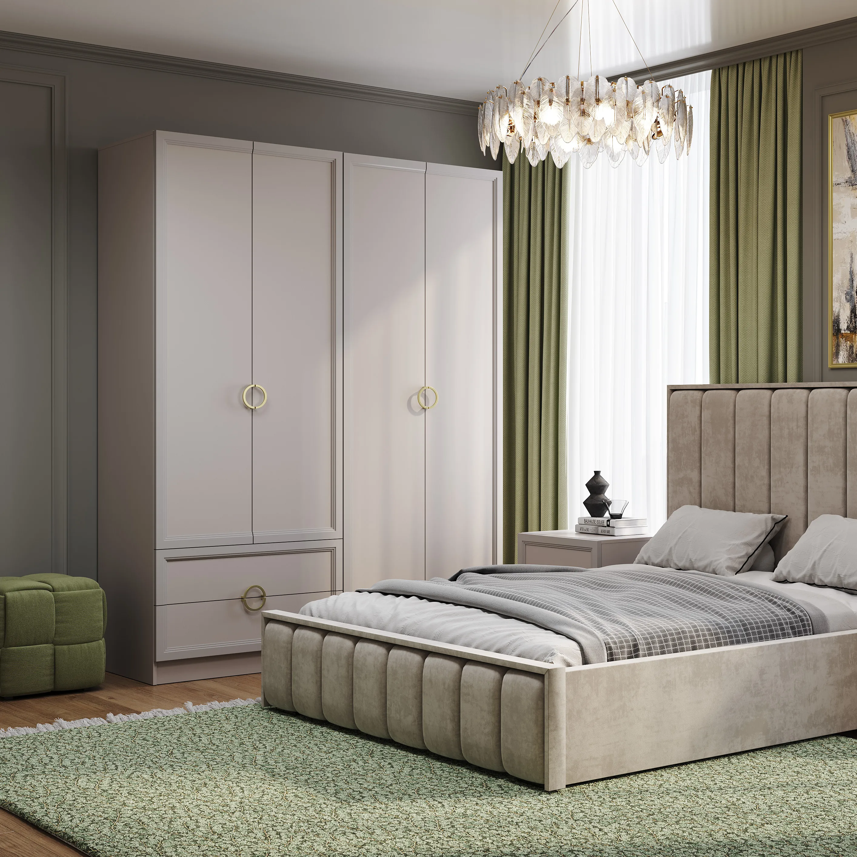 Фасады выполнены из ЛДСП в цвете «кашемир» толщиной 16 мм, а по краям фасады облицованы рамочным профилем из МДФ с рельефной фрезеровкой толщиной 26 мм.