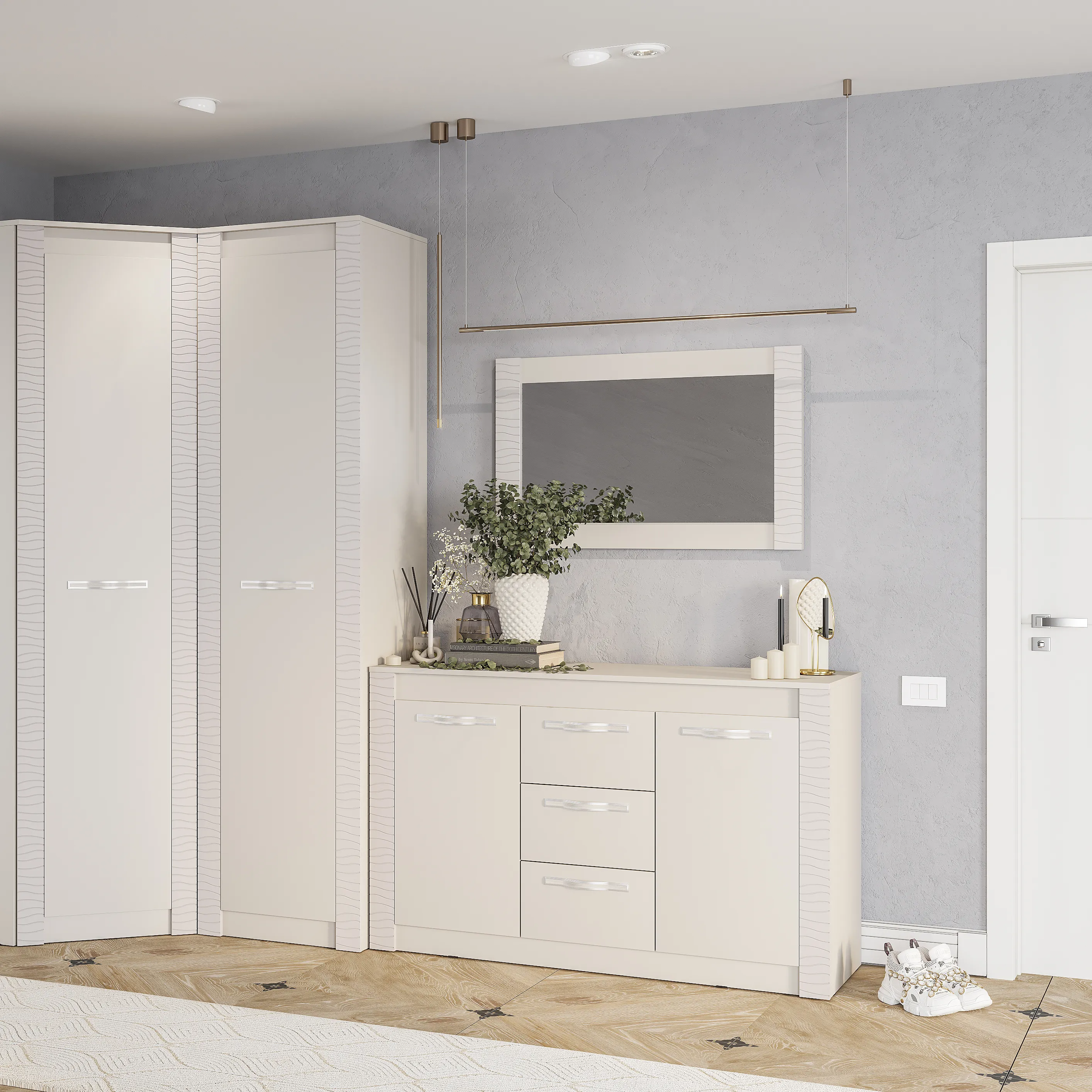 Модульная коллекция «Монако» - это универсальное решение с эргономичным дизайном и функциональностью для современного дома. Фрезеровка с волнообразными узорами на фасадах привлекает внимание. Интерьеры с белыми декорами в 2024 году заменяются на нюдовые тона. Трендовый оттенок «кашемир» позволяет использовать в интерьере теплые и холодные декоры, а также различные варианты цветового решения домашнего текстиля, аксессуаров и других элементов. Мягкий приглушённый оттенок «кашемир» является изысканным выбором для стильного дома и придаёт нотку нежности и уюта.