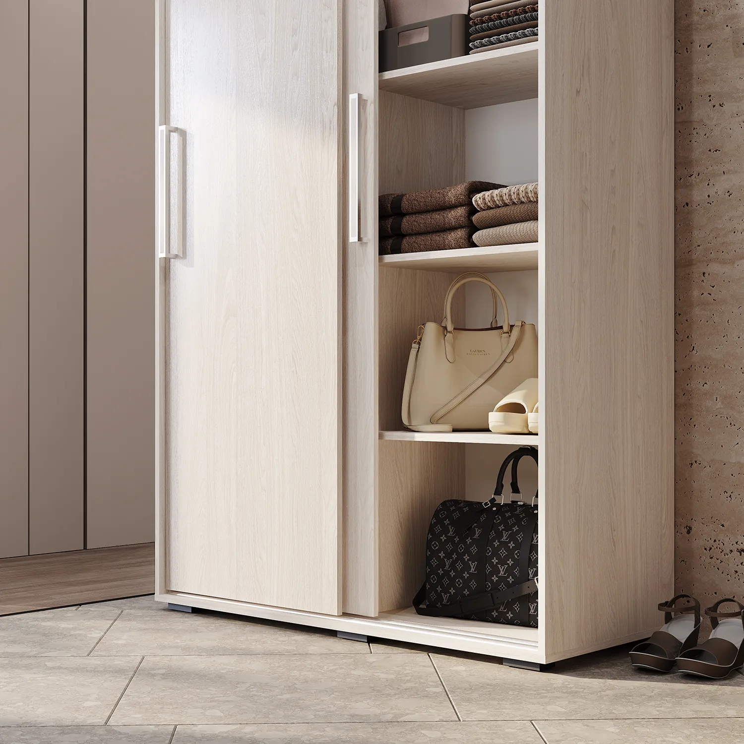 Система организации шкафа и раздвижные двери позволяют легко структурировать место внутри гардеробной.