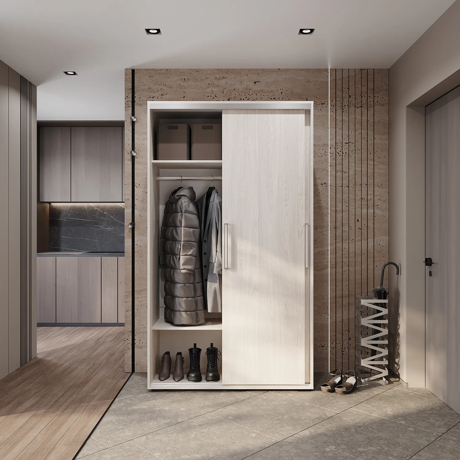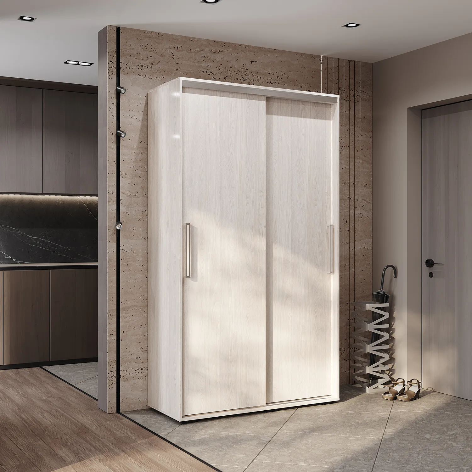 В прихожей или гостиной просторное платяное отделение с вешалкой в виде штанги обеспечит комфортный доступ к верхней одежде и детской обуви.