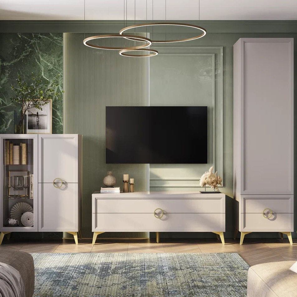 Фасады выполнены из ЛДСП в цвете «кашемир» толщиной 16 мм, а по краям фасады облицованы рамочным профилем из МДФ с рельефной фрезеровкой толщиной 26 мм.