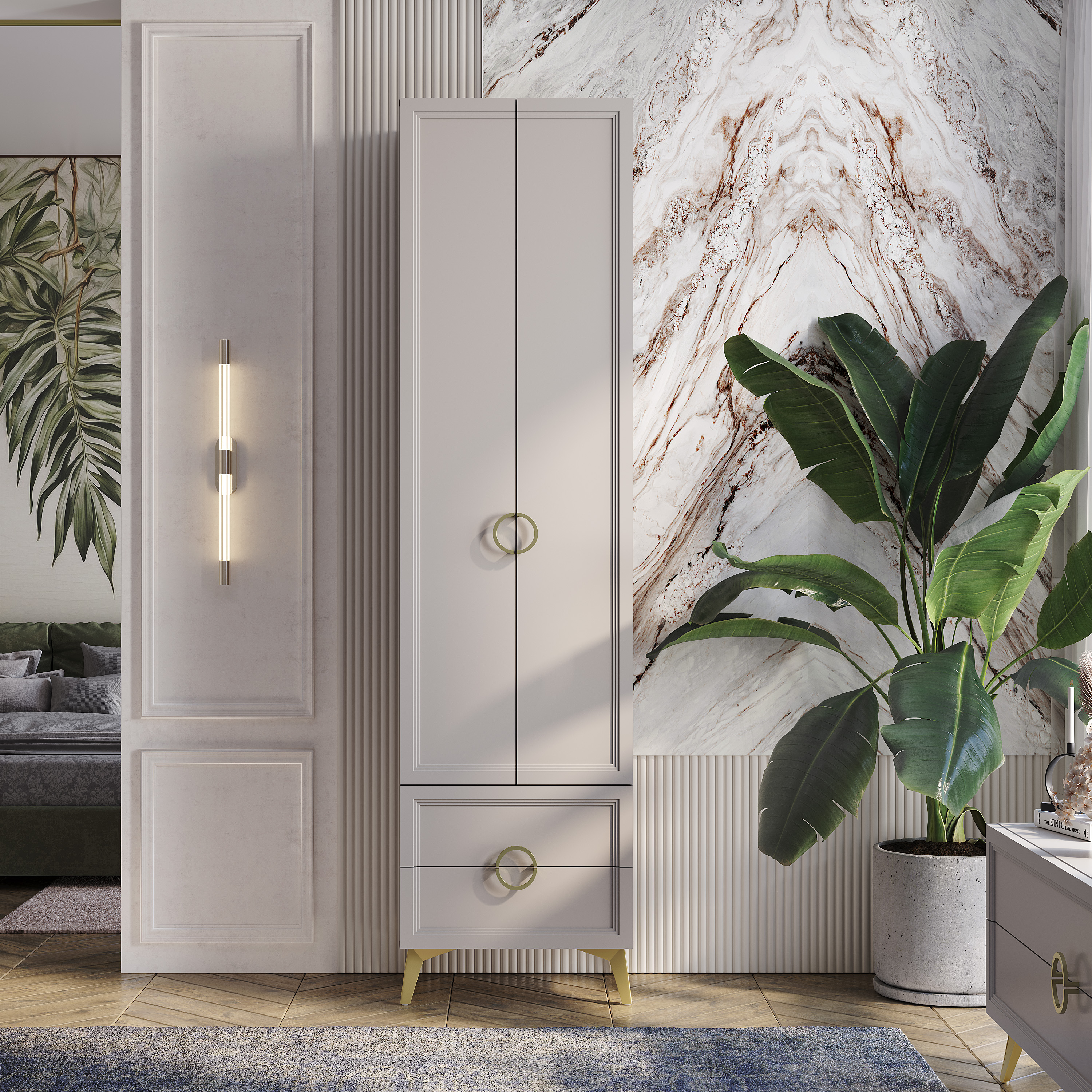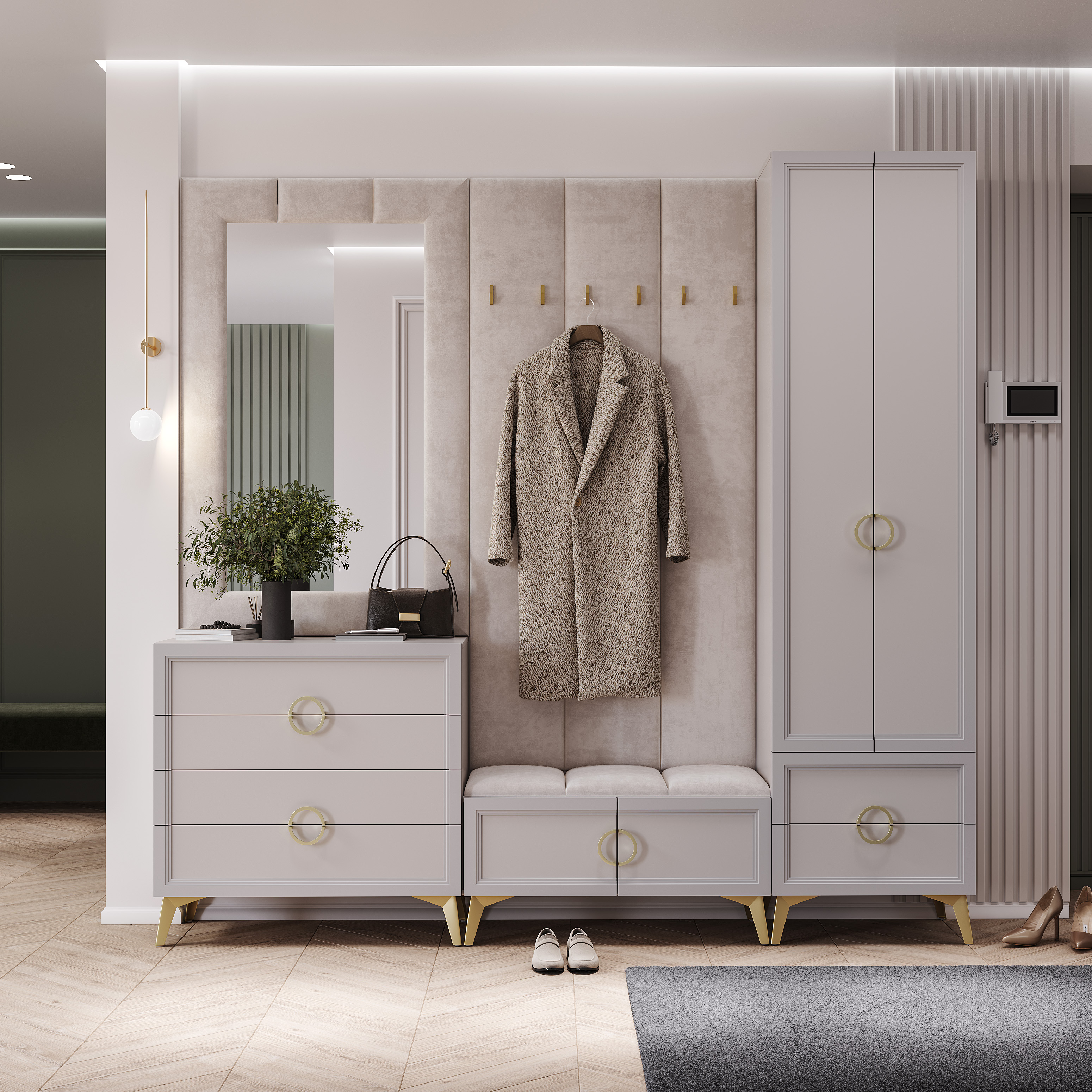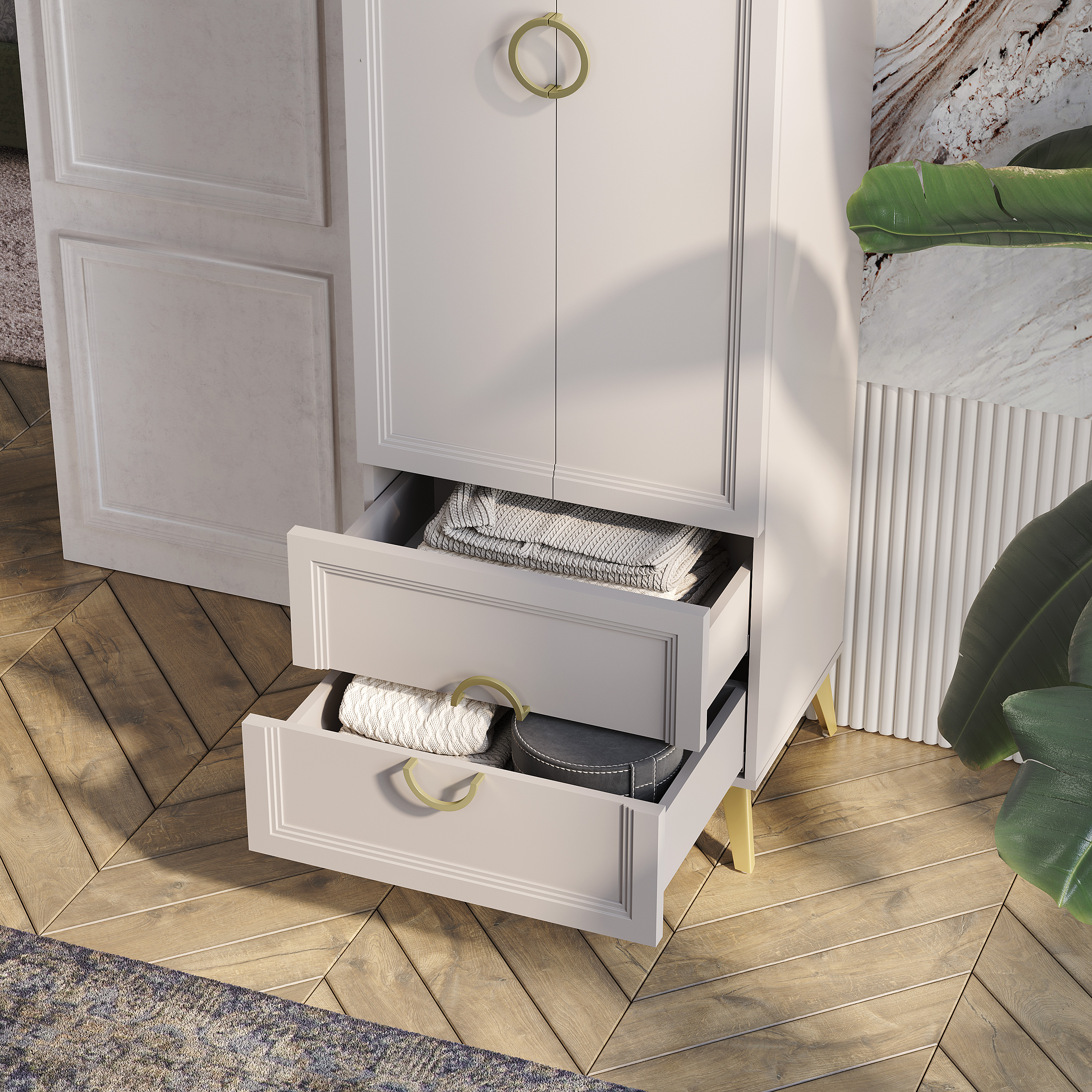 Фасады выполнены из ЛДСП в цвете «кашемир» толщиной 16 мм, а по краям фасады облицованы рамочным профилем из МДФ с рельефной фрезеровкой толщиной 26 мм.