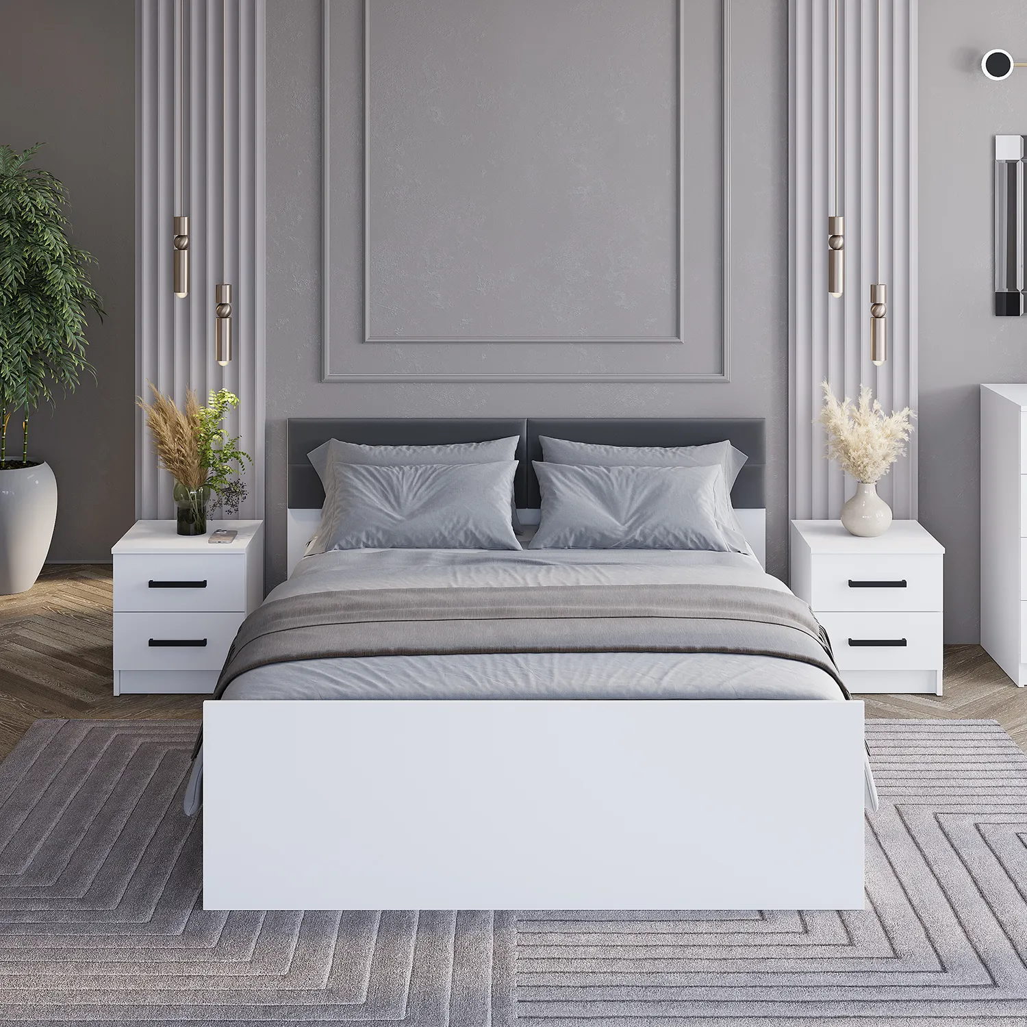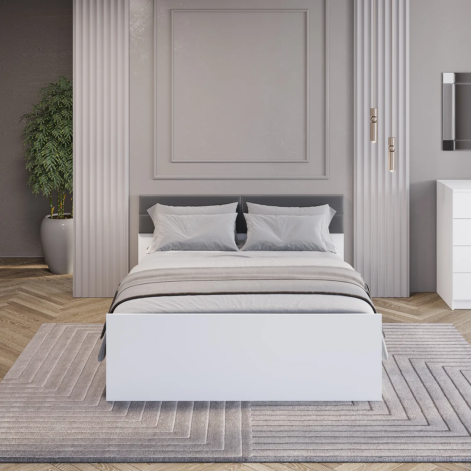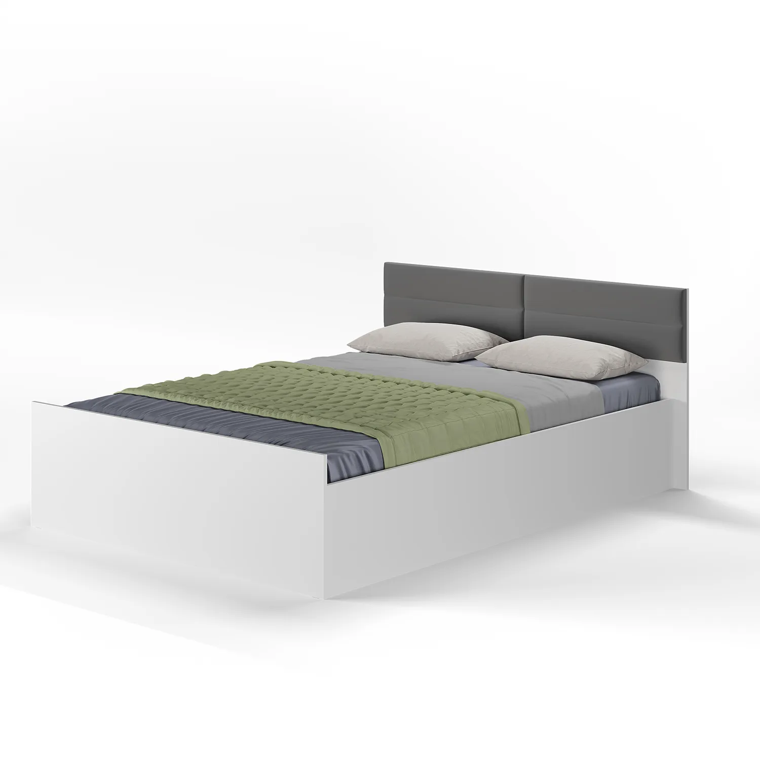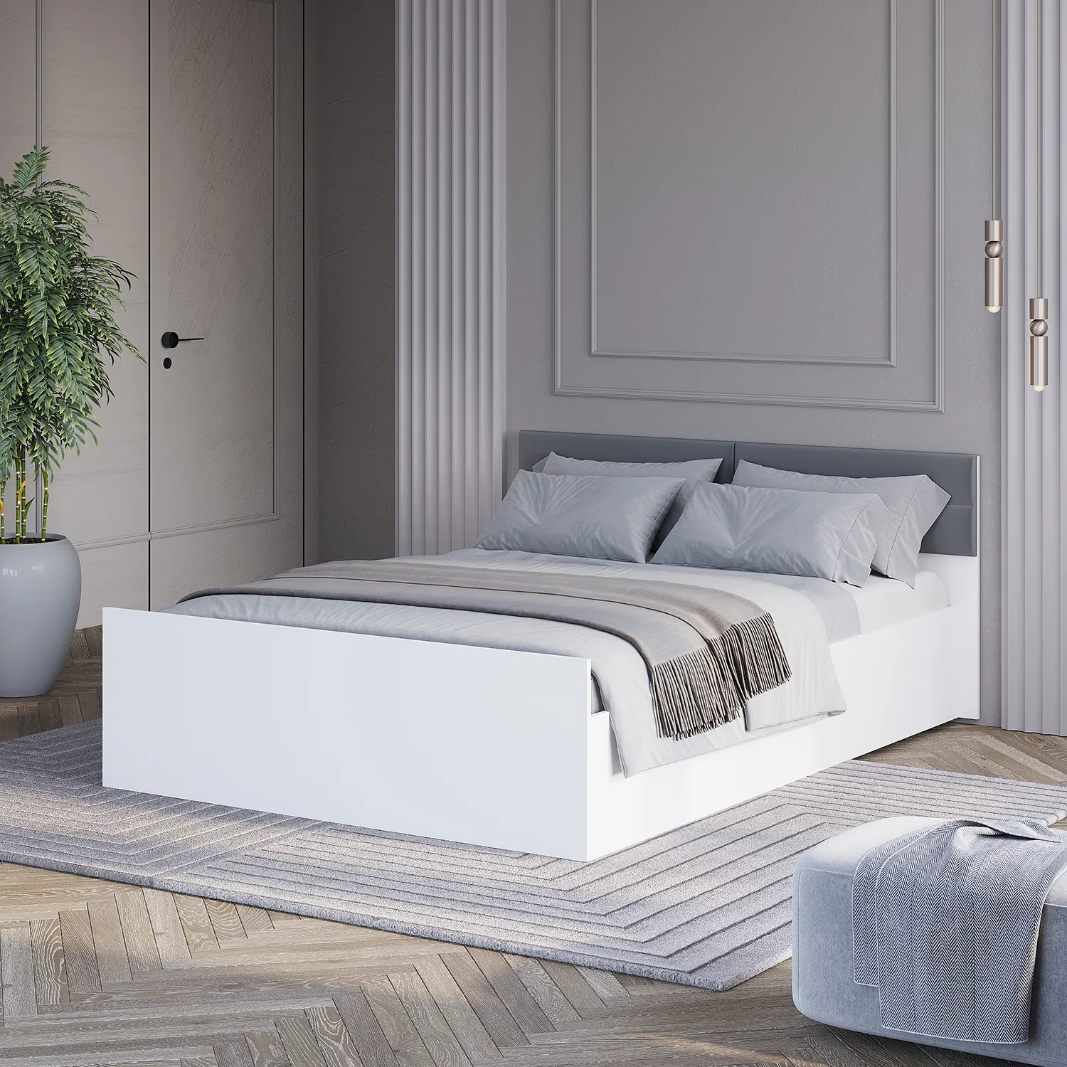 Широкая кровать в минималистичном стиле – это модель для ценителей простого и понятного функционала. Белая двуспальная кровать "Фьюжн" размером 140*200 с мягким изголовьем из ткани велюр цвете графит - идеальный выбор для создания уютной и стильной обстановки в вашей спальне.