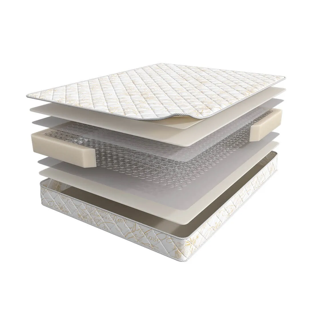 Основу матраса составляет пружинный блок Bonnel. Зависимые пружины объединены прочной проволокой. Блок имеет пониженные анатомические свойства. Обе стороны проложены адаптивной ортопедической пеной. Это недорогой современный наполнитель для матрасов. Пена имеет пористую структуру, что обеспечивает прекрасную вентиляцию. Эластичный, упругий, долговечный материал, по своим потребительским свойствам максимально приближен к натуральному латексу, при этом является полностью гипоаллергенным.