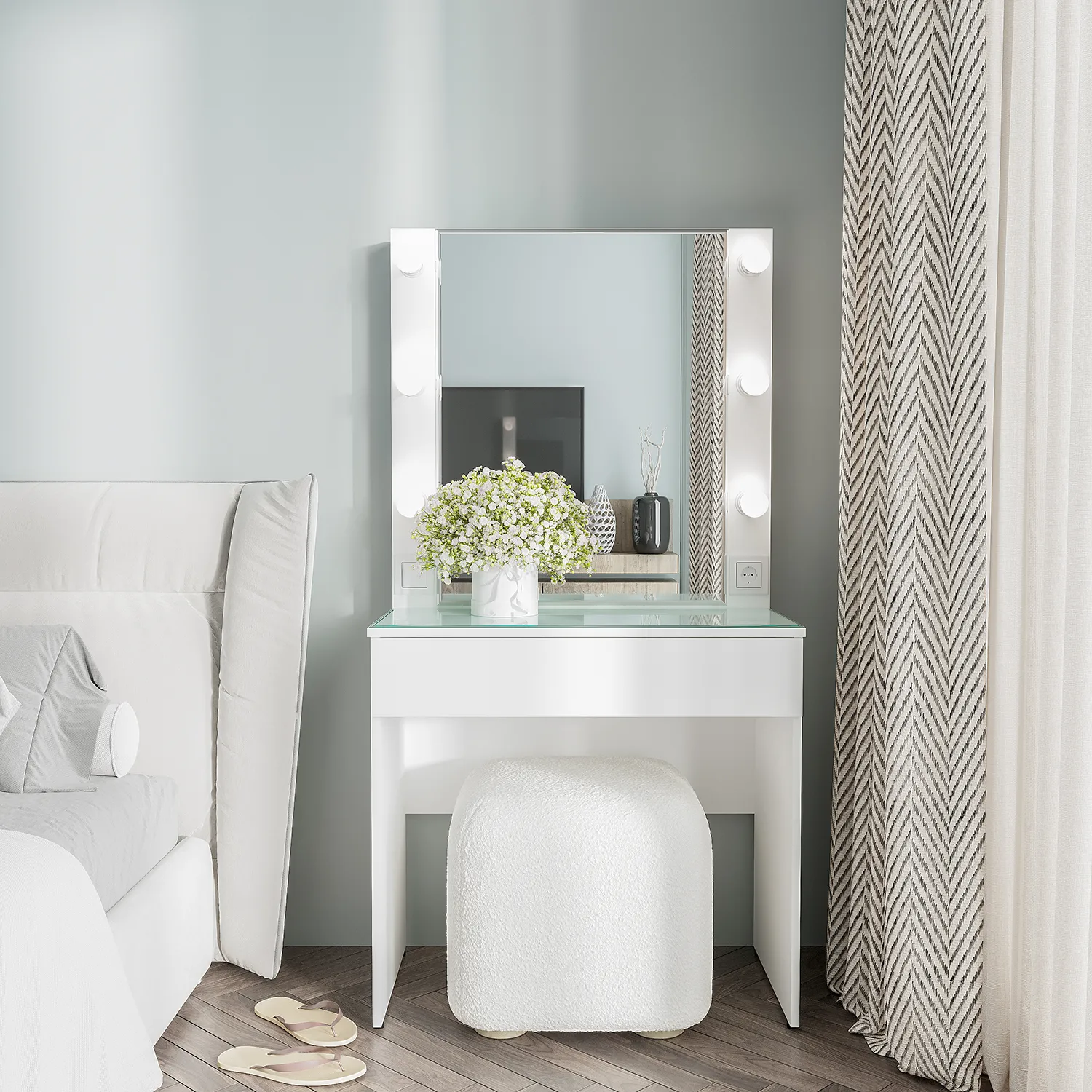 Создайте идеальное пространство для ухода за собой с нашим стильным и функциональным туалетным столом "Мемори"! Этот белый макияжный столик с ящиками станет настоящим украшением вашего интерьера и поможет организовать хранение косметики и аксессуаров.