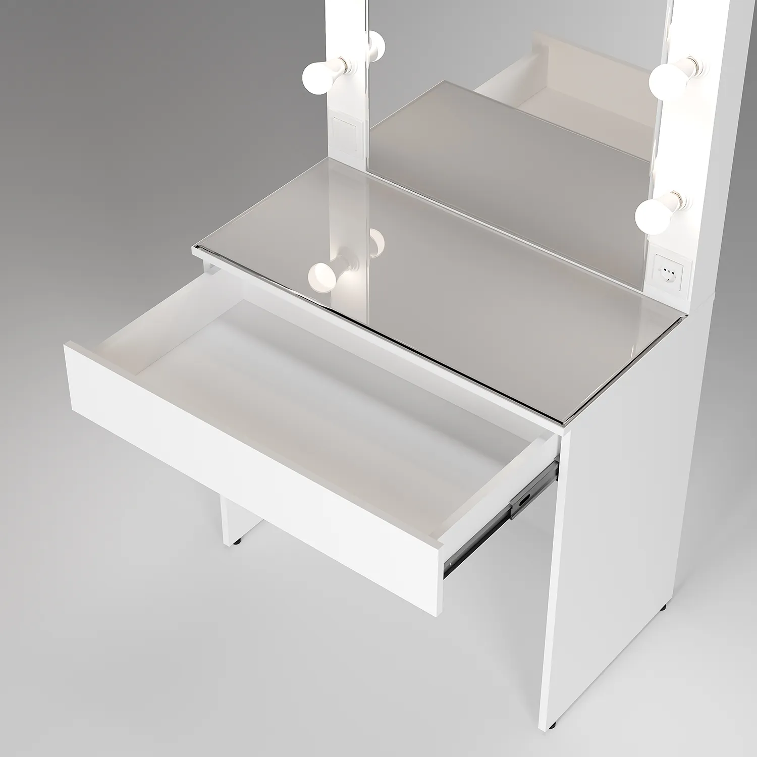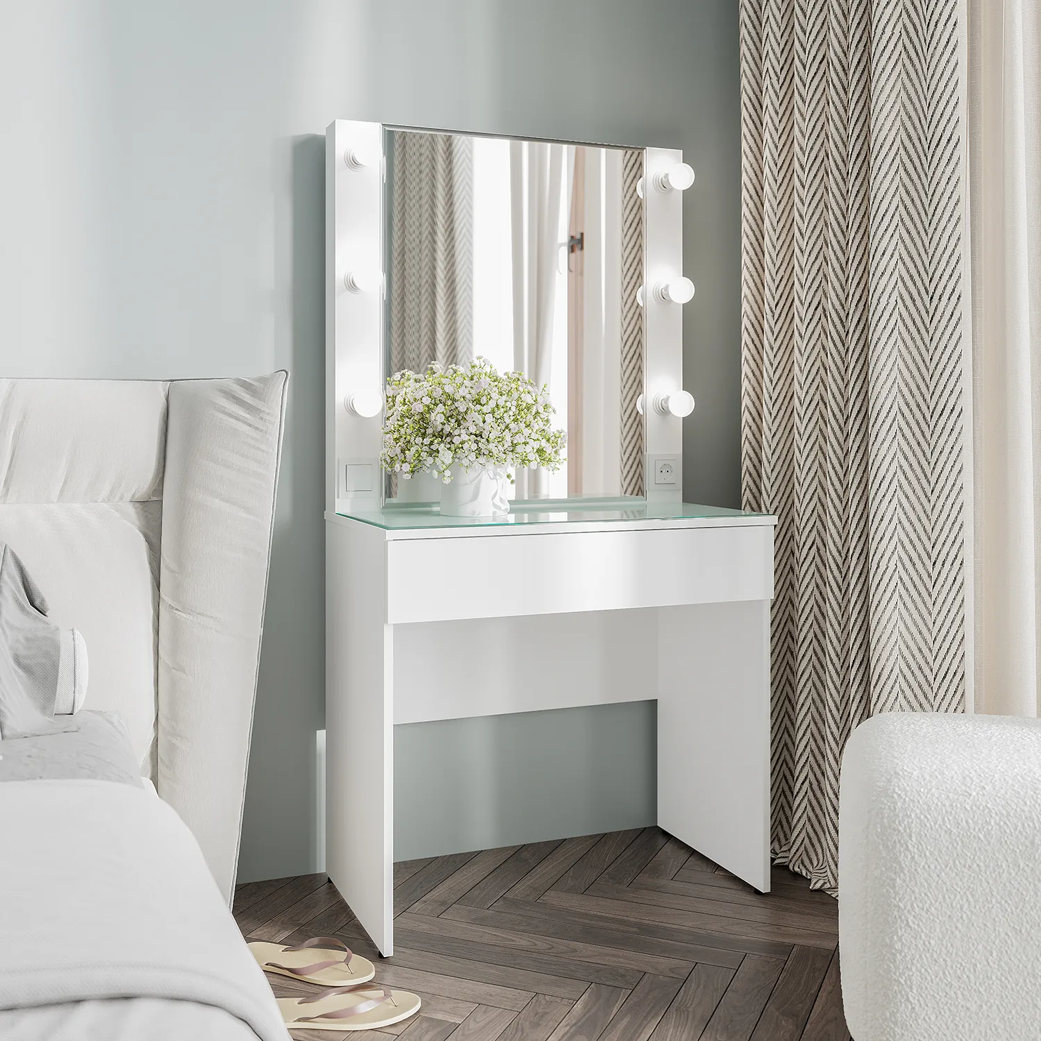 Встроенная розетка облегчит процесс сушки и завивки волос. Сидя на пуфе перед бьюти-трюмо, вы сможете легко создавать потрясающие прически каждый день!