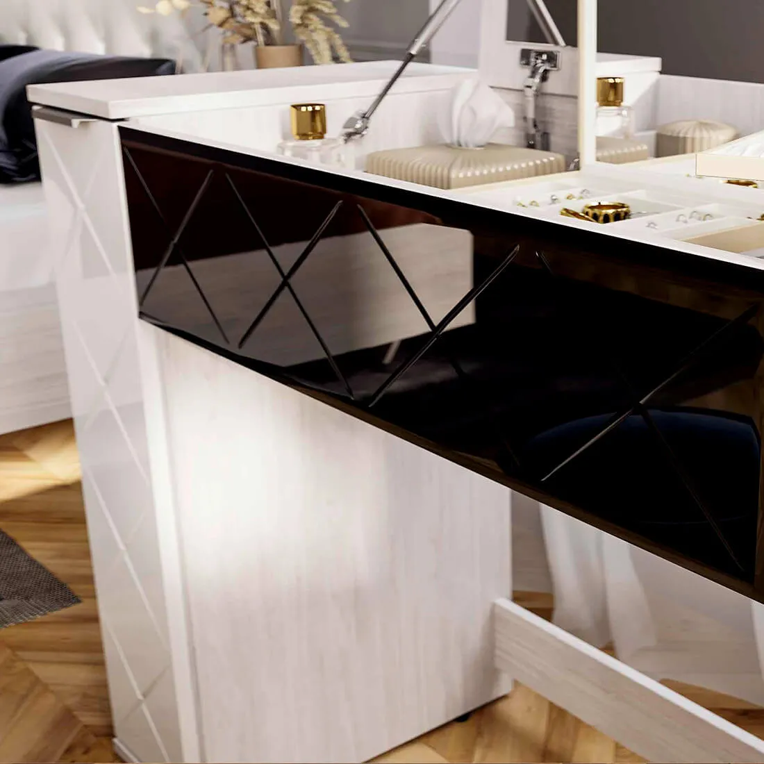 белые глянцевые фасады с уникальной вставкой из стекла лакобель чёрного цвета с фацетом добавляют моделям особые нотки роскоши и шарма.