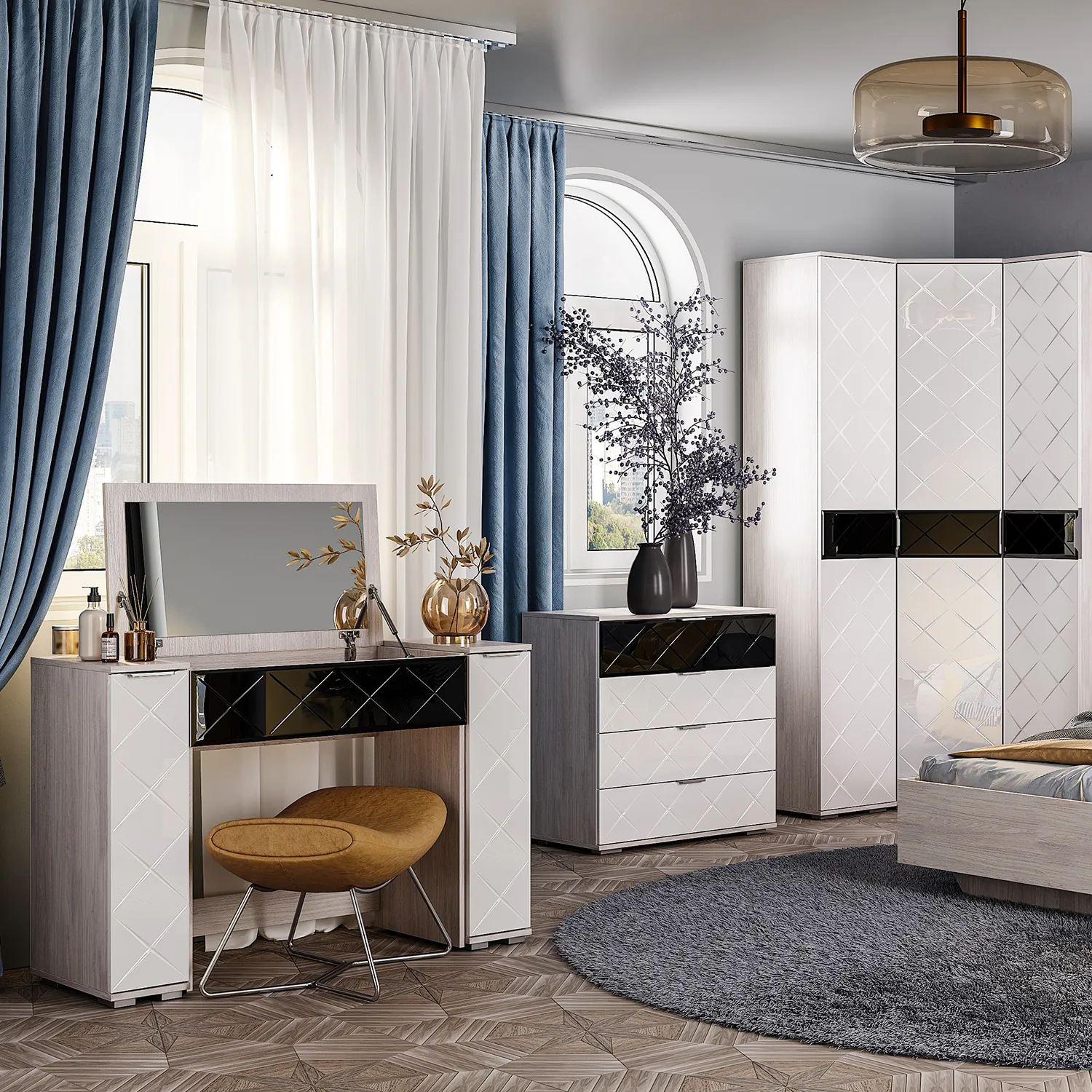 Модульная спальня «Кимберли» - это современная элегантная мебель с остроконечной фрезеровкой фасадов: