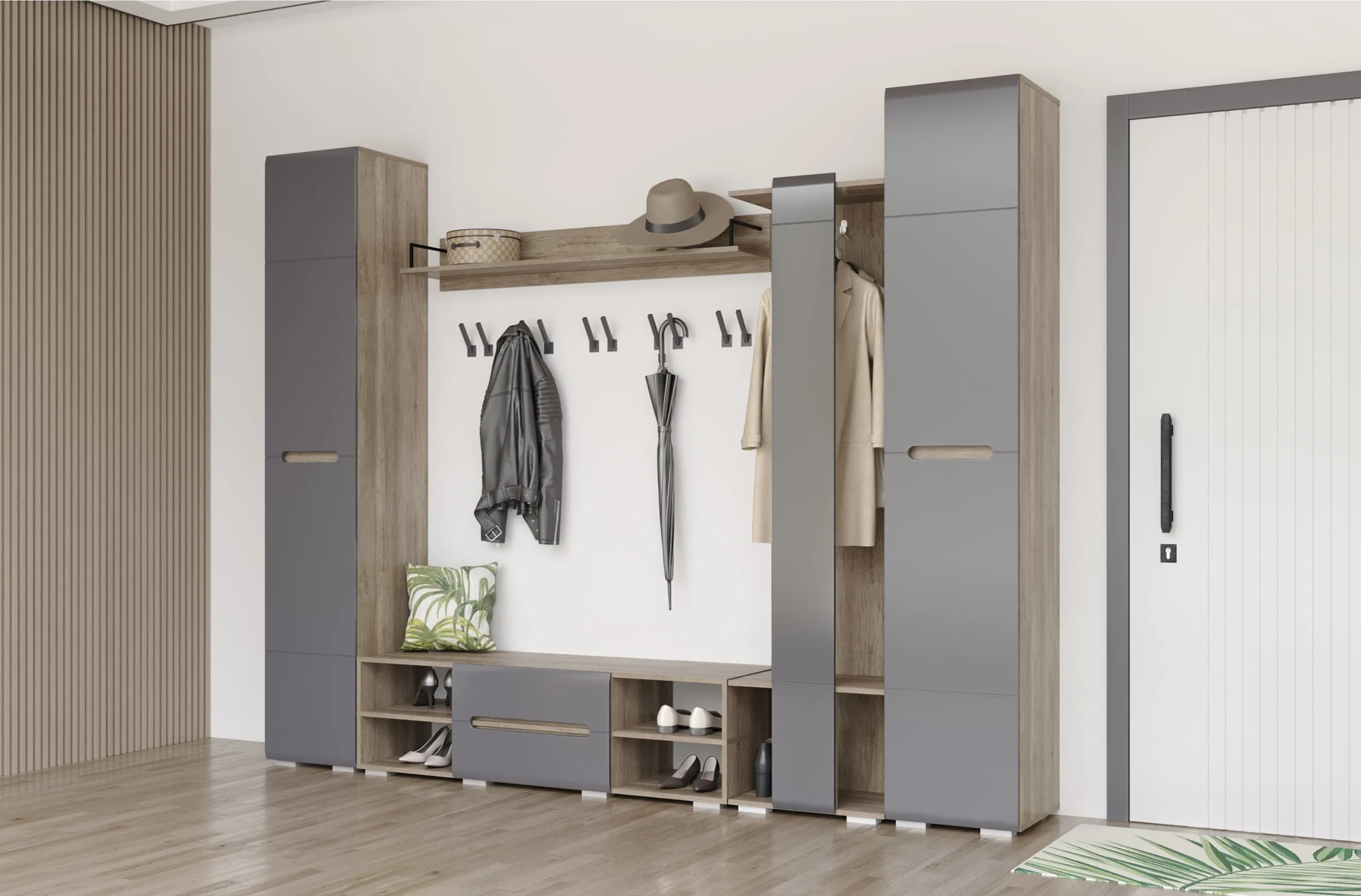 Прихожая «Наоми» в благородном оттенке «графит» — правильный выбор для современного интерьера. Эта коллекция отличается стильными деталями и функциональностью. «Наоми» — это настоящий хит в каталоге «Семьи Мебелони». Фасады прихожей выполнены с уникальной фрезеровкой с реалистичным декором дубового спила.