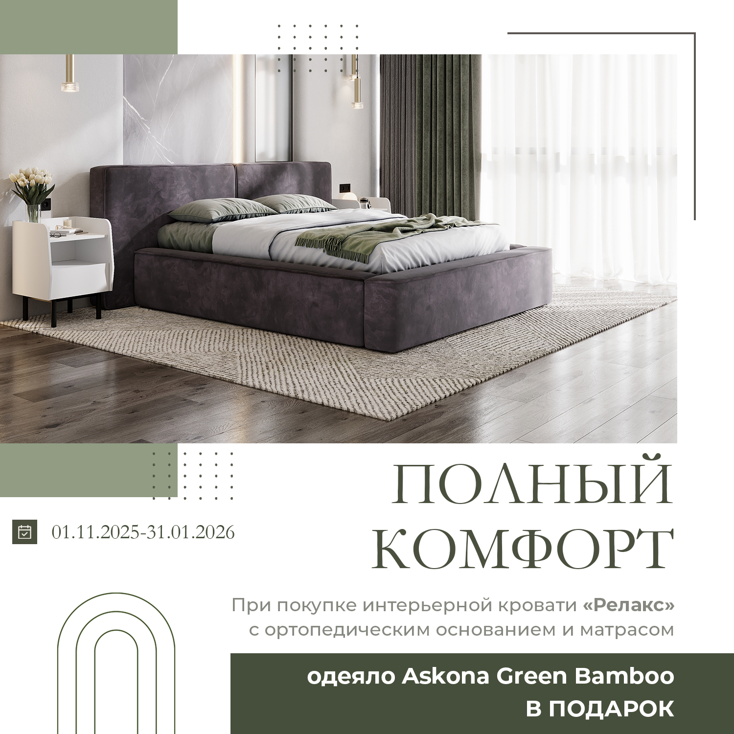 При покупке интерьерной кровати "Релакс" с ортопедическим основанием и матрасом одеяло Ascona Green Bamboo - в ПОДАРОК!